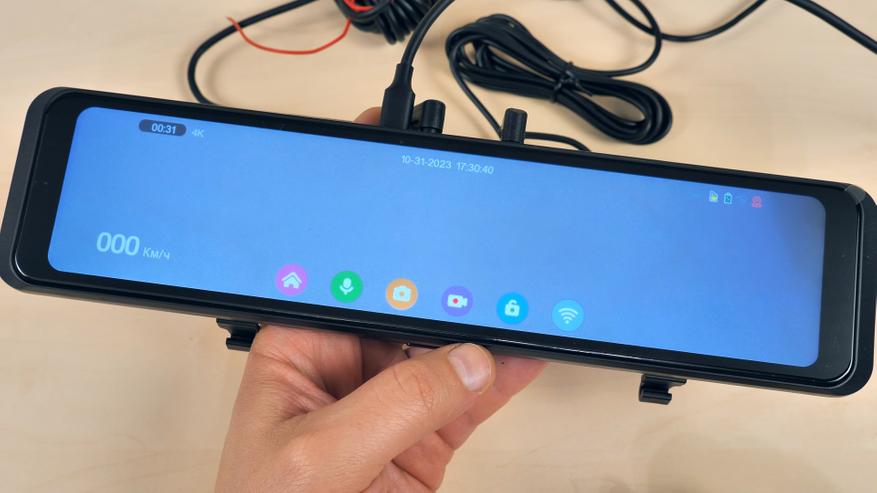 Зеркало имеет классический интерфейс, на главном экране отображаются: текущая скорость; разрешение записи; время записи; дата; уровень заряда; состояние Wi-Fi и GPS; навигационные кнопки управления.
