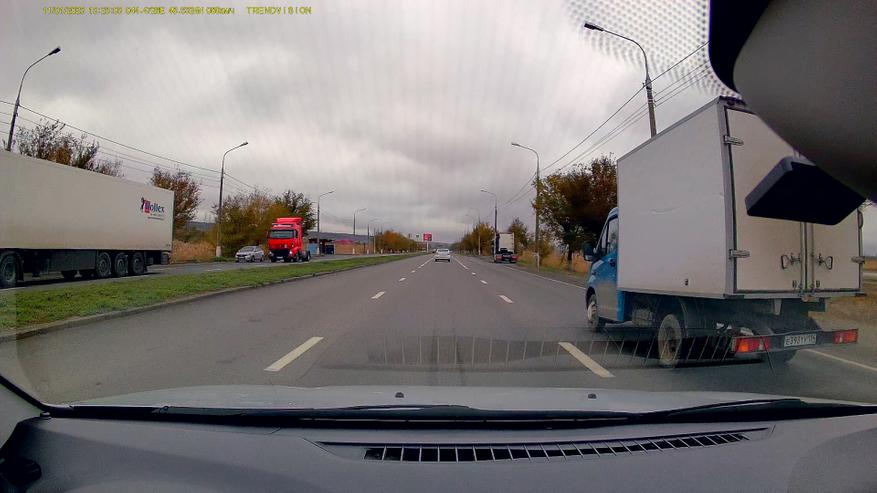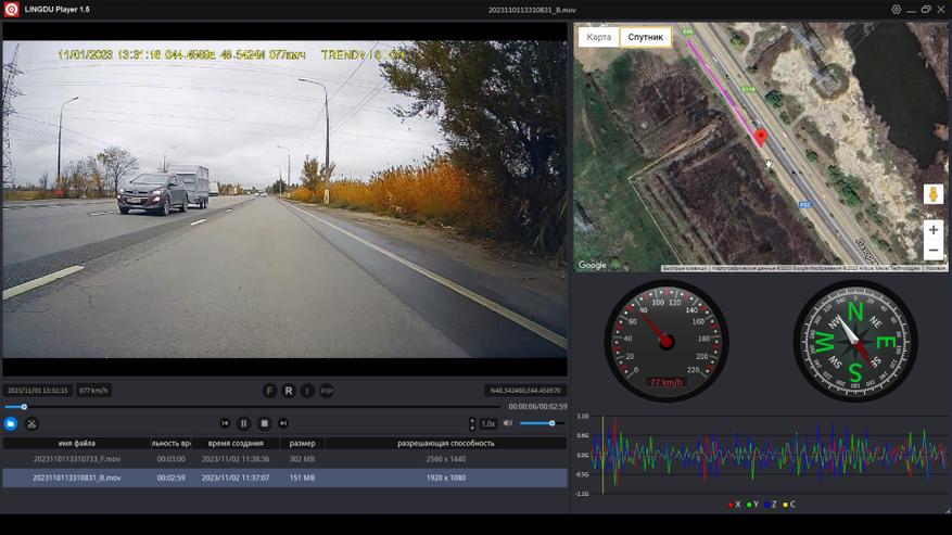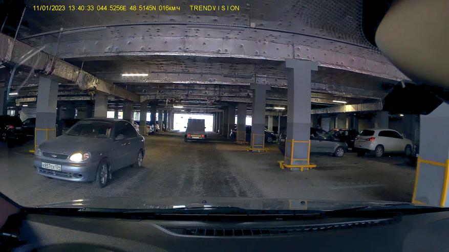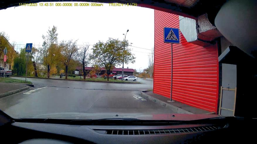 Регистратор пишет видео одновременно с обеих камер, регистратор видит что происходит спереди и позади автомобиля. Угол обзора составляет 150° на передней камере и 140° на задней, у регистратора минимальные слепые зоны. Погода в день тестирования была пасмурной, но для теста это даже в плюс, так как именно в такую погоду многие регистраторы имеют тёмную картинку, поскольку низкая облачность сильно рассеивает свет и они сдвигают экспозицию. Тут же общая картинка мрачная из-за погоды, но не является тёмной, даже в таких условиях регистратор справляется хорошо и выдаёт адекватную картинку. Также видно, что на записях отображаются дата, время, координаты текущего положения автомобиля и скорость в данный конкретный момент, всё это благодаря выносной GPS антенне.