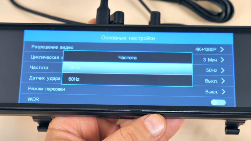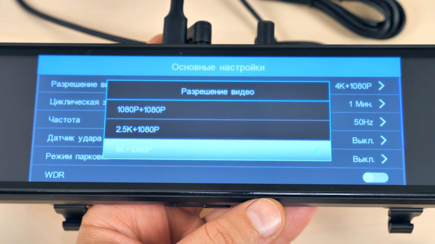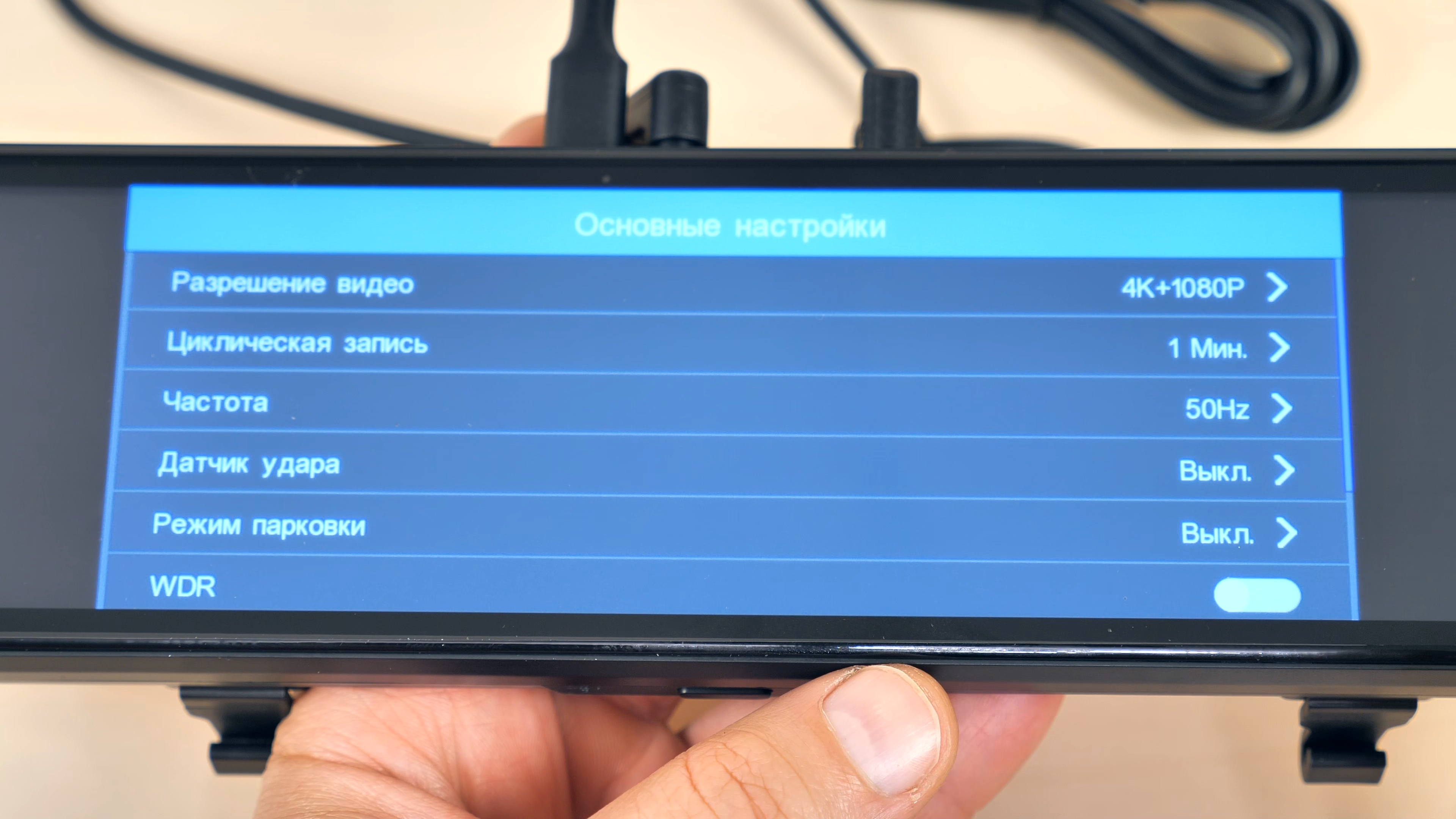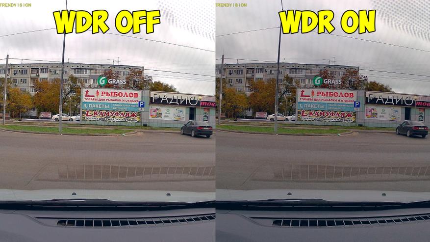 Также в настройках можно включить/выключить функцию WDR. Данная функция призвана избавить записи от засветов на ярких участках и от черноты в тёмных участках кадра. На деле функция работает, но как кажется работает не совсем так, как должна, по факту просто идёт корректировка экспозиции — видно, что засветов по яркому небу стало меньше, тучи видны более разборчиво, то есть от засветов явно избавились, но и тёмные участки кадра не стали светлее, а стали наоборот темнее, это явно доказывает, что настоящей функции WDR у зеркала нет, а идёт корректировка экспозиции.