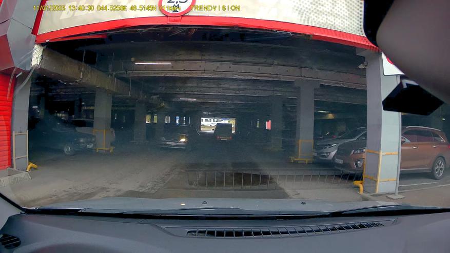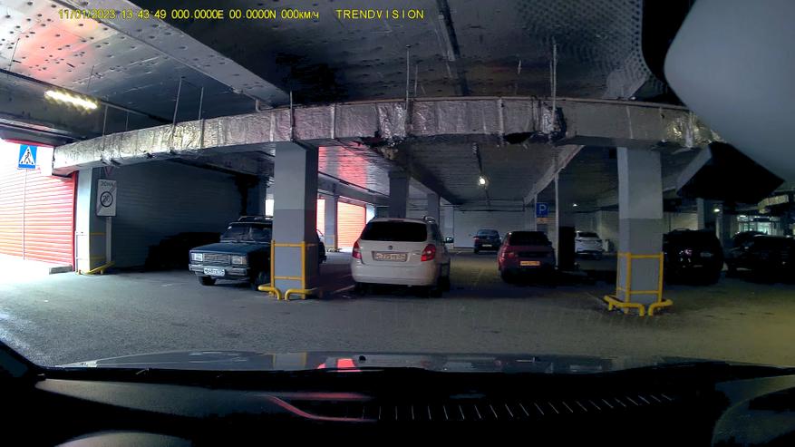 Наличие задней камеры у регистратора позволяет использовать его как парктроник, при включении задней передачи зеркало автоматически переключается на поток задней камеры и позволяет водителю быстро, а главное безопасно двигаться задним ходом, например, на парковке. На этой же мало освещённой парковке камера показала себя с хорошей стороны в плане качества картинки, видимость хорошая, яркости хватает, детализация в норме.