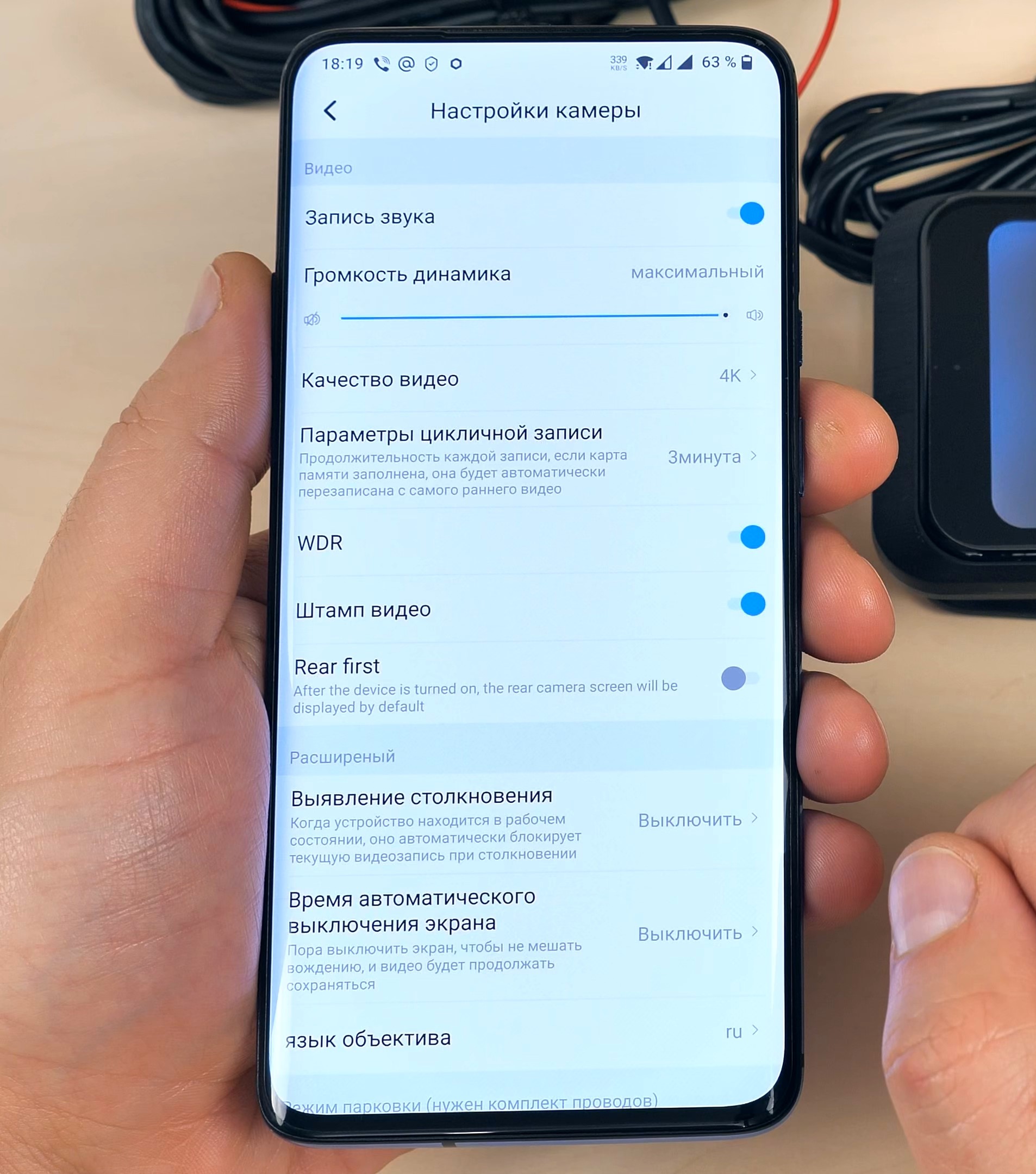 Настроек немного, но самые основные присутствуют: можно включить/выключить запись звука; отрегулировать громкость внешнего динамика; выбрать разрешение съёмки; активировать основные функции; но главное тут можно включить заднюю камеру по умолчанию, этой функции почему-то нет в настройках самого регистратора.