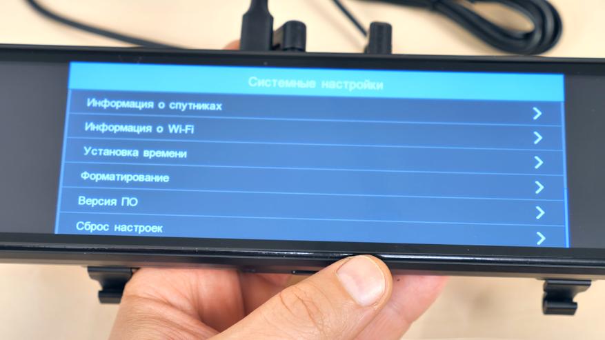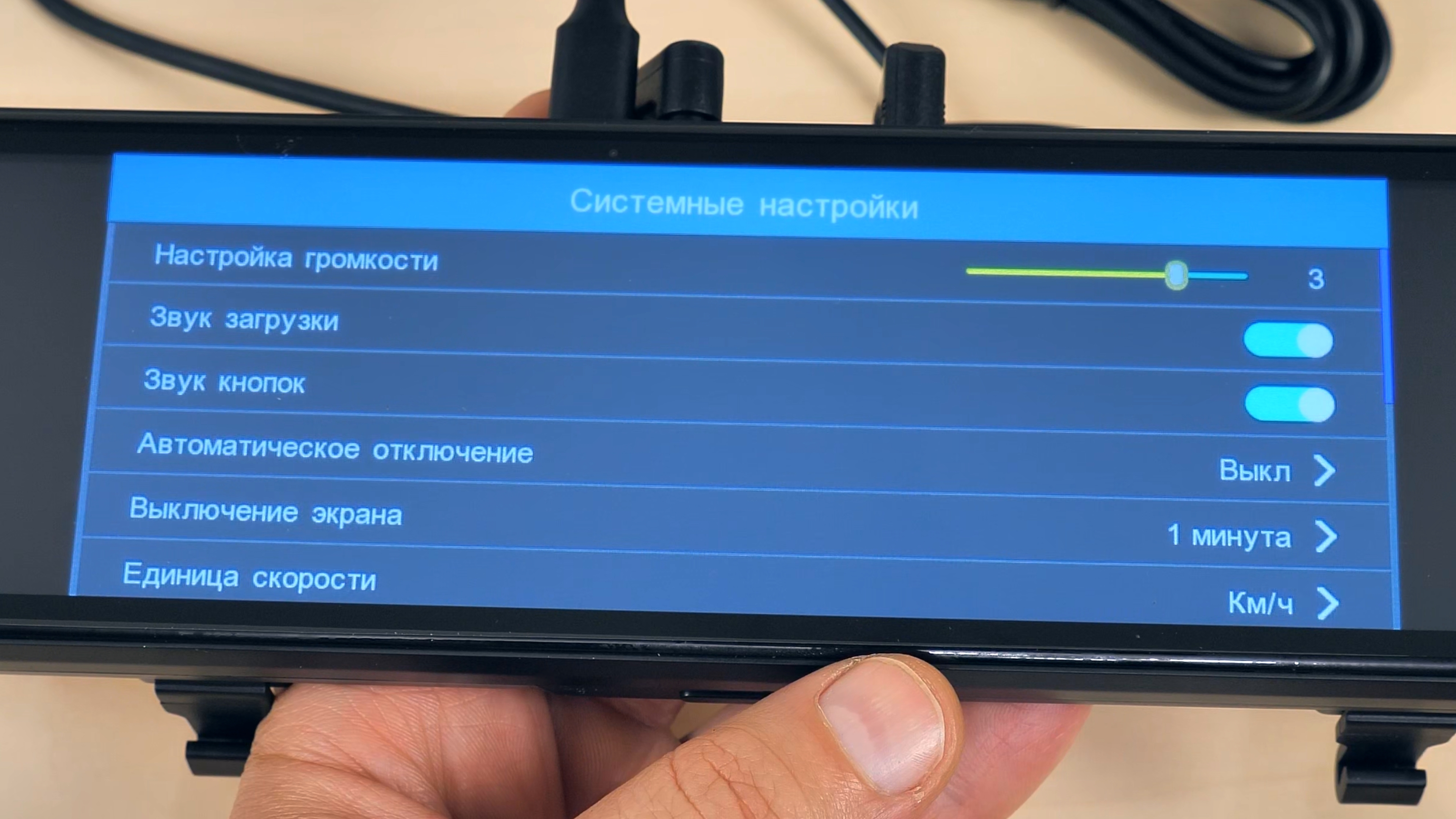 В системных настройках можно: отрегулировать уровень громкости внешнего динамика регистратора; включить/выключить звук загрузки и звук нажатия кнопок; указать задержку на выключение регистратора на 1 или 3 минуты после отключения питания; задать таймер выключения экрана на 1 или 3 минуты; выбрать единицы измерения скорости — километры или мили; изменить язык устройства; скорректировать часовой пояс; посмотреть информацию о сигналах GPS.