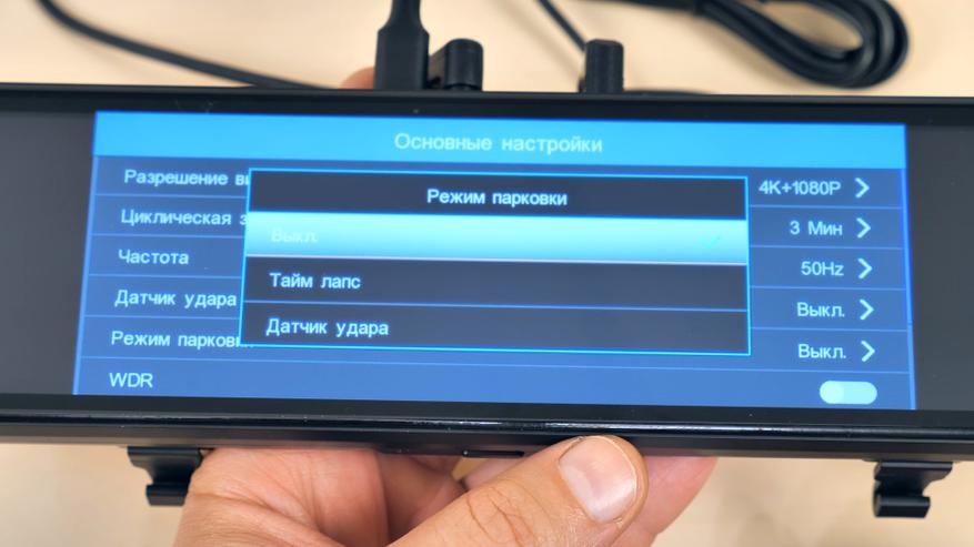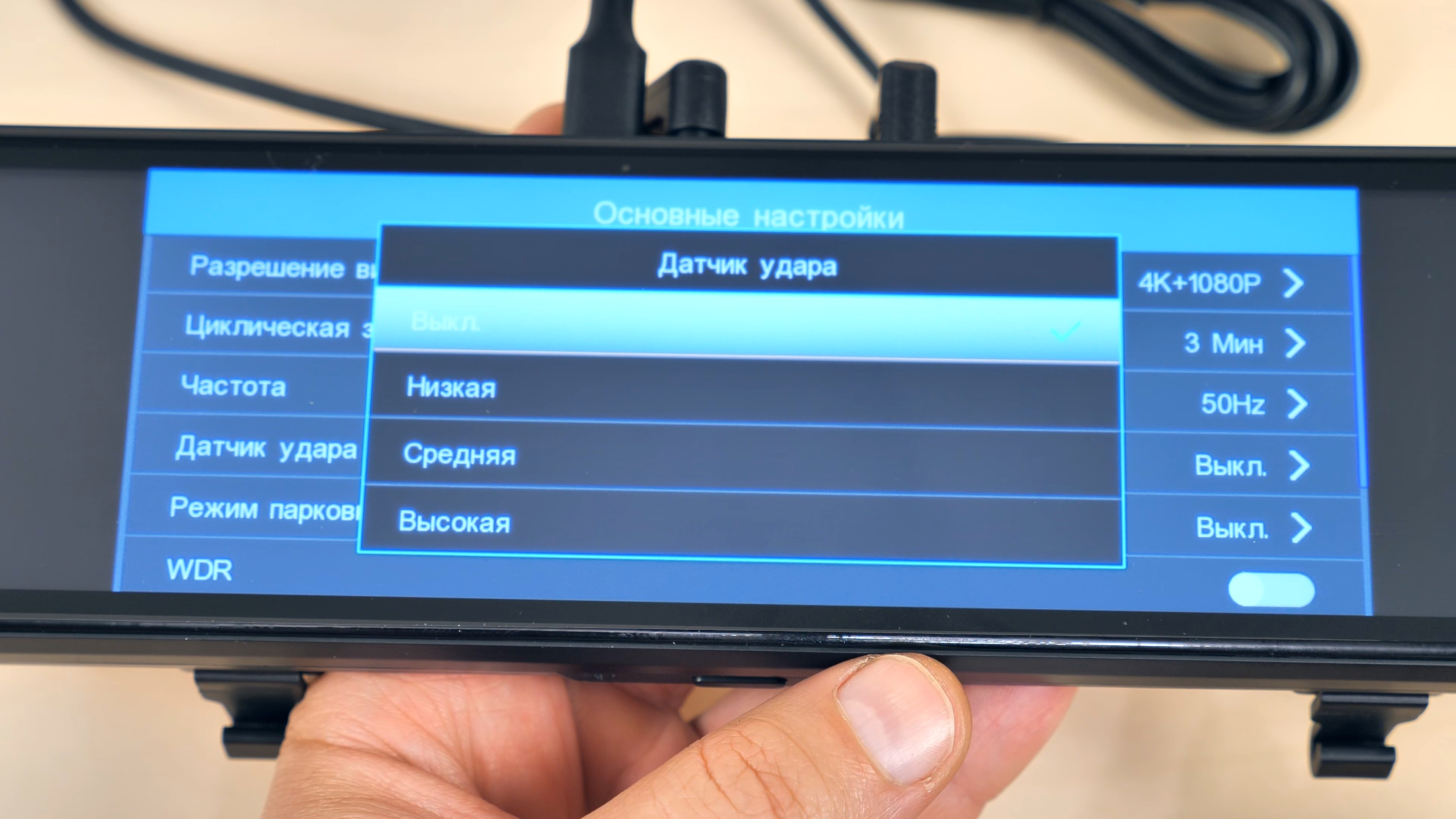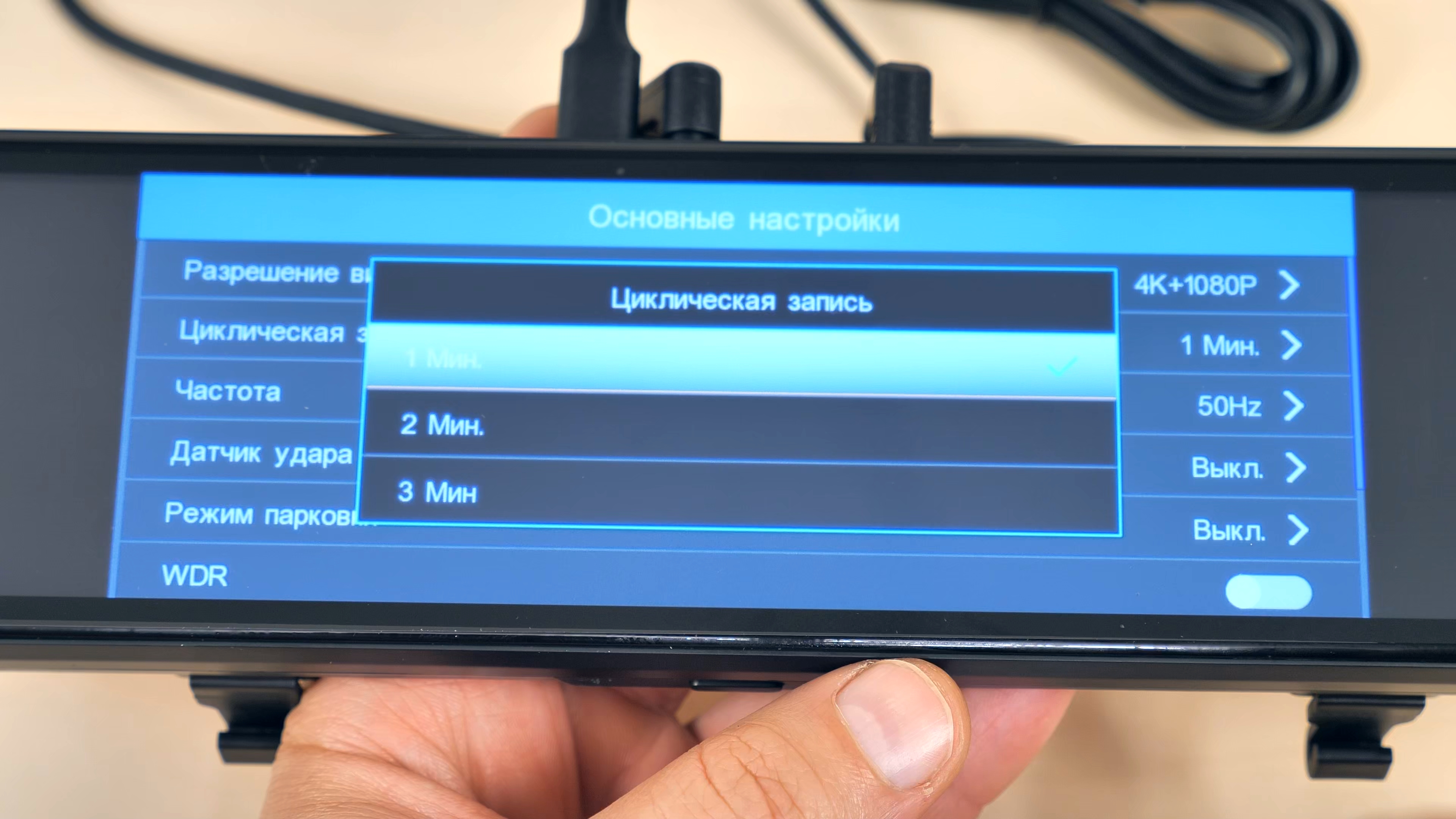 Тут можно выбрать разрешение записи для основной камеры: Full HD; 2,5К или 4K. Для задней камеры всегда доступно только Full HD. Поскольку регистратор имеет циклическую запись, то можно выбрать длительность записываемых видеофайлов — от 1 до 3 минут. Можно выбрать частоту бытовой электросети для уменьшения мерцания на ночных видеозаписях при искусственном освещении. Также можно включить/выключить датчик удара и отрегулировать его чувствительность, активировать режим парковки и выбрать тип его работы — запись в режиме таймлапс 24/7 или по датчику удара.