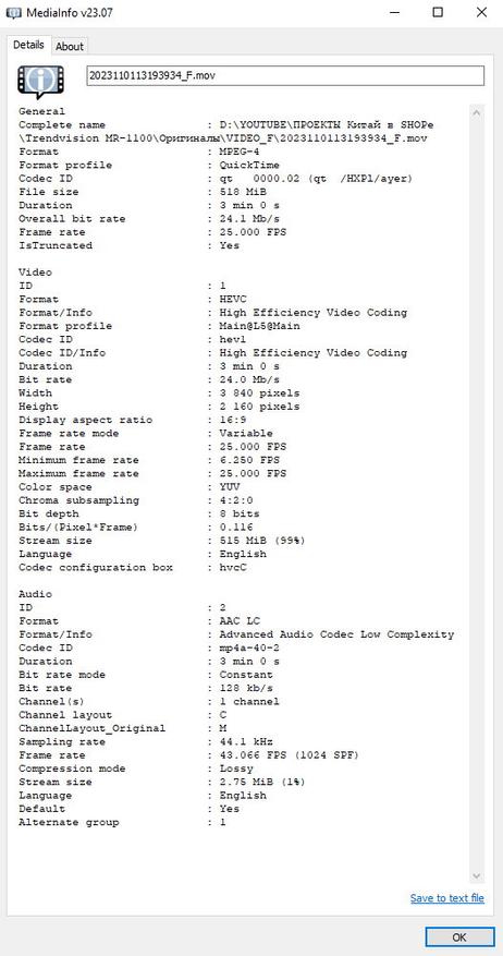 Кодек используется современный h.265, который при небольшом битрейте способен выдавать хороший результат, а битрейд тут не маленький — 24 Мб/c, что для 2k разрешения очень хорошо, а вот фреймрейт небольшой — всего 25 кадров в секунду.