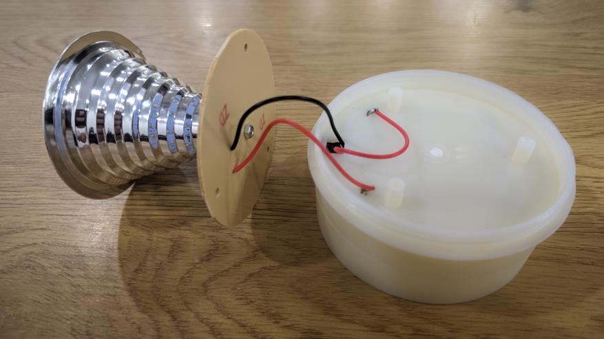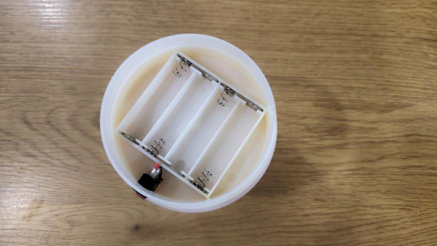 Сняв нижнюю платформу, получаем доступ к батарейному блоку. Он рассчитан на четыре элемента AA по 1.5 В. Стальные контакты подпружинены, на пластике отмечены полярности. Все закрыто в единый корпус из светлого пластика.