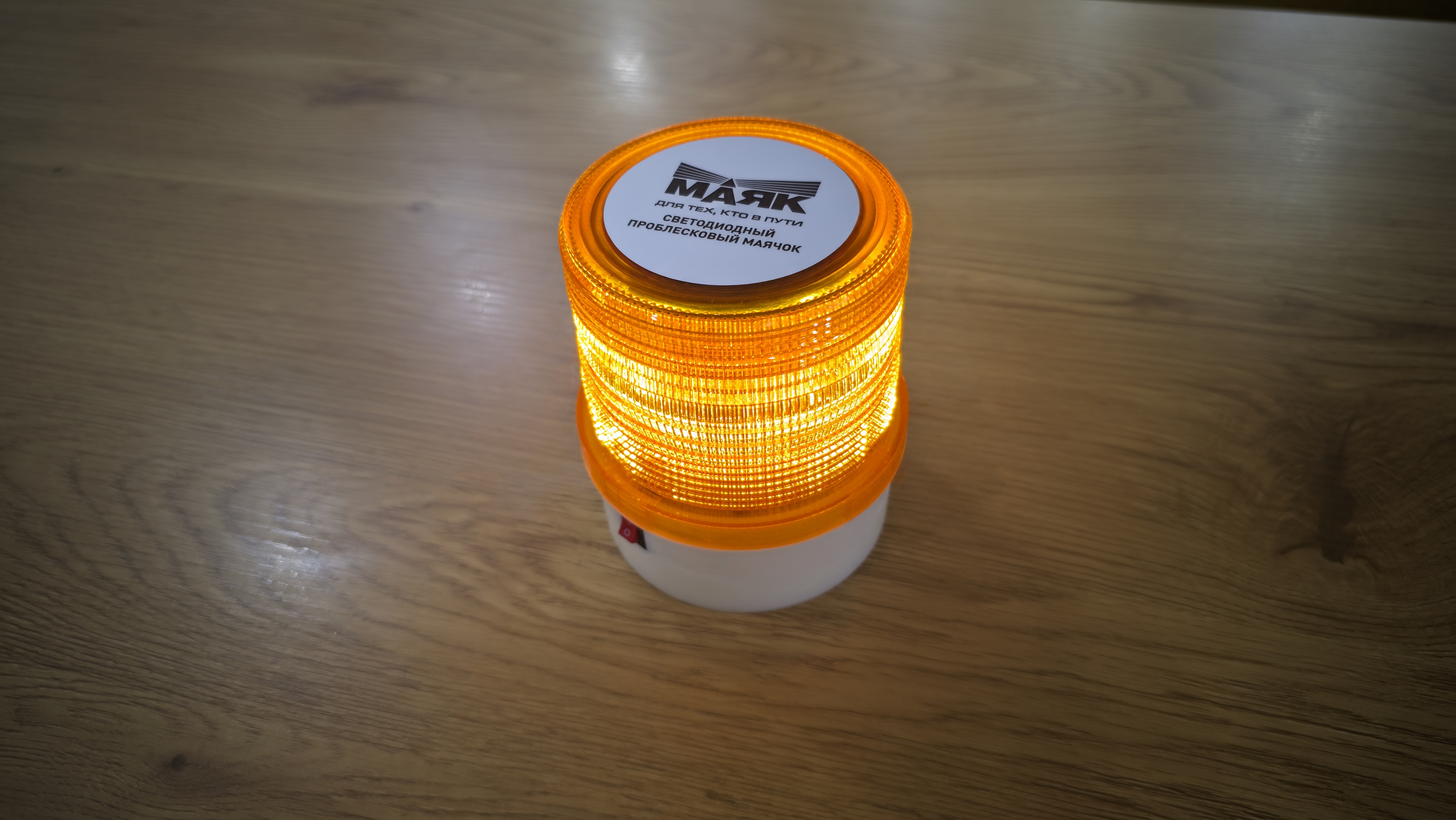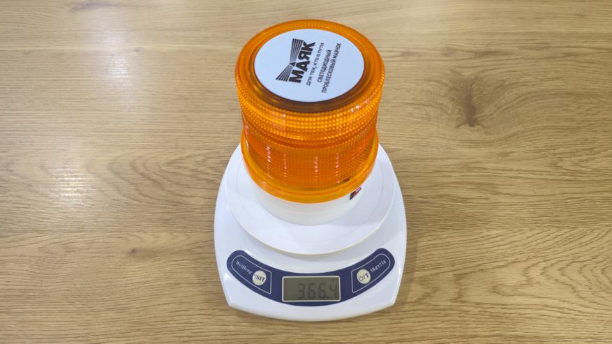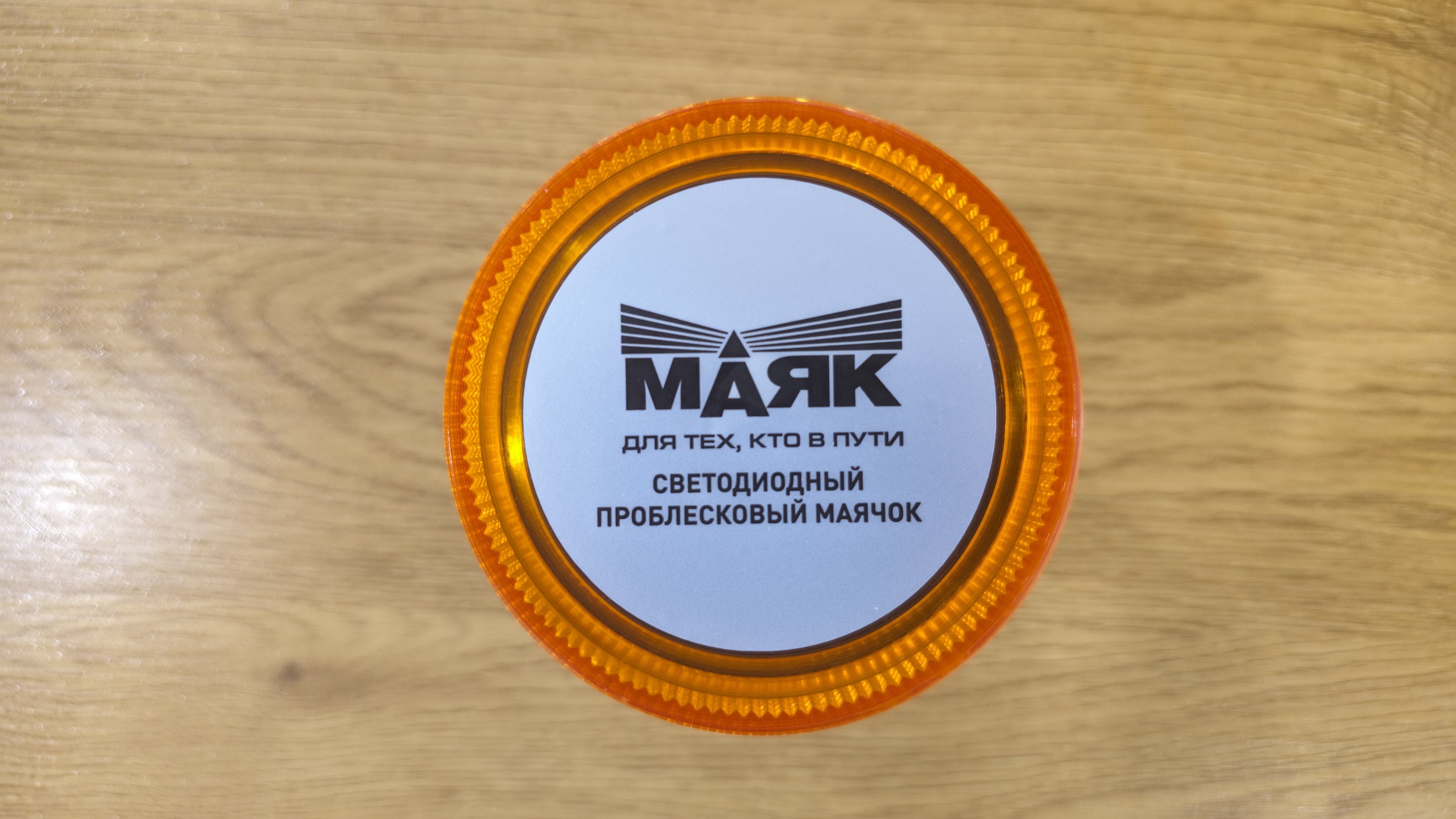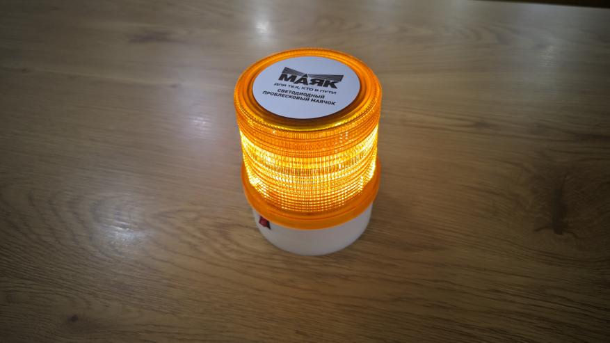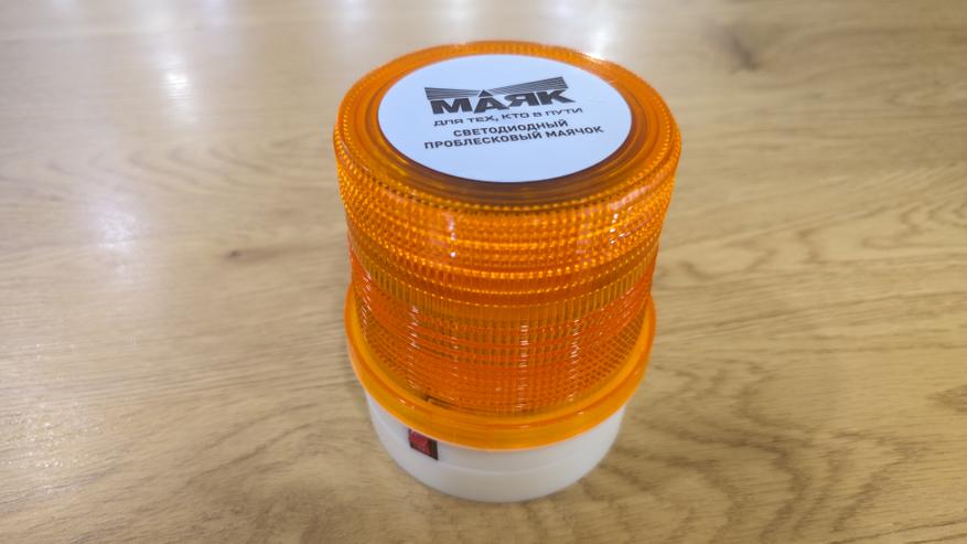 Маячок выглядит как классическая оранжевая мигалка. Плафон поликарбонатный, с внутренней текстурой, которая рассеивает свет и делает его заметным под разными углами. Он вкручивается на корпус через крупную резьбу. Верх закрыт круглой наклейкой с названием «Маяк» и обозначением, что это светодиодный проблесковый маячок.