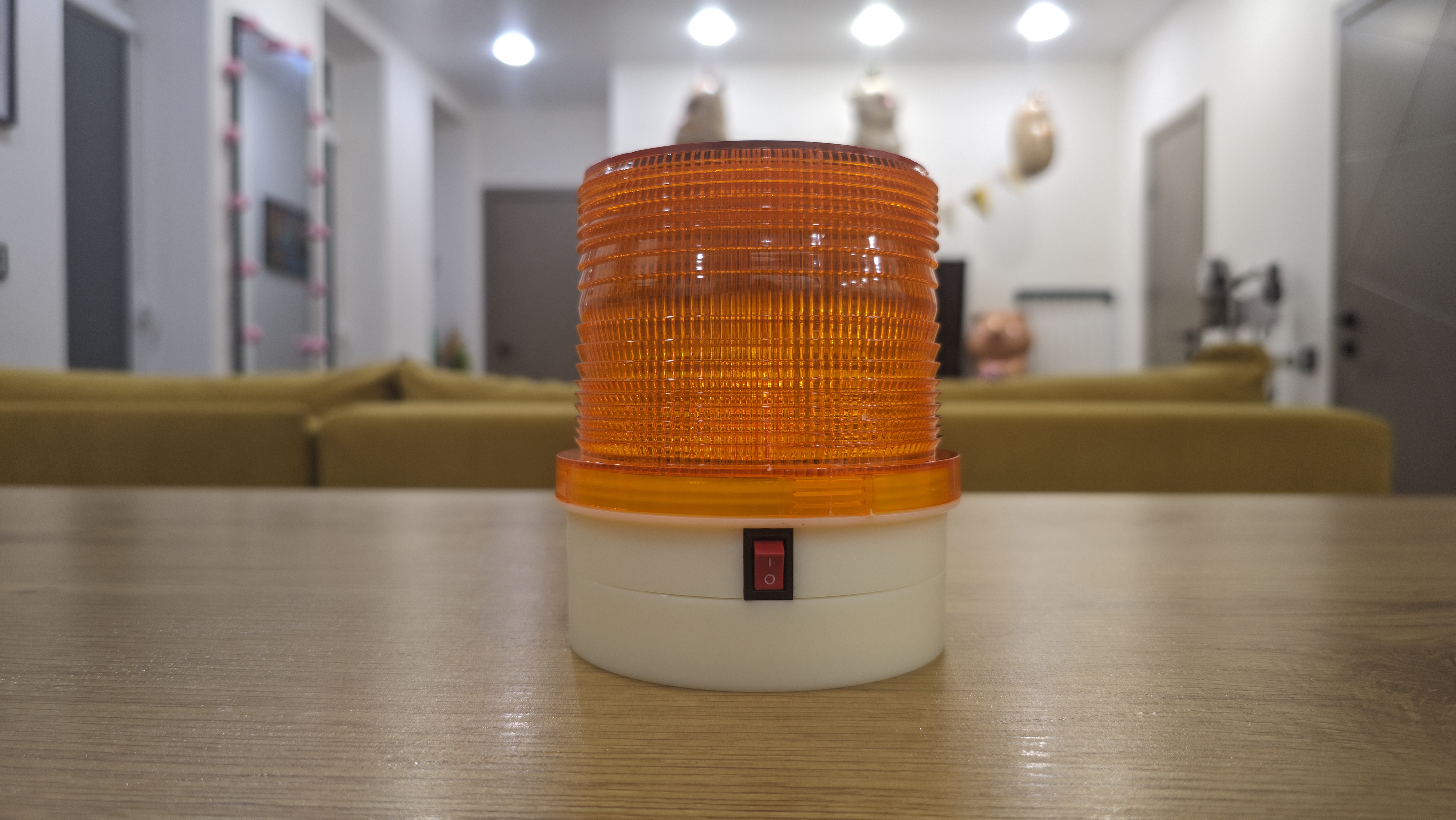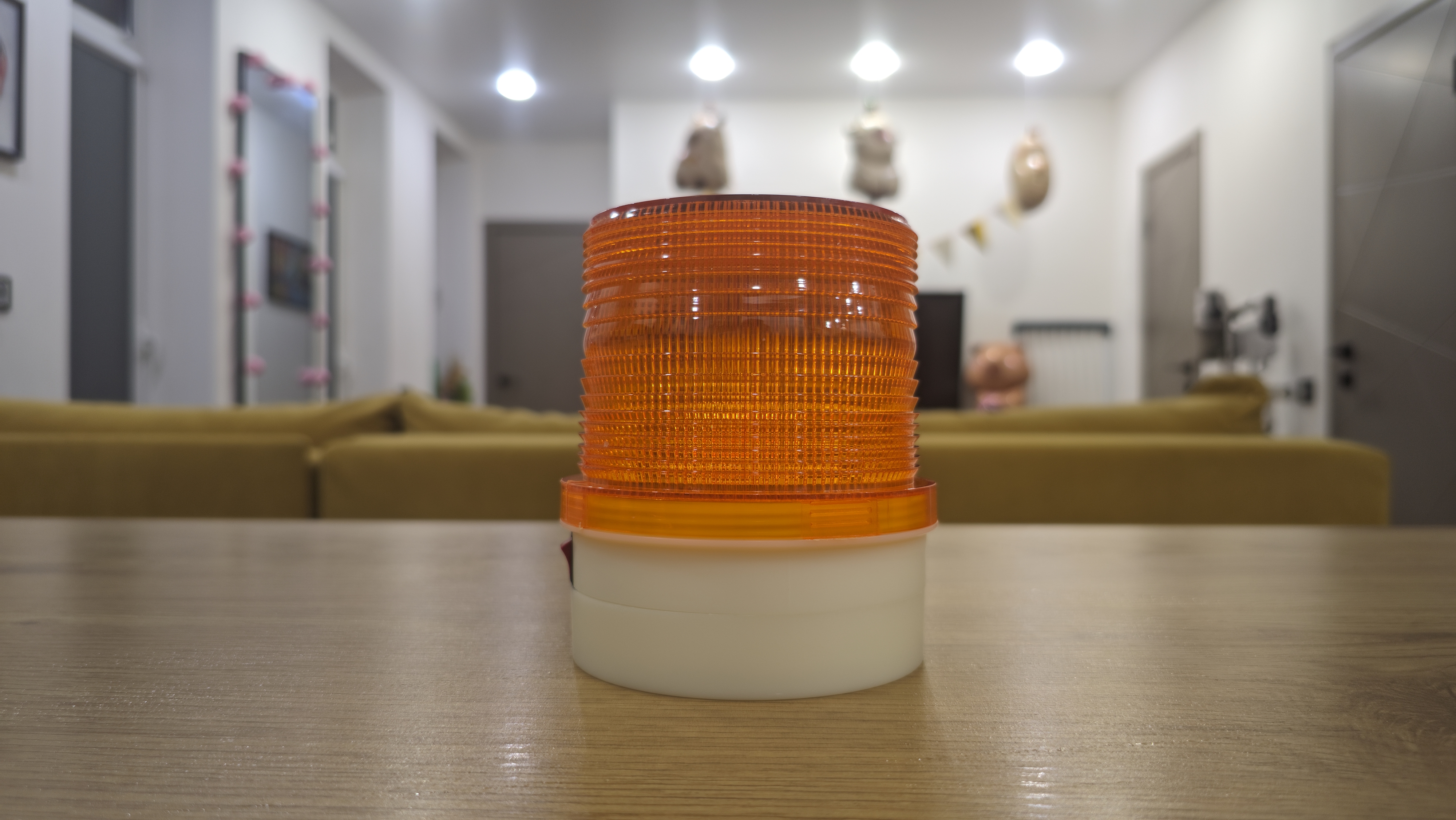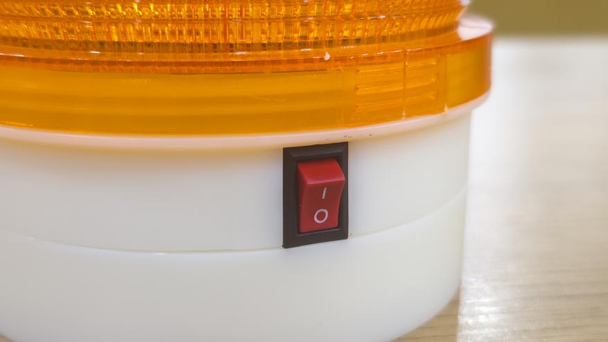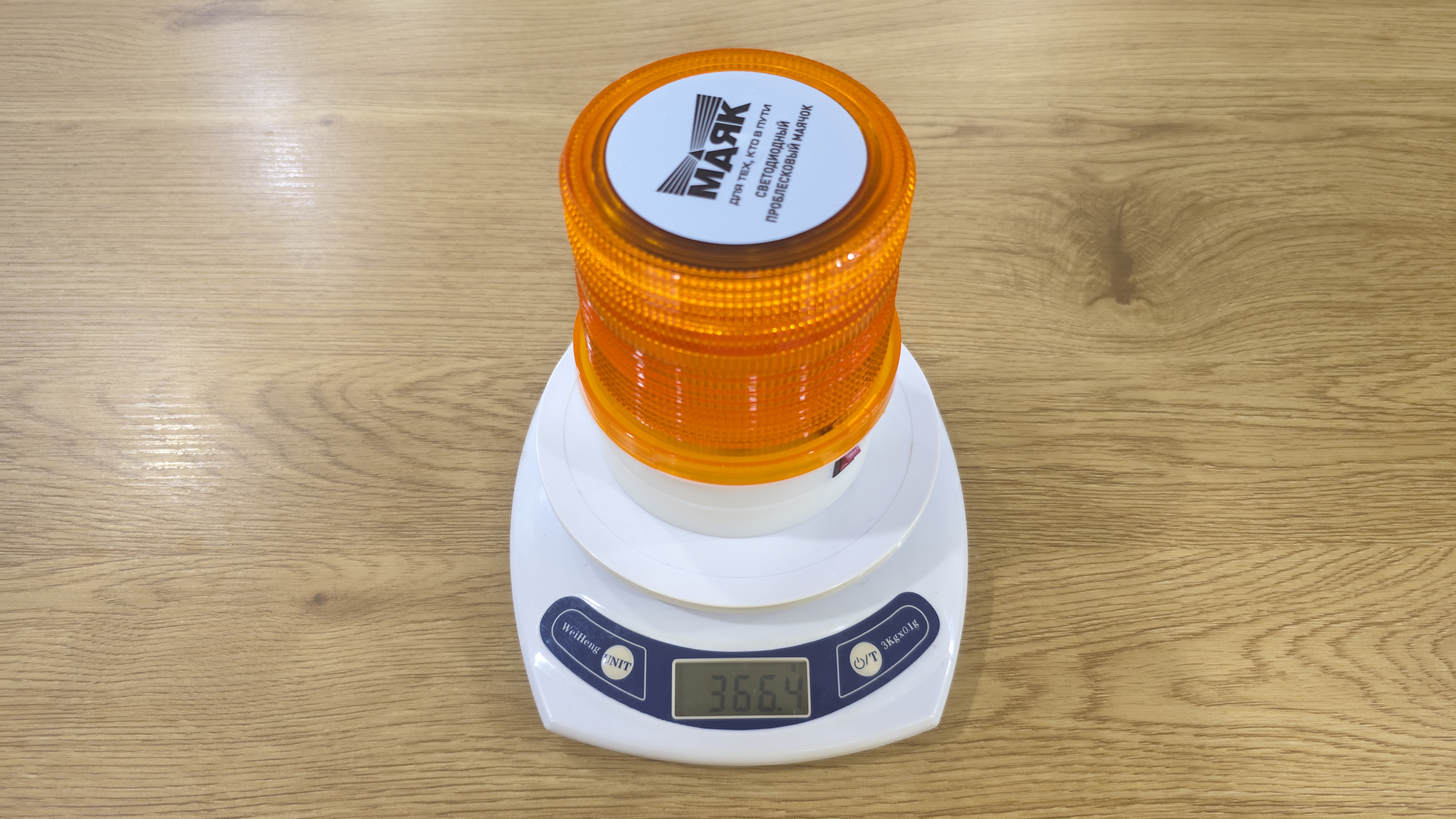Маячок выглядит как классическая оранжевая мигалка. Плафон поликарбонатный, с внутренней текстурой, которая рассеивает свет и делает его заметным под разными углами. Он вкручивается на корпус через крупную резьбу. Верх закрыт круглой наклейкой с названием «Маяк» и обозначением, что это светодиодный проблесковый маячок.