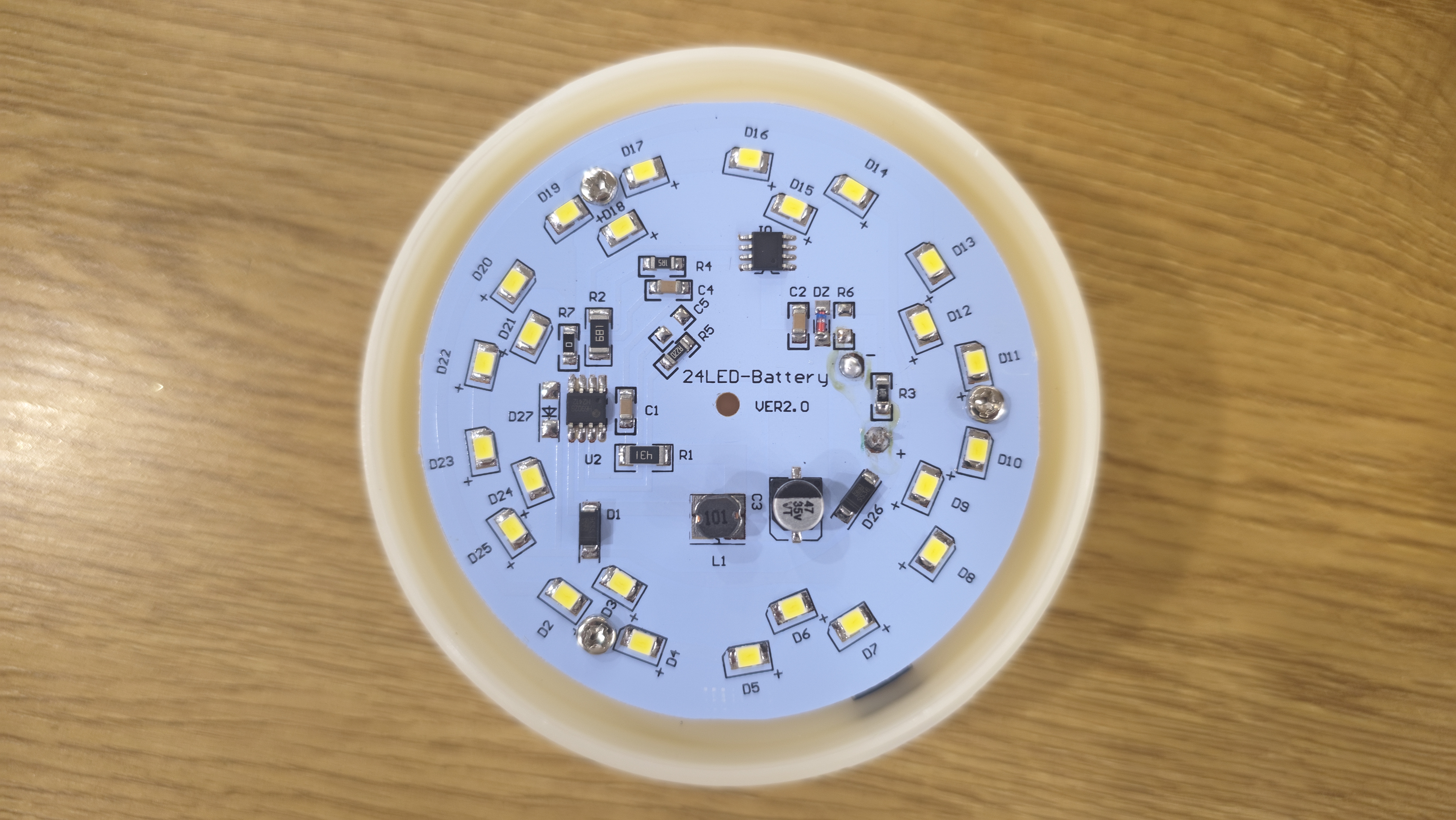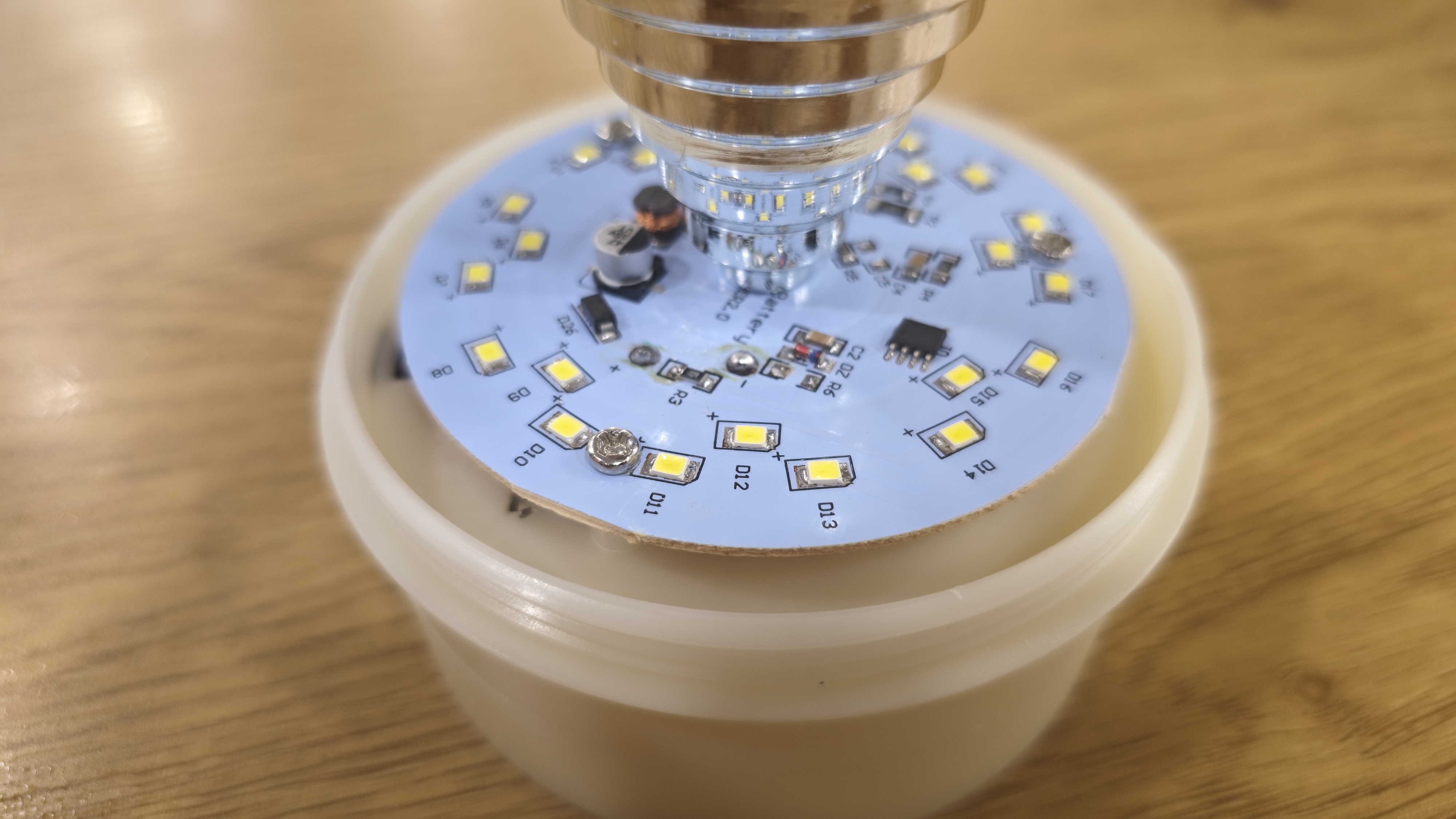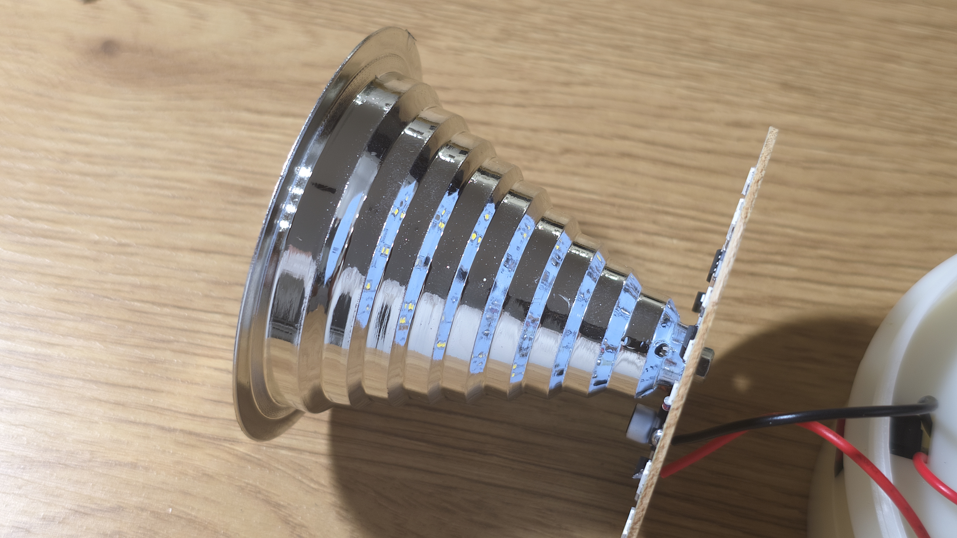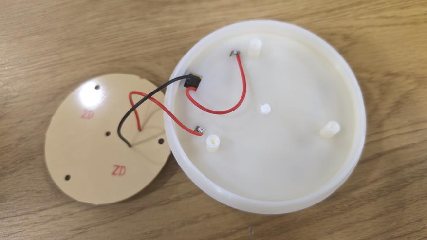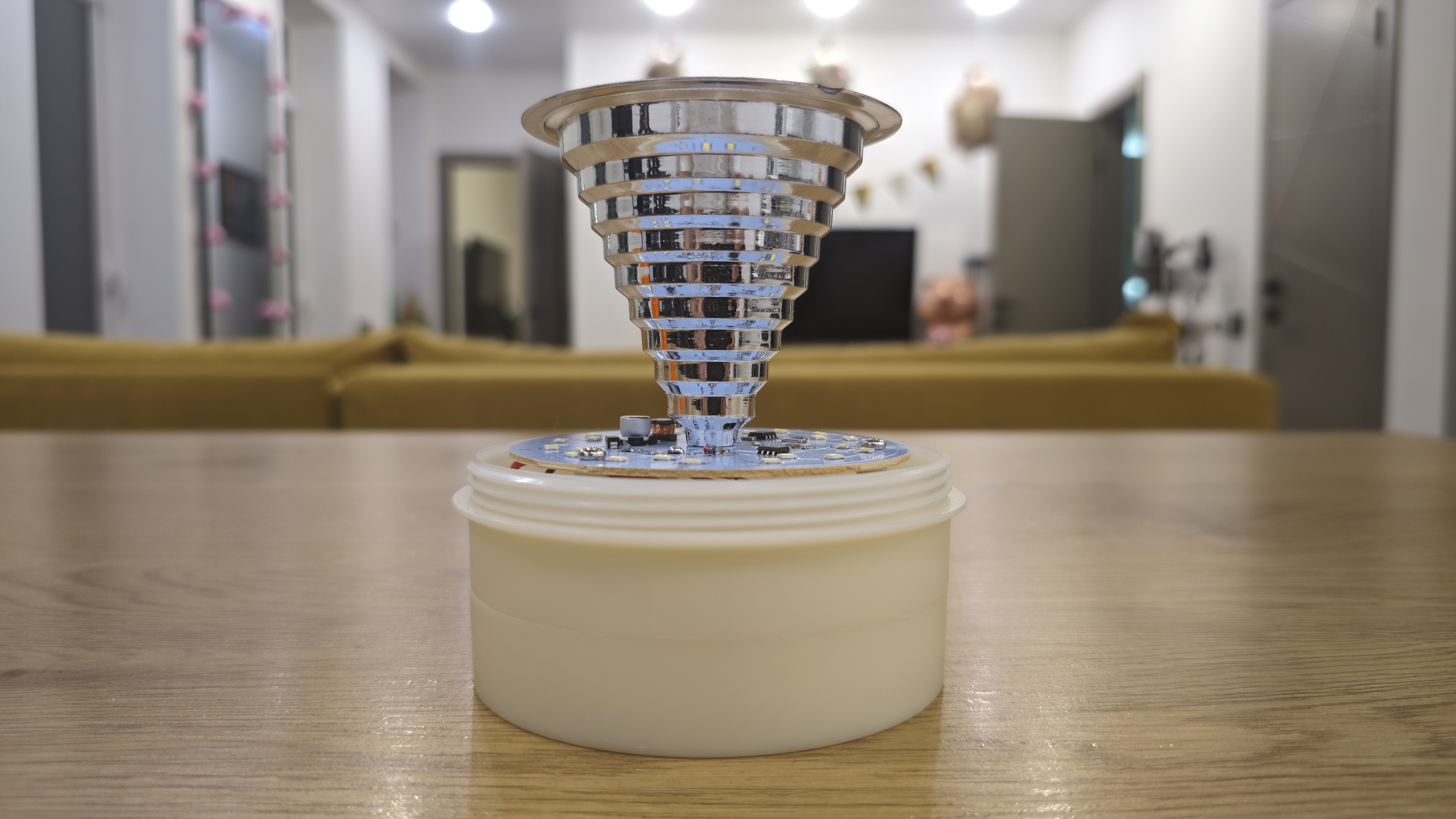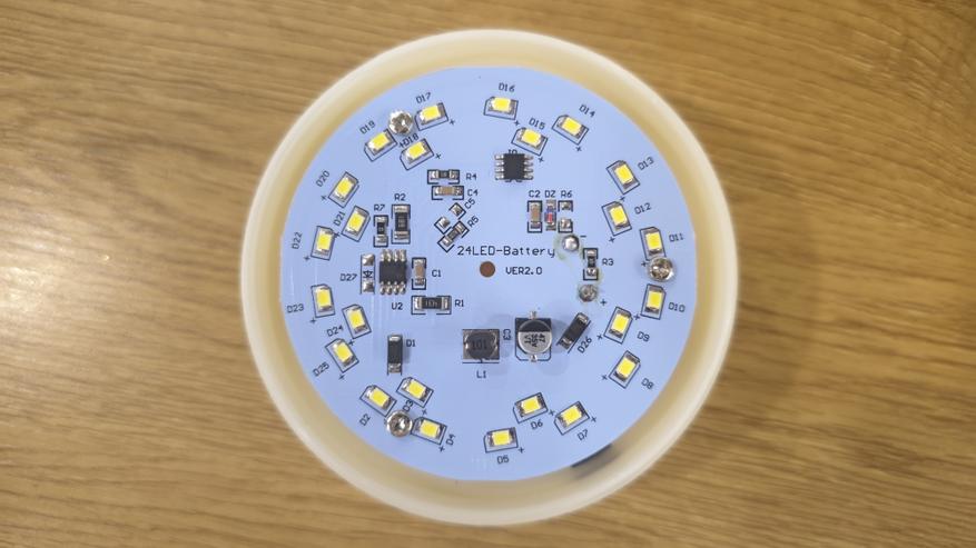 Сняв плафон, открывается основная рабочая часть. Здесь стоит отражатель в форме перевернутого конуса, он имеет девять ступеней. Ступени идут одна за другой, постепенно сужаясь к основанию, и создают своеобразный профиль, похожий на колокол с прорезями. Покрытие зеркальное, оно собирает свет и направляет его наружу, усиливая импульс. Обратной стороне отражатель крепится к плате управления со светодиодами. На плате размещены 24 светодиода. Они идут по окружности ровным плотным кольцом. Между ними видны мелкие электронные элементы: микросхема, катушка, конденсатор, пара резисторов. Плата выглядит аккуратной.