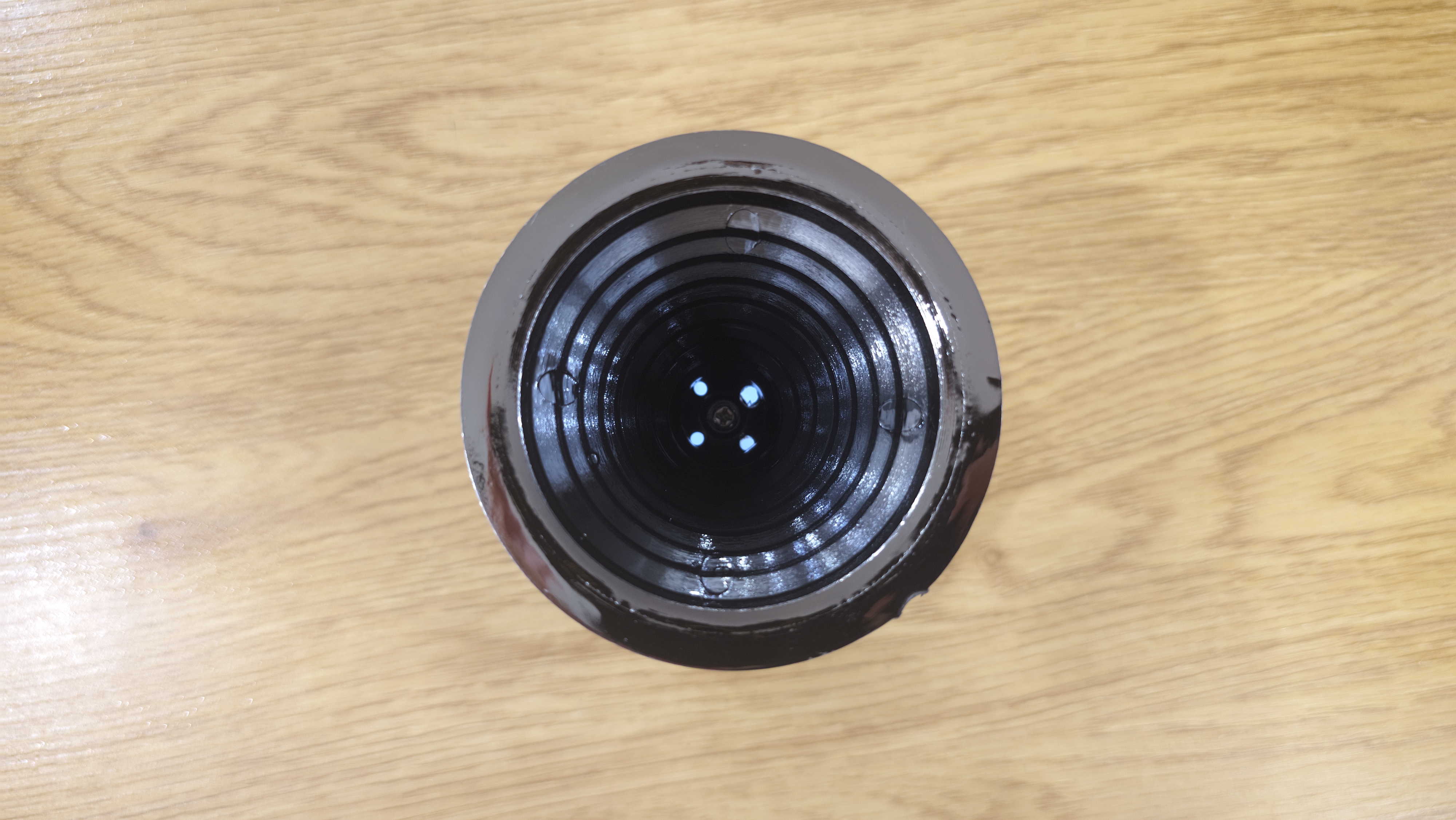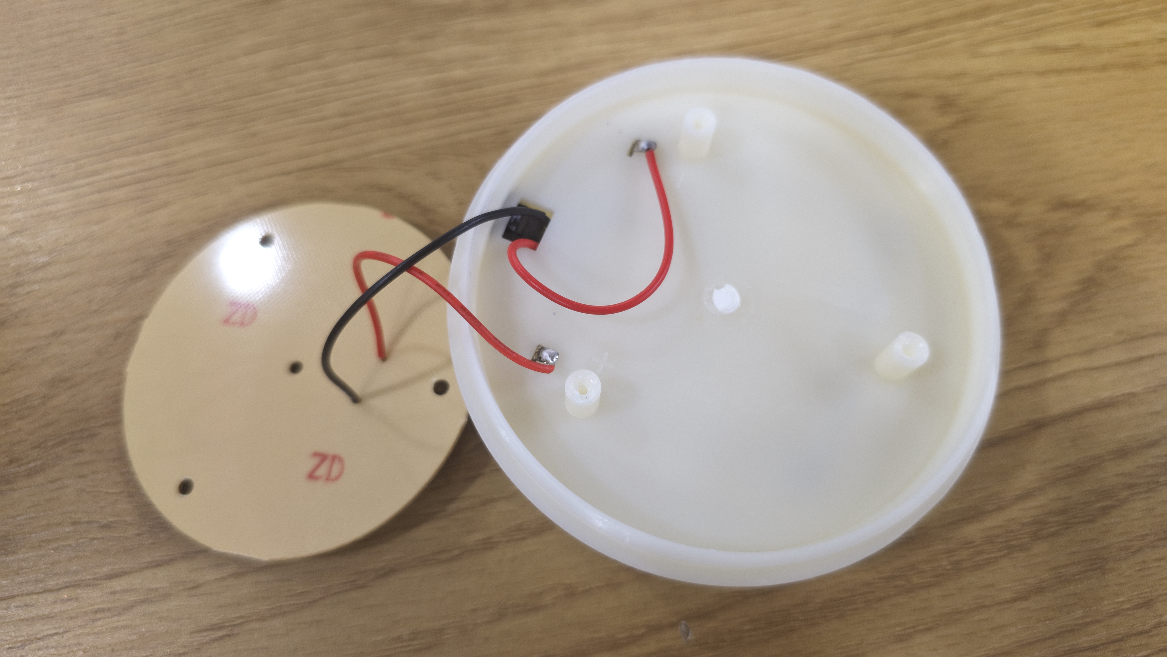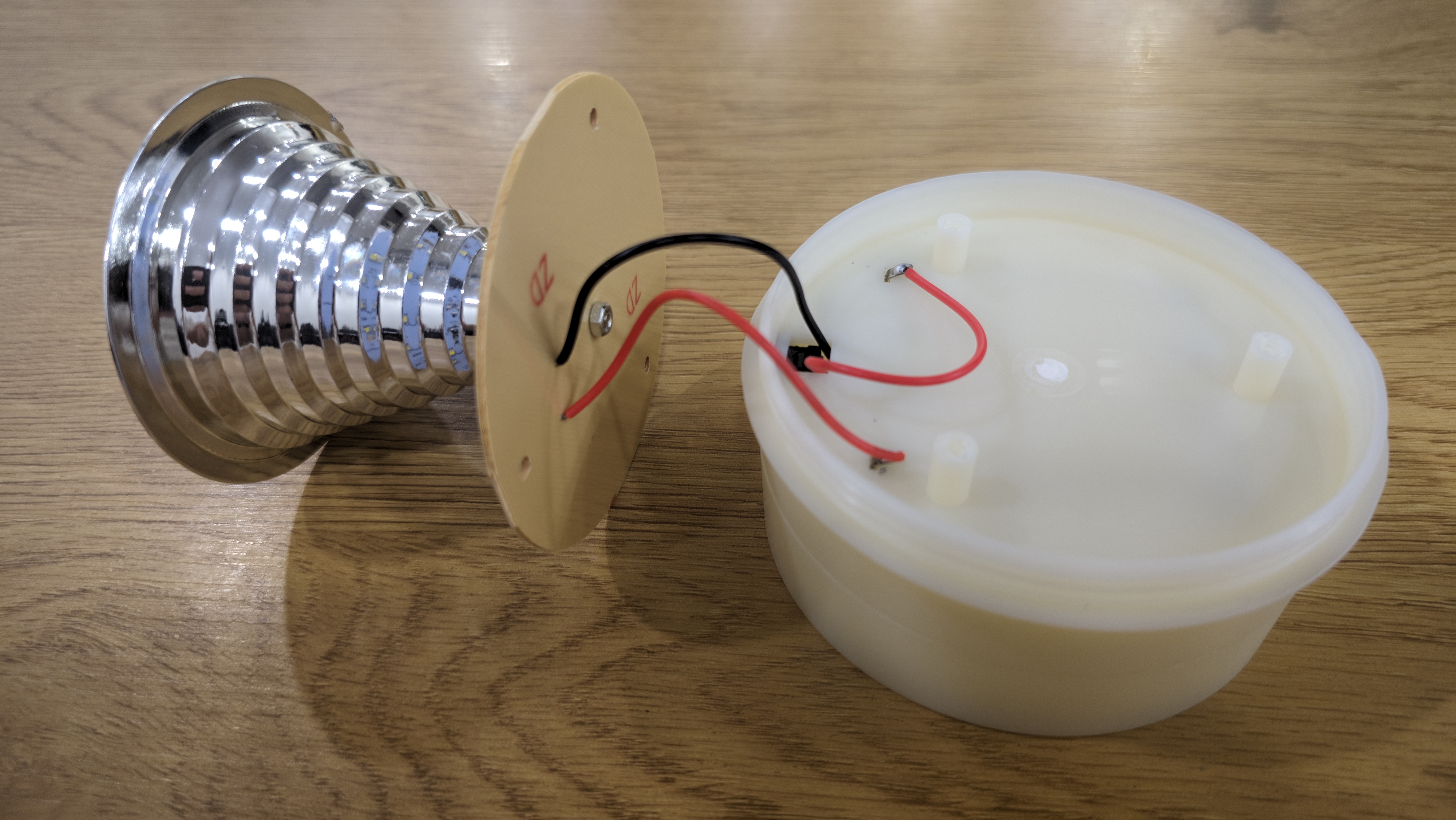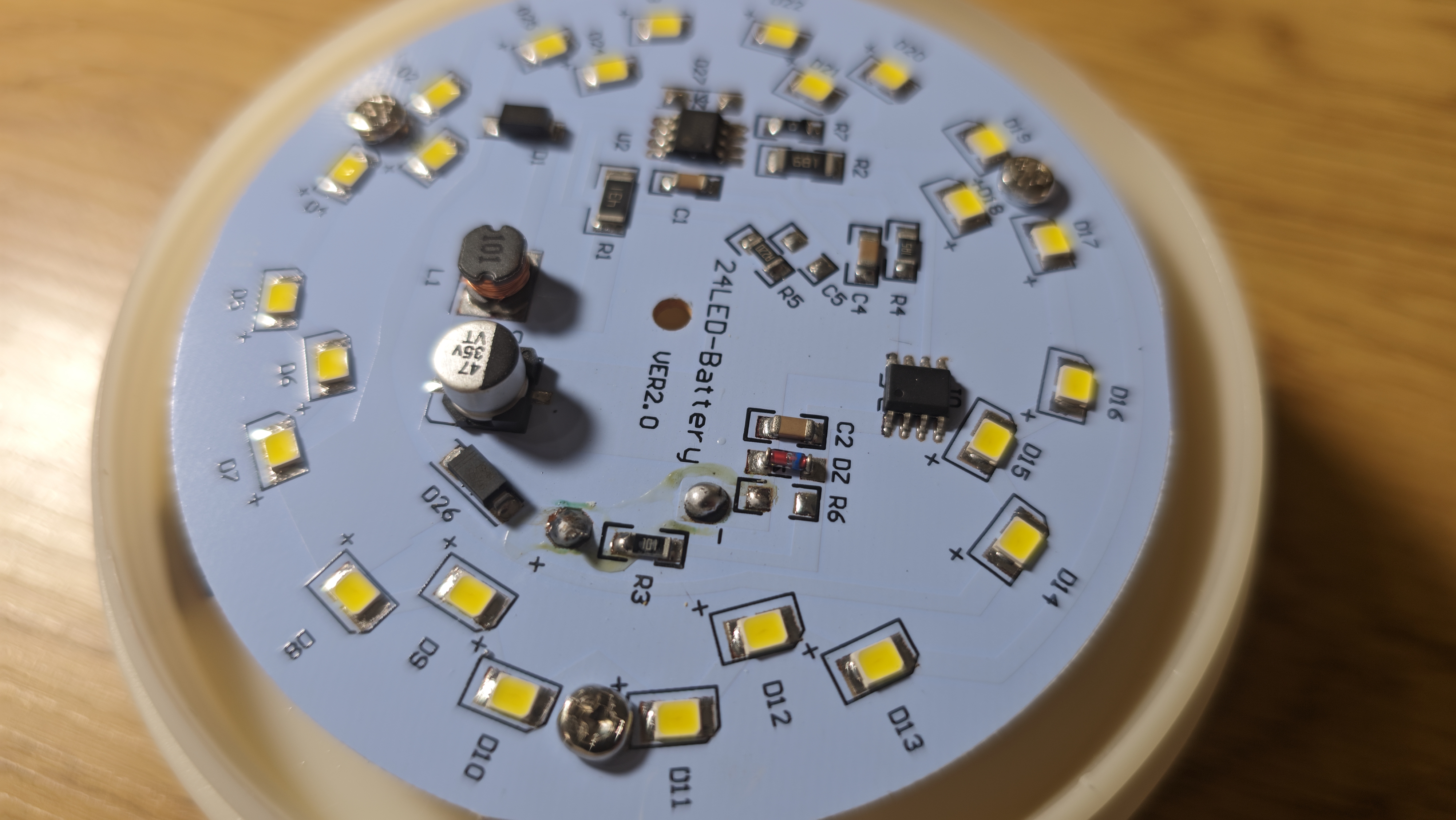 Сняв плафон, открывается основная рабочая часть. Здесь стоит отражатель в форме перевернутого конуса, он имеет девять ступеней. Ступени идут одна за другой, постепенно сужаясь к основанию, и создают своеобразный профиль, похожий на колокол с прорезями. Покрытие зеркальное, оно собирает свет и направляет его наружу, усиливая импульс. Обратной стороне отражатель крепится к плате управления со светодиодами. На плате размещены 24 светодиода. Они идут по окружности ровным плотным кольцом. Между ними видны мелкие электронные элементы: микросхема, катушка, конденсатор, пара резисторов. Плата выглядит аккуратной.