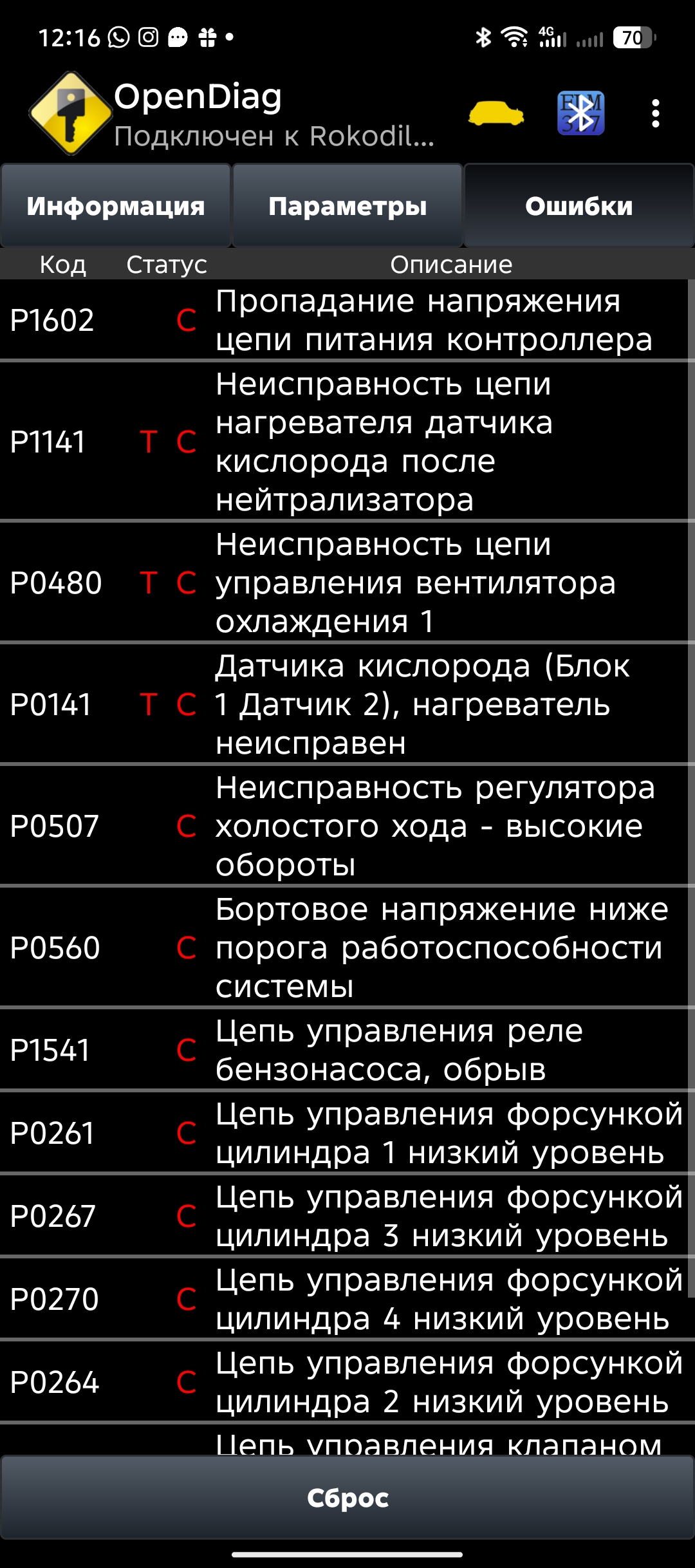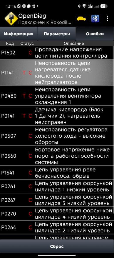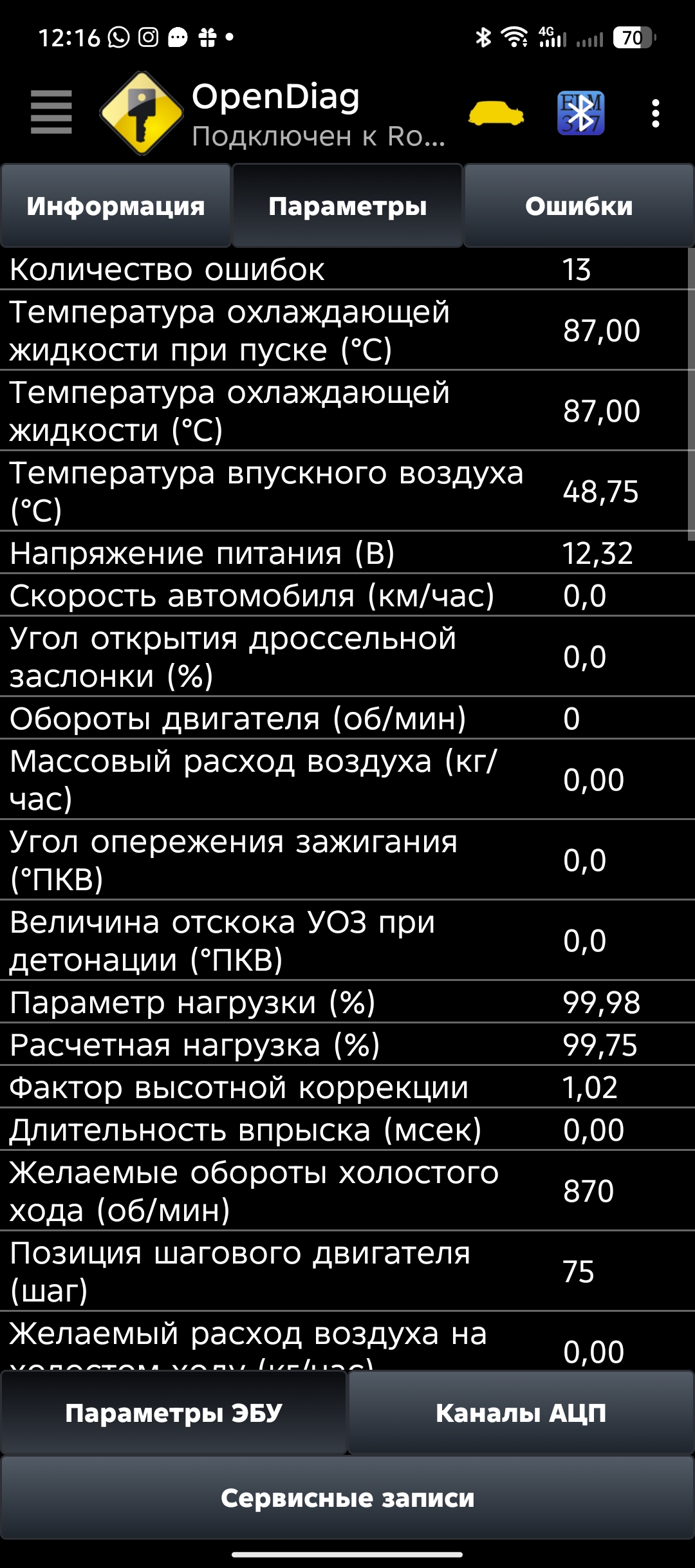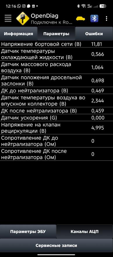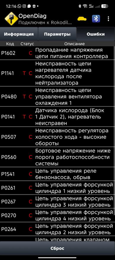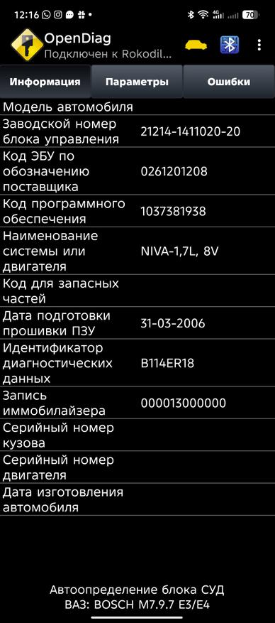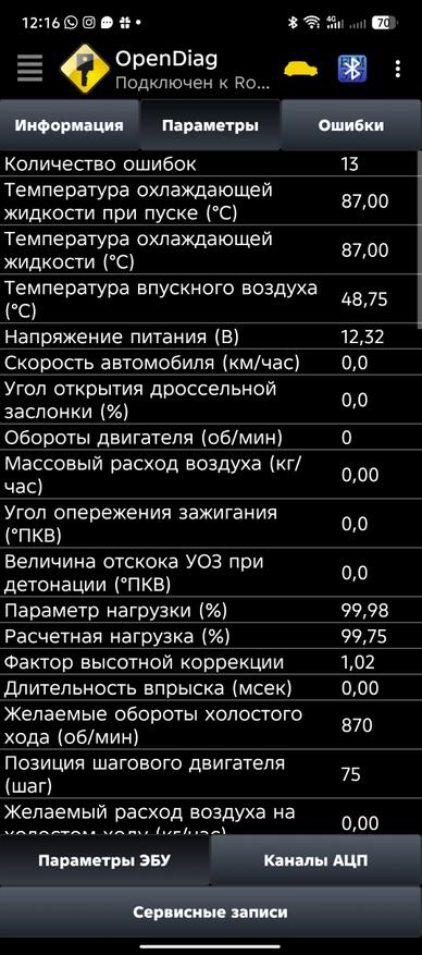 И на последок «Длинная Нива», она же Lada 4x4 5D (ВАЗ-2131) 2008 года выпуска. Тут будем проверять с помощью OpenDiag, так как данный софт ориентирован на отечественные автомобили. Само приложение максимально простое и содержит лишь 3 вкладки: информацию об автомобиле, параметры и ошибки. В параметрах выводится текущая информация об автомобиле, деля их на 2 категории: ЭБУ и АЦП. Раздел с ошибками имеет обозначение кода ошибок, текущий статус (С — в памяти, Т — активные) и описание. Больше полезной информации OpenDiag не предоставляет.