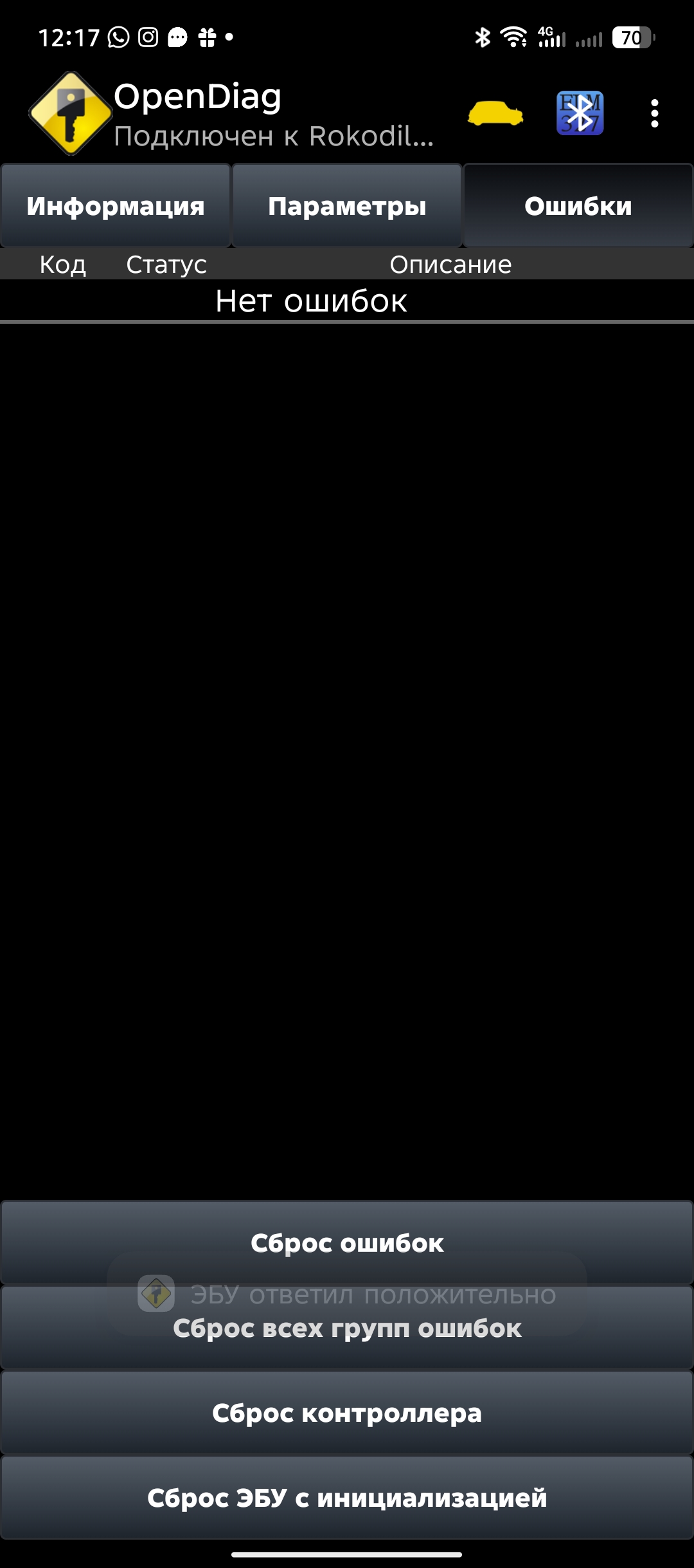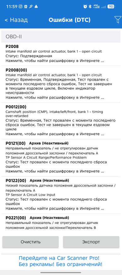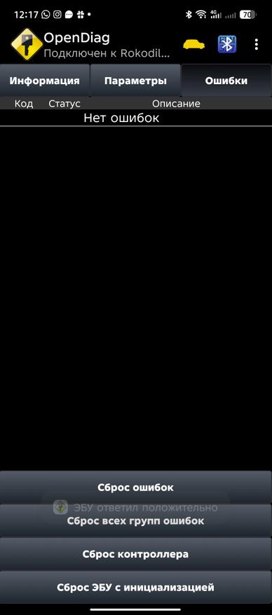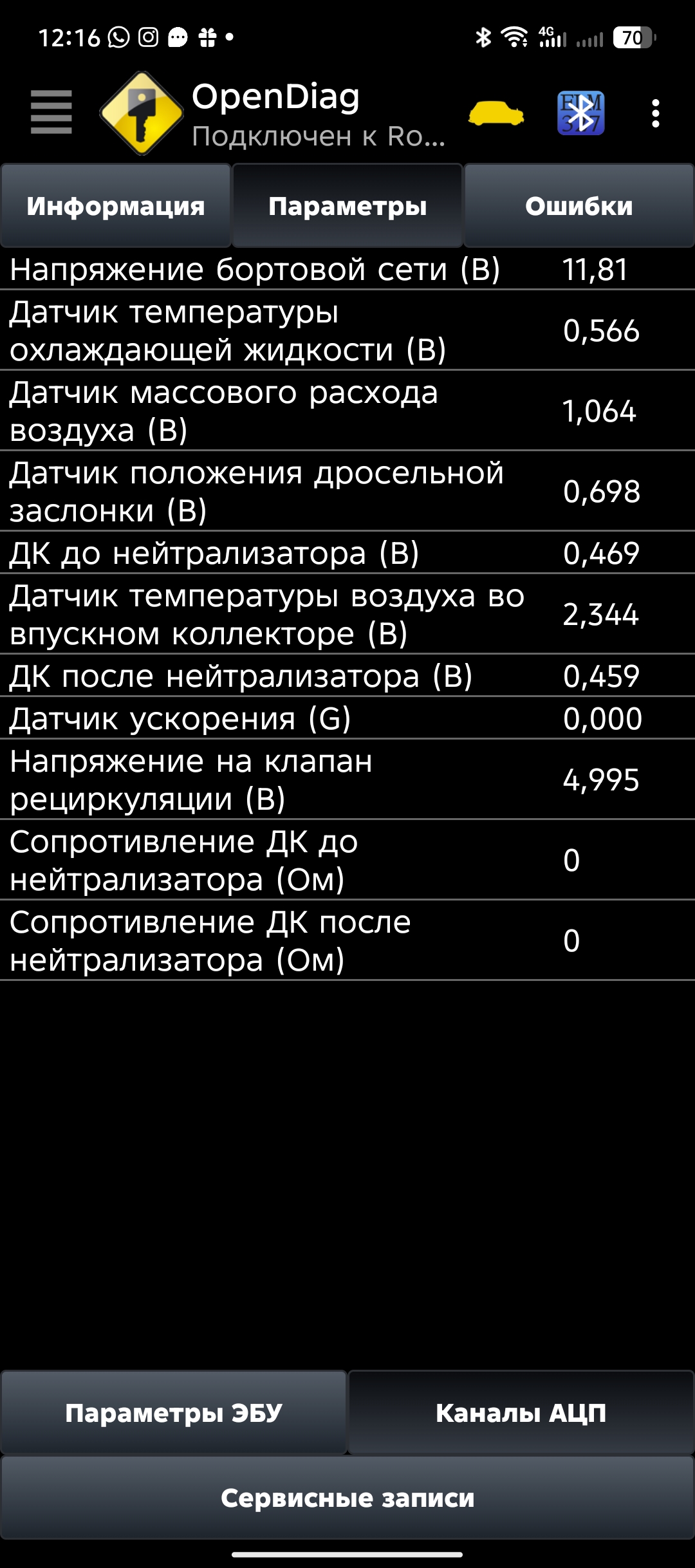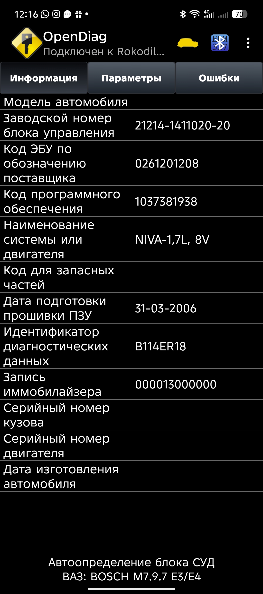 И на последок «Длинная Нива», она же Lada 4x4 5D (ВАЗ-2131) 2008 года выпуска. Тут будем проверять с помощью OpenDiag, так как данный софт ориентирован на отечественные автомобили. Само приложение максимально простое и содержит лишь 3 вкладки: информацию об автомобиле, параметры и ошибки. В параметрах выводится текущая информация об автомобиле, деля их на 2 категории: ЭБУ и АЦП. Раздел с ошибками имеет обозначение кода ошибок, текущий статус (С — в памяти, Т — активные) и описание. Больше полезной информации OpenDiag не предоставляет.