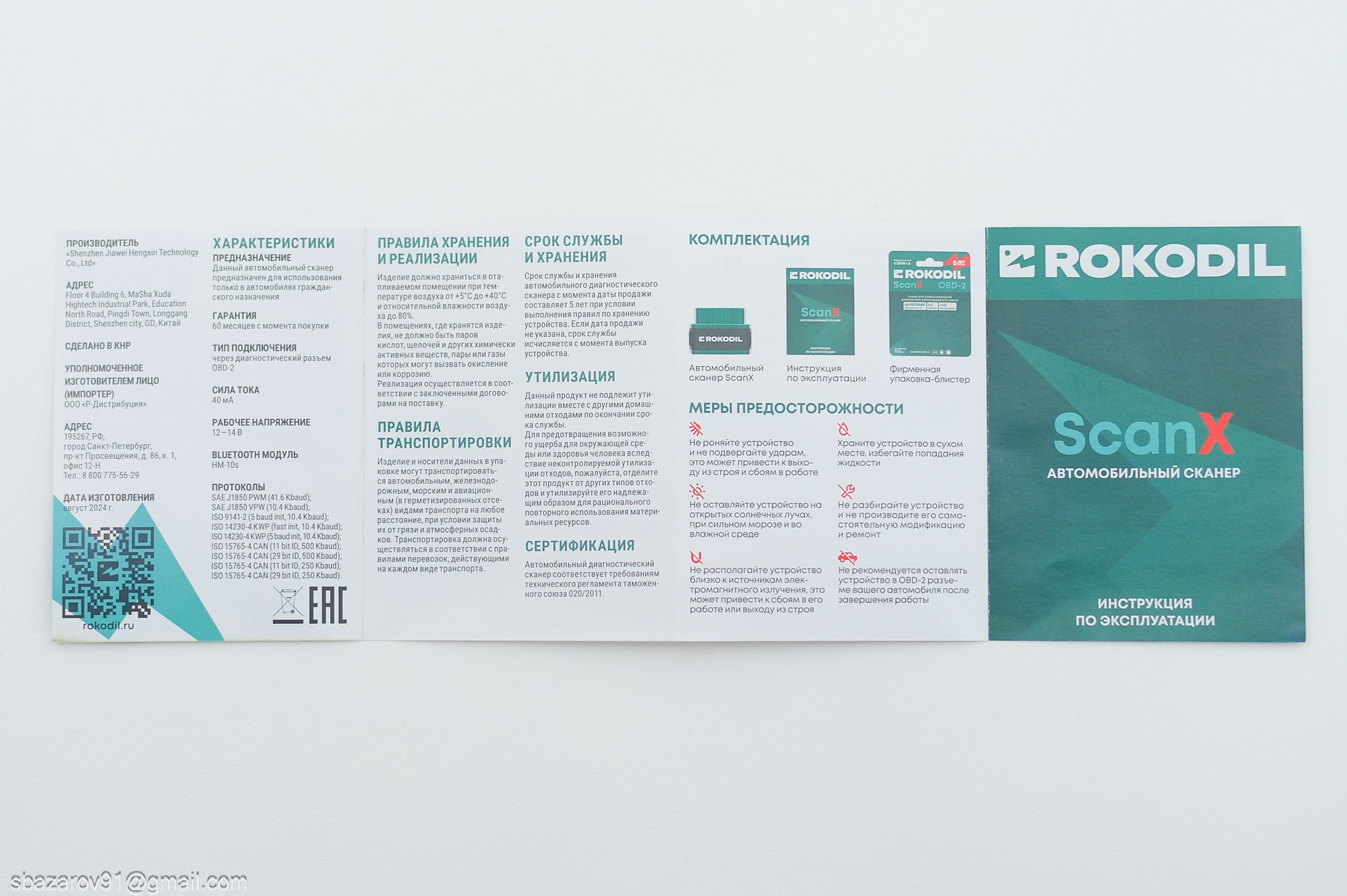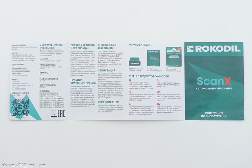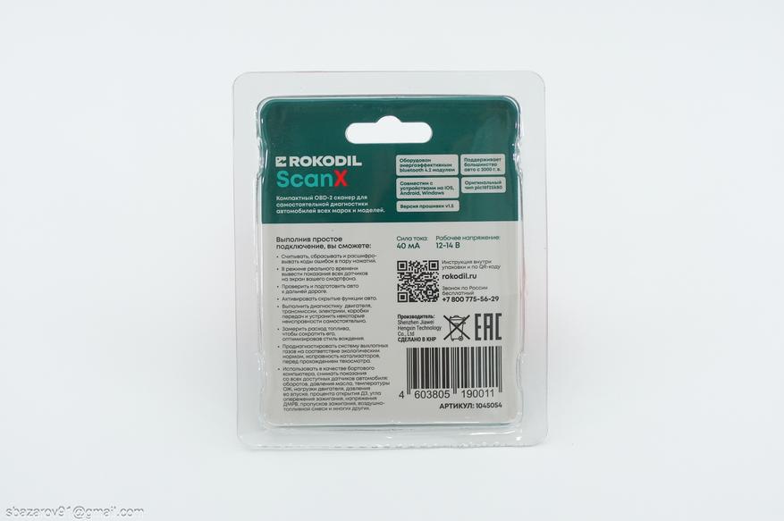 Автомобильный сканер Rokodil ScanX поставляется в прозрачном блистере с цветной вставкой. Данная вставка может рассказать о возможностях сканера и рабочем напряжении (12-14 Вольт).
