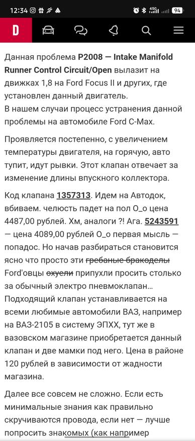 Теперь можно взять на себя роль диагноста и перейти к непосредственному изучению героя обзора. Первым автомобилем служит Ford Mondeo 4 поколения. Со слов владельца, ошибок полно, но машина ездит без каких-либо проблем. Для первого теста используем популярный Car Scanner. В нем довольно много возможностей, но более специфические доступны после покупки платной версии. Мы же здесь за ошибками, чем и займемся. Для этого выбираем марку автомобиля и тип двигателя (дизель/бензин), после чего выбираем Rokodil ScanX в качестве сканера и типы блоков, к которым будем подключаться. Ошибок было найдено на 8 скриншотов (все выкладывать не вижу смысла), практически 99% из них неактивные (в памяти). Активные отображаются как код ошибки без лишнего текста, например, P0012(00). Если провалиться более глубже в ошибку, то открывается браузер, где можно попытаться найти пути решения. Если нужен более точный код, то нужно искать софтину под конкретную марку автомобиля, а не использовать что-то универсальное, чем и является Car Scanner.