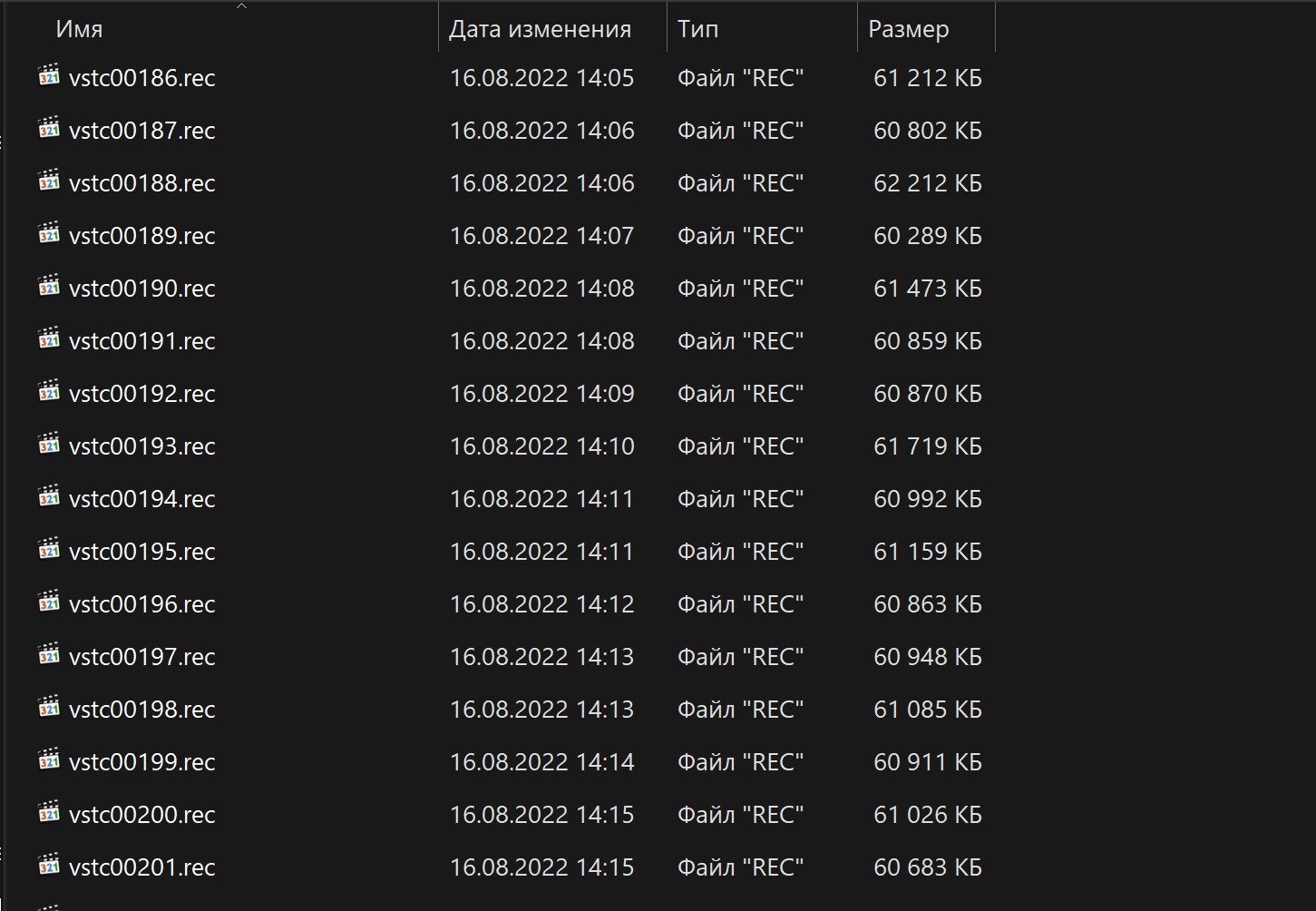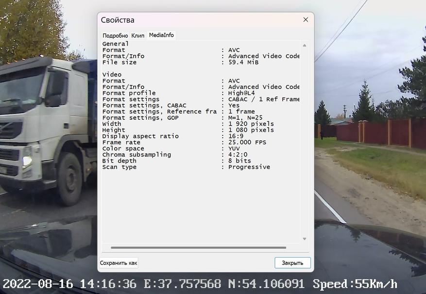 Формат записи файлов .rec. Минутный ролик занимает около 60 Мб. Отмечу качество записи 1080p (FullHD 1 920 на 1 080 пикселей, что подтверждается медиаданными, взятыми из роликов). Отмечу соотношение сторон 16:9 и частоту кадров 25 FPS. Да и просто если судить по качеству роликов, разрешение честное и без интерполяции.