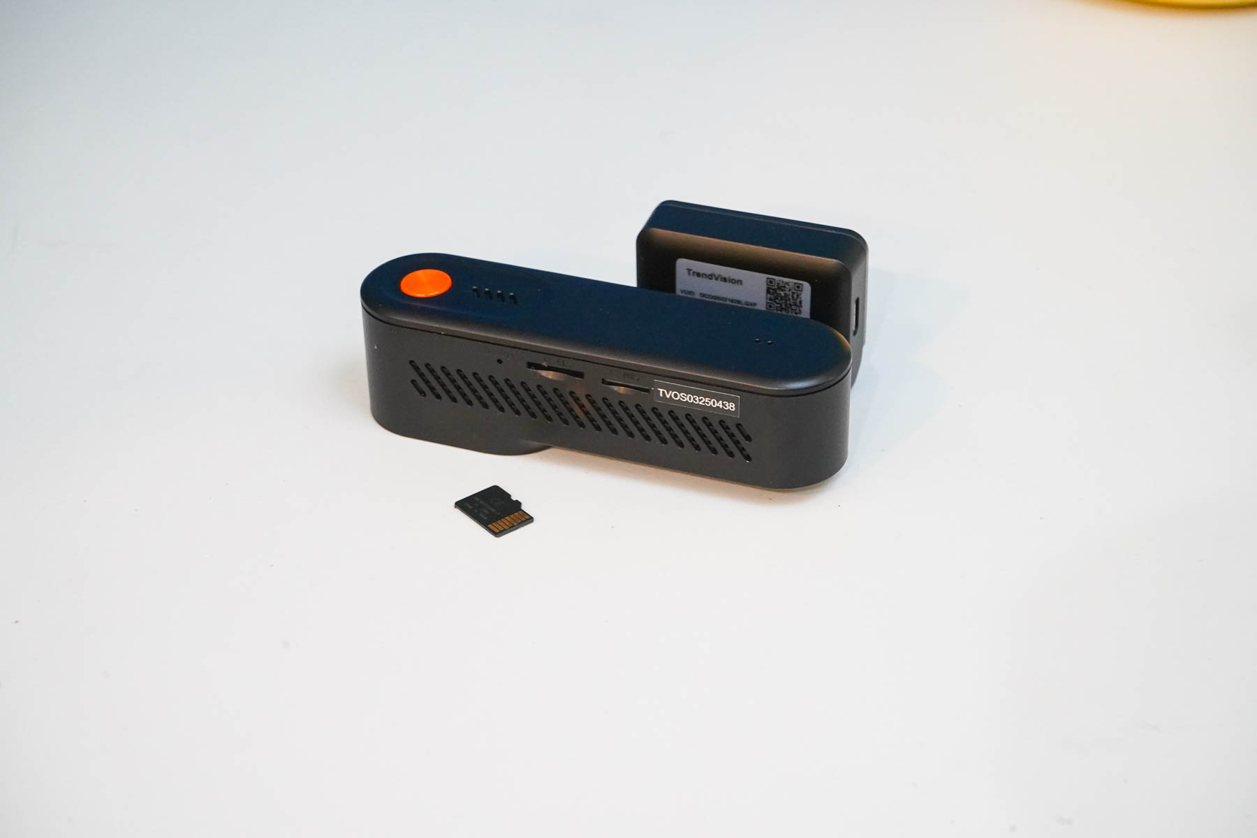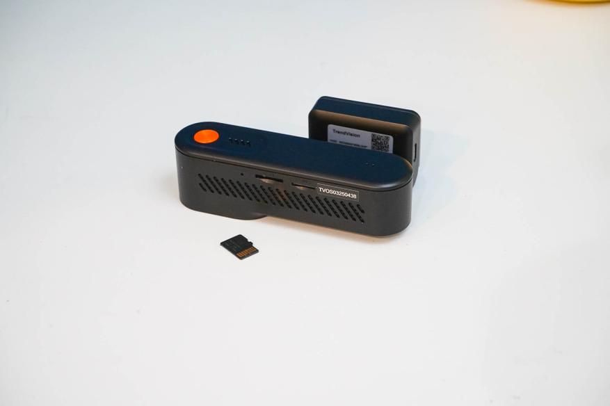 Для корректной работы видеорегистратора потребуется nano-sim карточка, а также карта памяти для хранения роликов (формат MicroSD или MicroSDXC). Оба слота рядом, установка карт не сложная — указана ориентация карточек. Также обращаю внимание, что в основании кронштейна размещает QR код (уникальный номер устройства), который потребуется для подключения к приложению.
