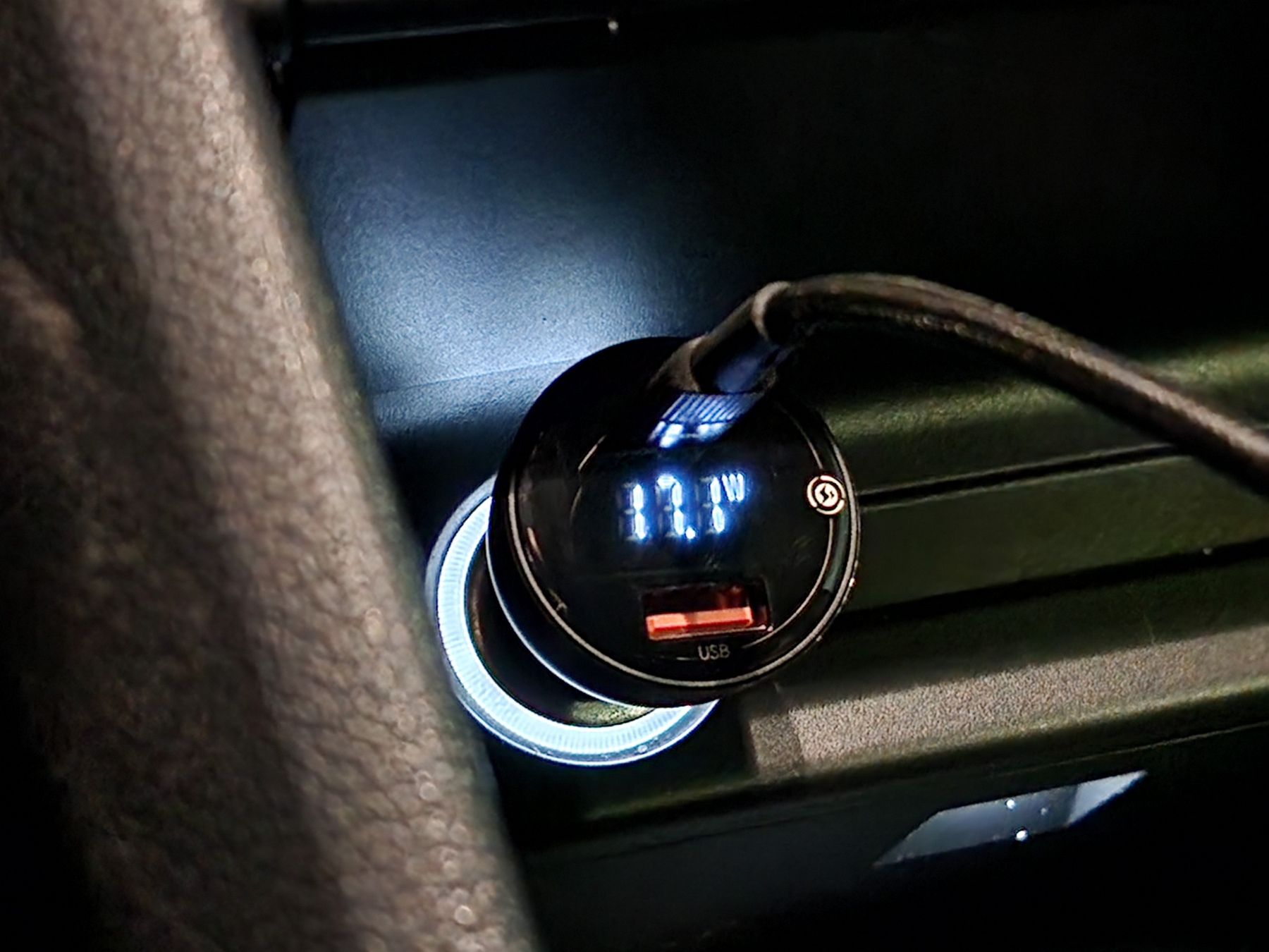 Секретов подключения к разъему автомобильного прикуривателя — нет. Просто подстыковываем и пользуемся. В моём случае нужно извлечь саму вставку прикуривателя, которая служит для нагрева (убираю в перчаточный ящик, чтобы не потерять). Укажу на удобный момент — зарядка показывает напряжение аккумулятора. В момент создания фото автомобиль был заведен, работал генератор и напряжение было 14.6 Вольт. Вполне можно таким образом контролировать разряд автомобильного аккумулятора, предотвращая критический разряд.