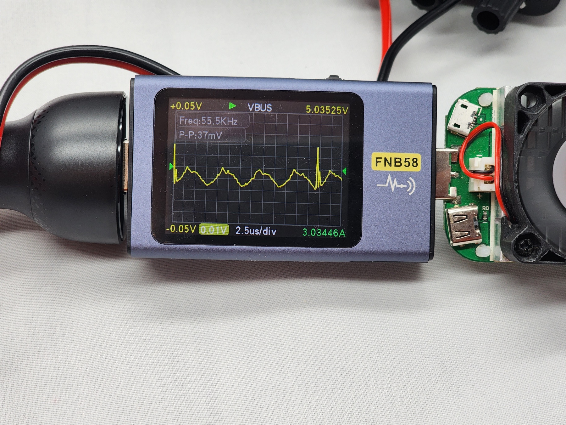 Есть пульсации на холостом ходе (без нагрузки) и под средней нагрузкой (3 Ампера), но небольшие (до 40 мВ). Тестер определяет частоту ШИМ (200-400 кГц в зависимости от режима) и гармоники.