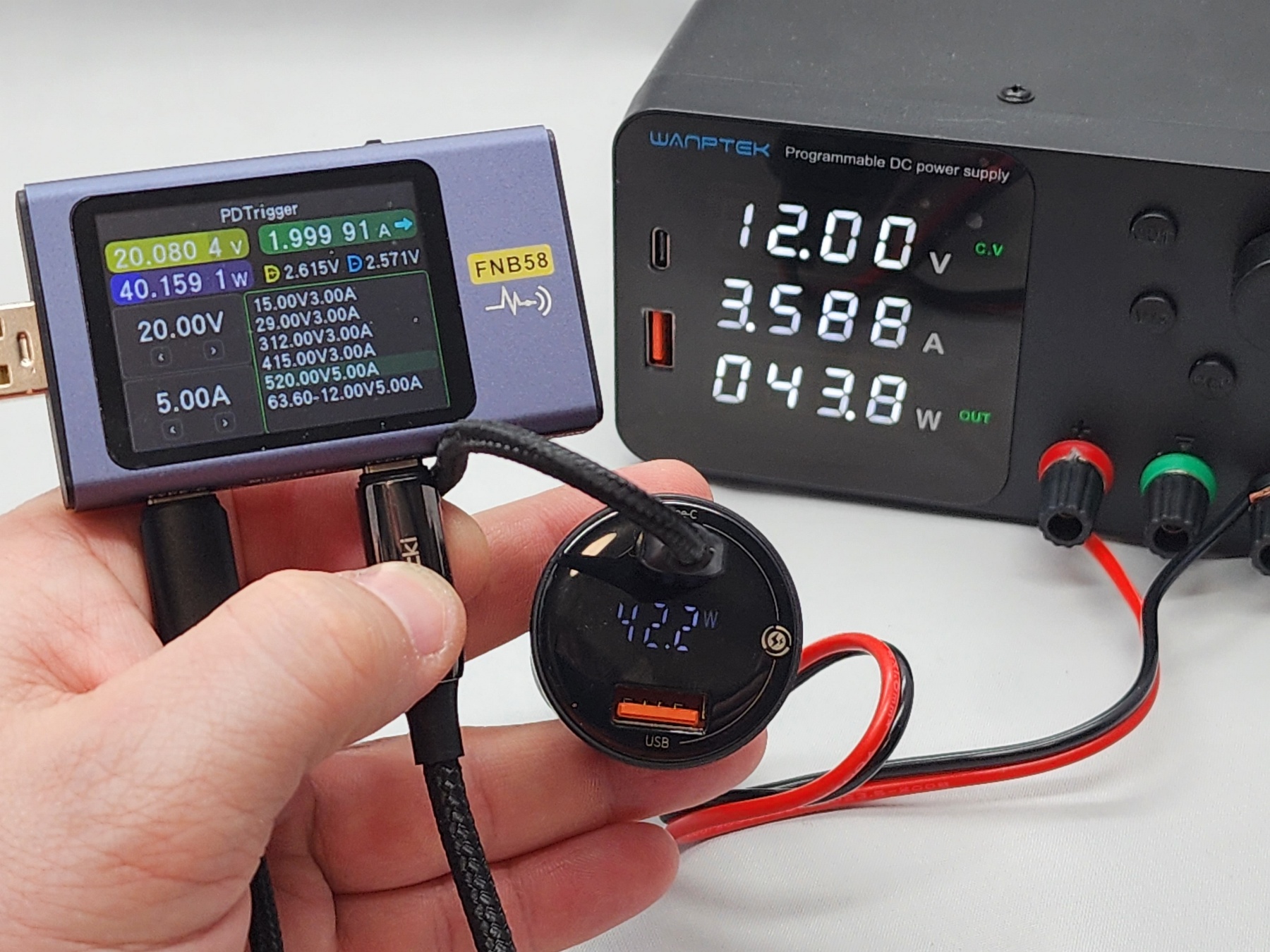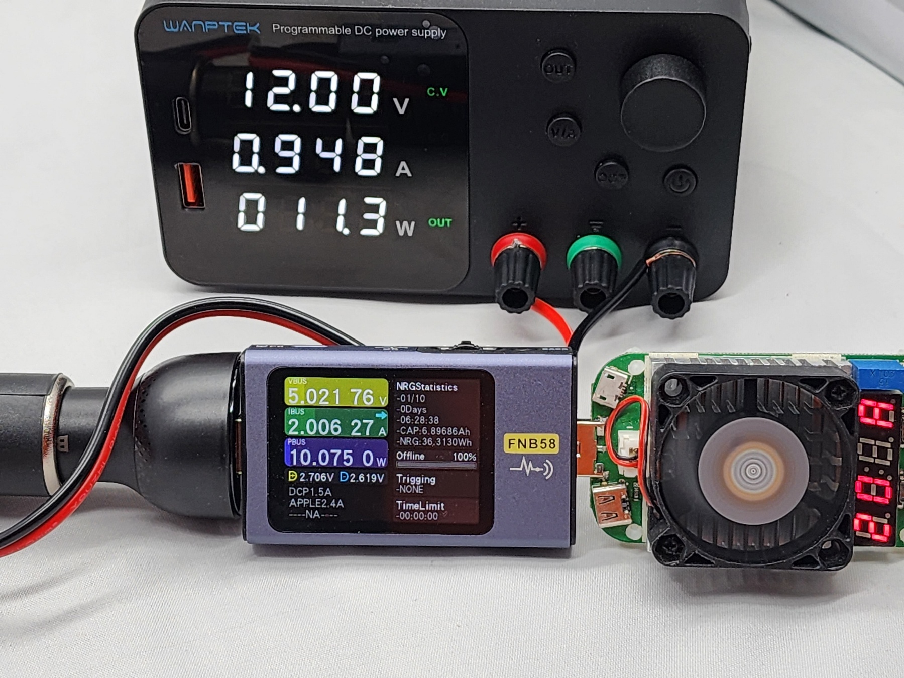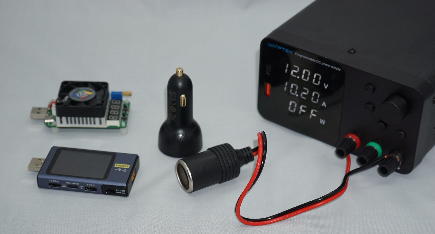 Довольно интересно, как поведет себя данное АЗУ на предельных мощностях, да и в целом, при штатной работе. Собираю вот такой небольшой стенд для проверки основных параметров. Использую адаптер с разъемом, как для автоприкуривателя, устанавливаю 12.0 Вольт на выходе лабораторного источника питания, а также буду использовать электронные нагрузки/тестер для проверки параметров.