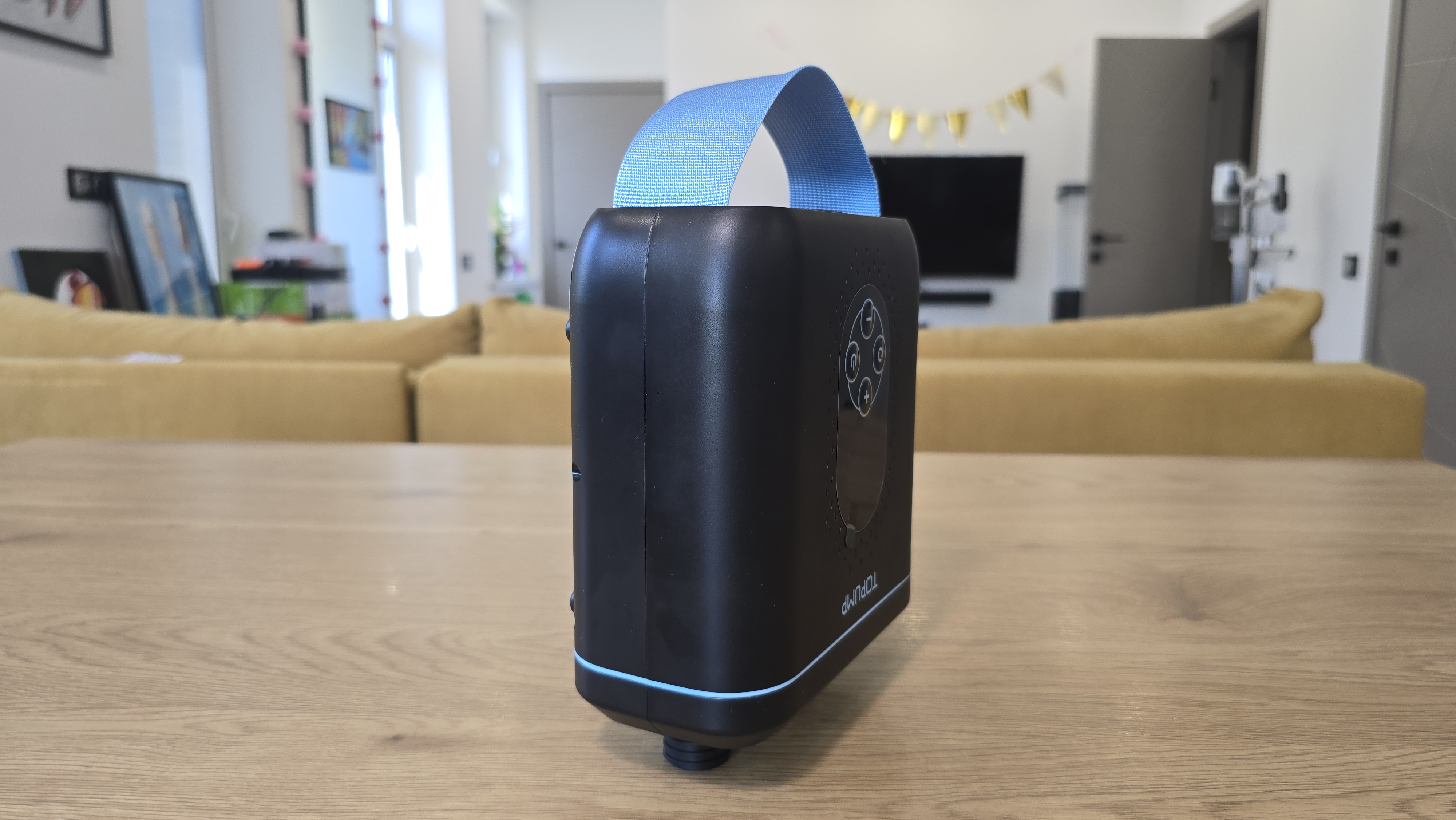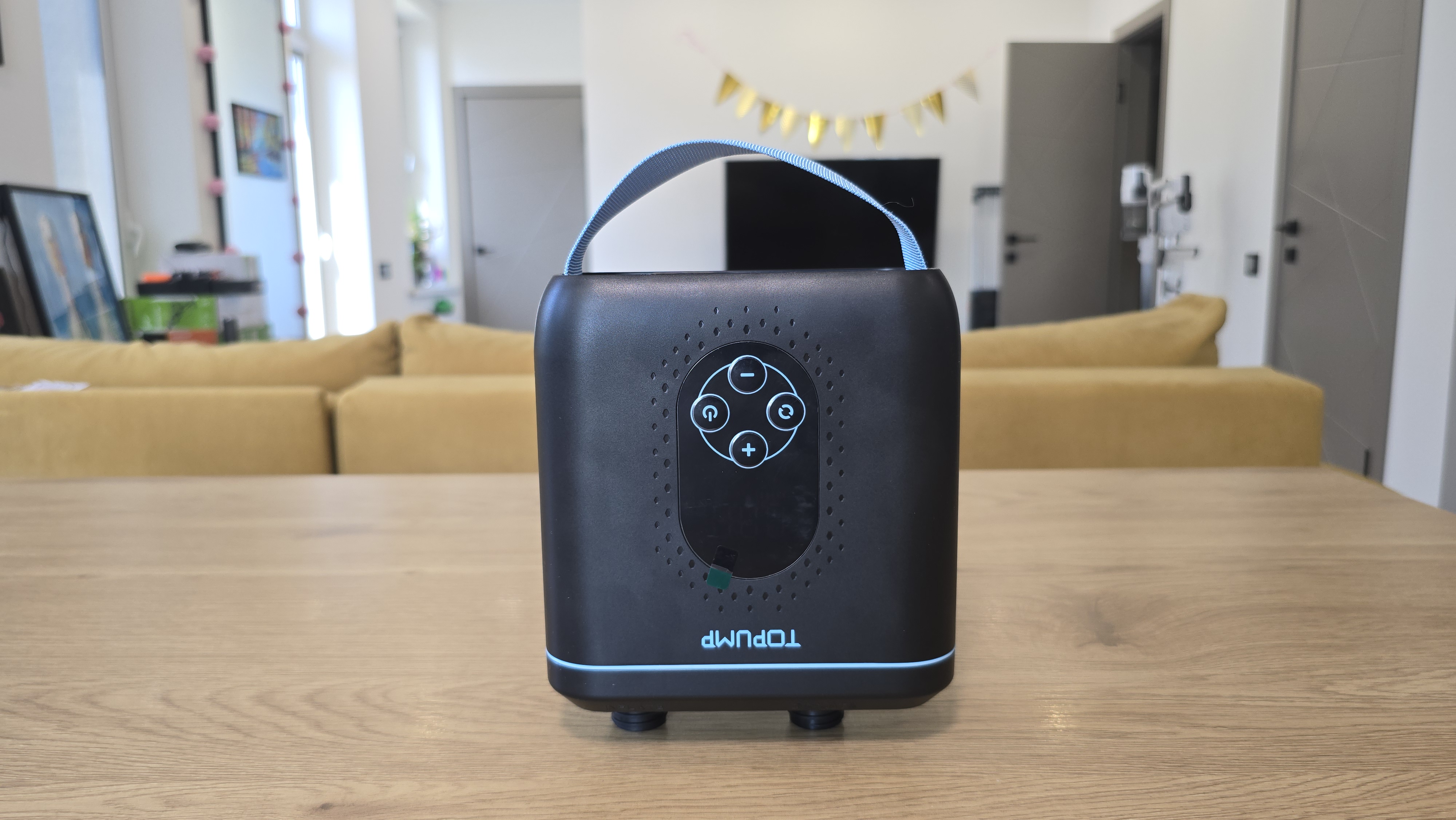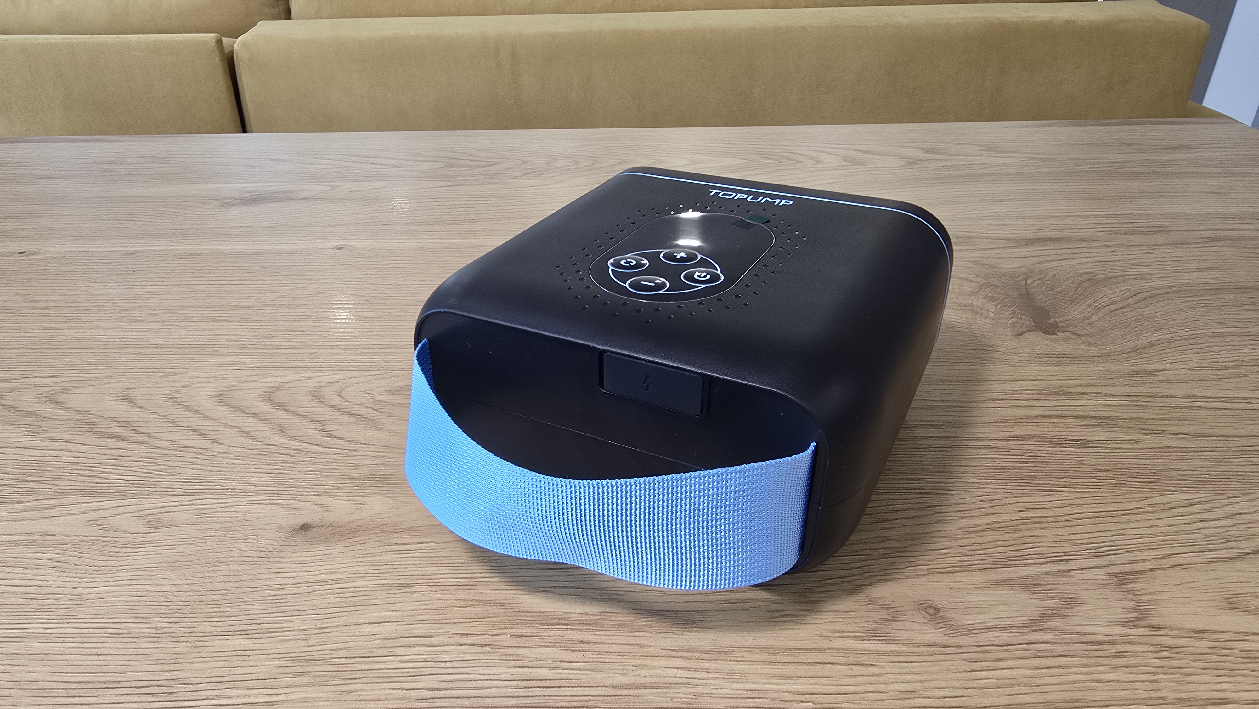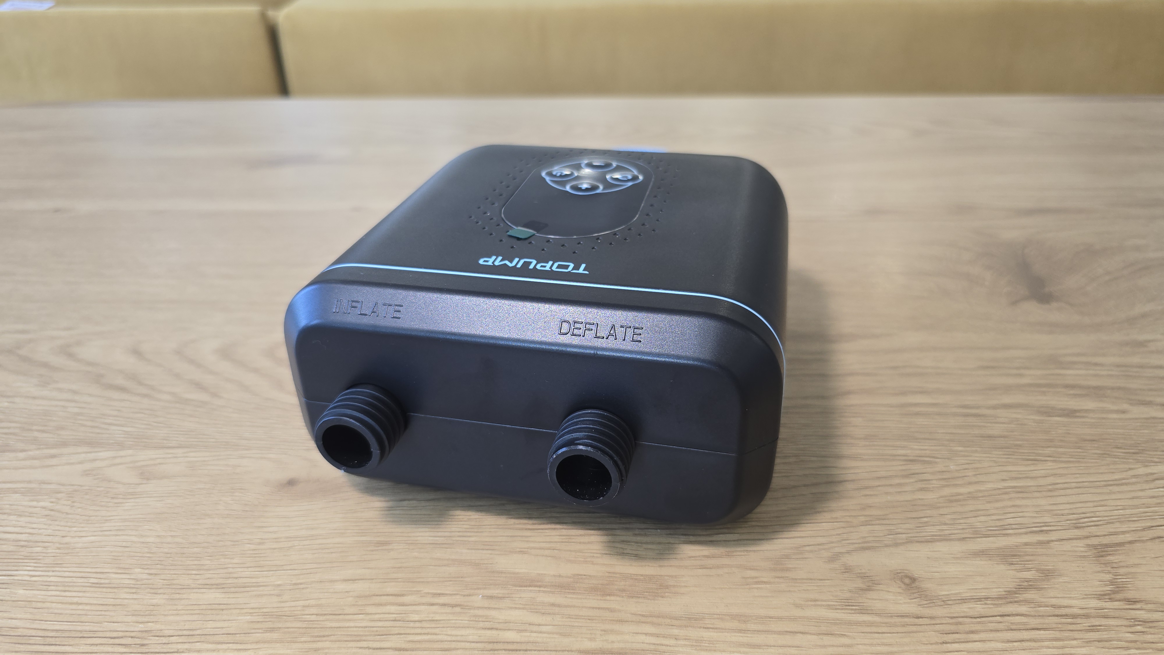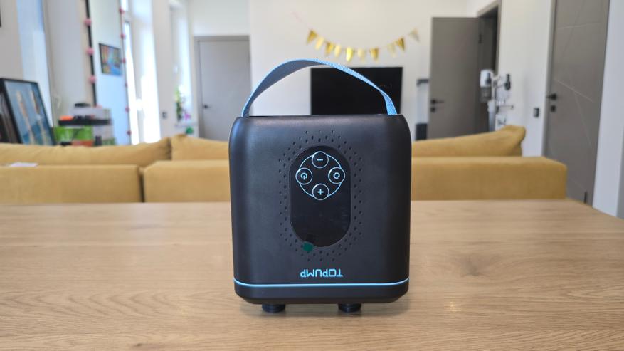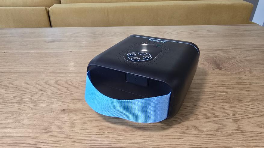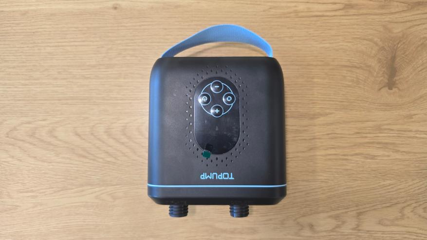 Начну с фронтальной части. В глаза сразу бросается матовая поверхность корпуса с небольшой несквозной перфорацией вокруг панели управления. Они декоративные, выглядят аккуратно. Центральное место занимает овальное окно с панелью управления. Управление реализовано с помощью четырех кнопок: «+» и «-» для регулировки давления, кнопка питания, а также клавиша переключения режимов и единиц измерения — они обозначены простыми пиктограммами и подписей не требуют. Над экраном расположена надпись «TOPUMP».