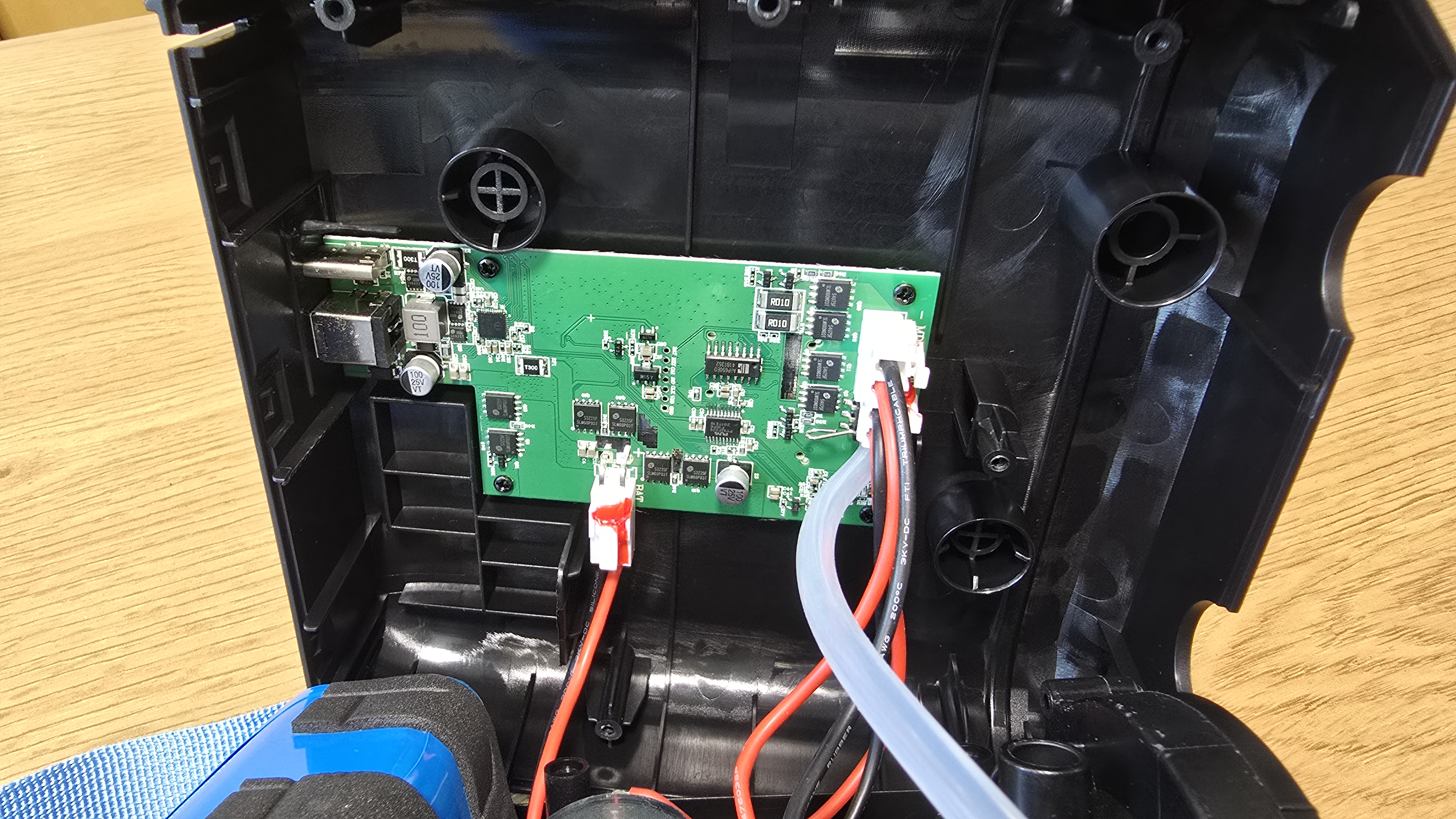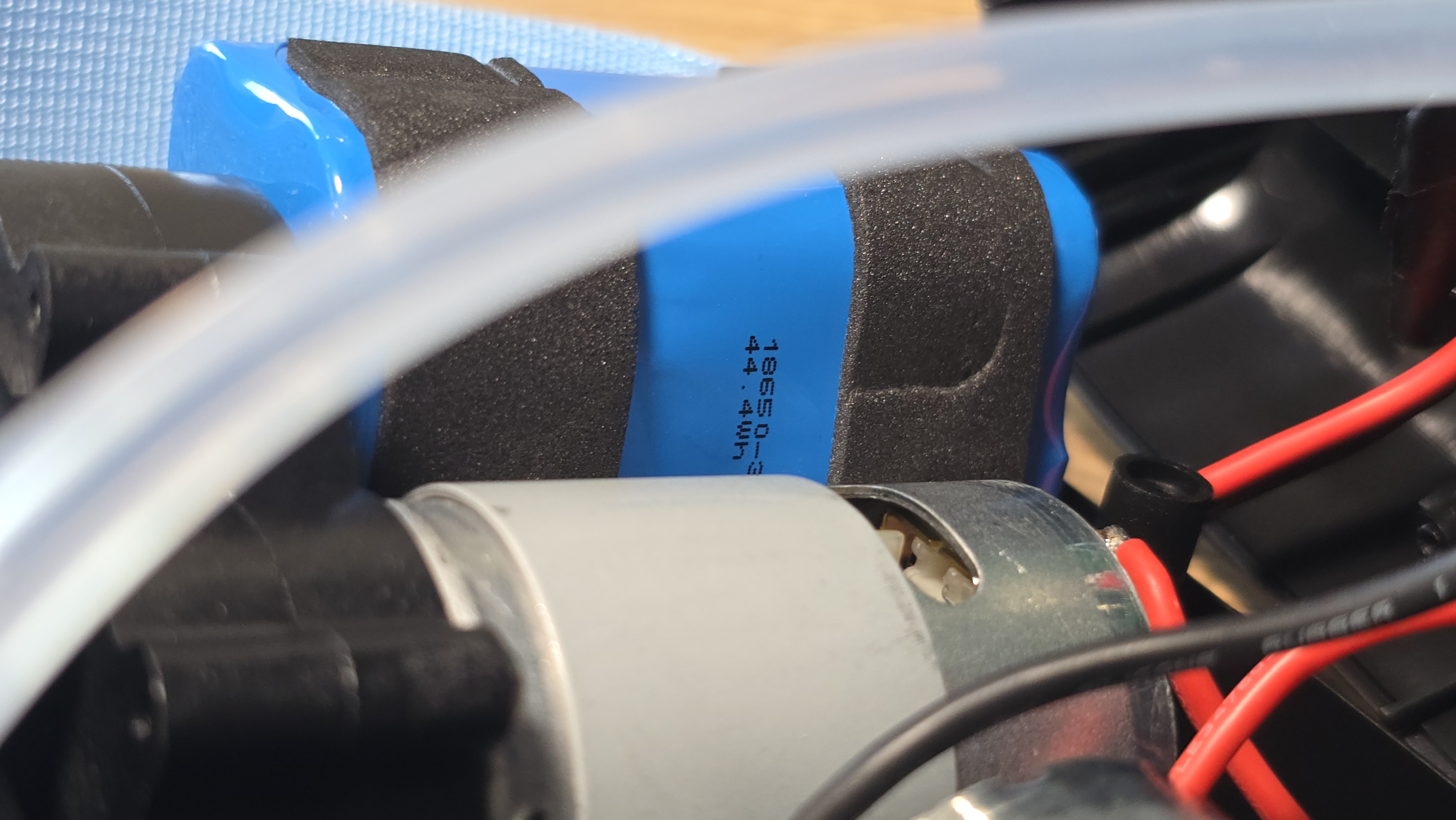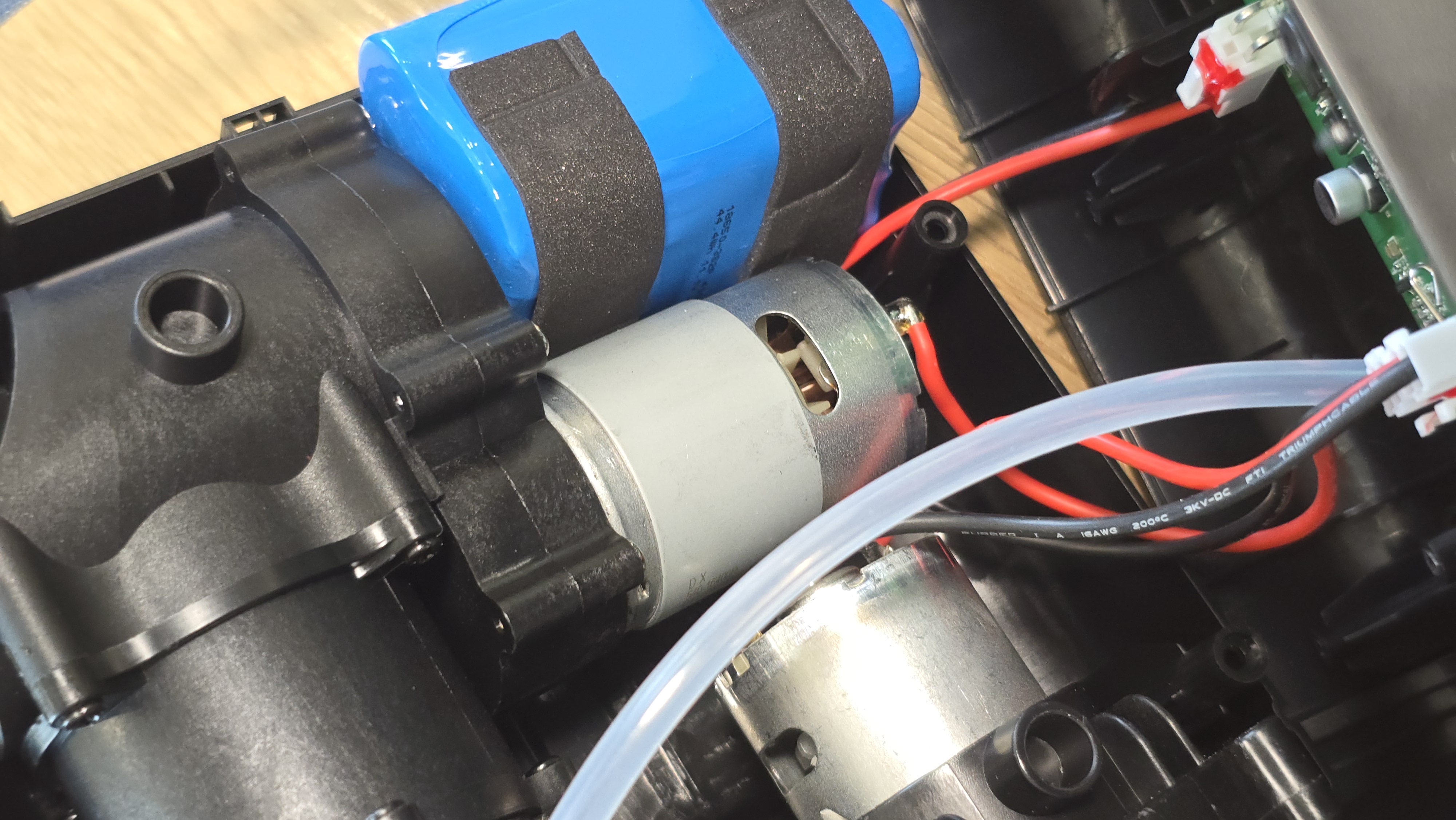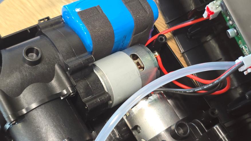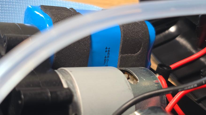 Внутреннее пространство корпуса организовано достаточно плотно. В верхней части установлена аккумуляторная сборка на базе литий-ионных элементов формата 18650. Аккумулятор собран по схеме 3S2P, то есть три последовательно соединенные пары, что дает рабочее напряжение 11.1 В и суммарную энергию 44.4 Втч при заявленной емкости 4000 мАч. Для фиксации применены мягкие прокладки, которые защищают элементы от вибраций и механического сдвига.