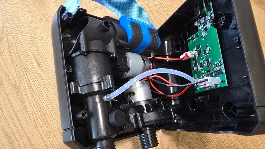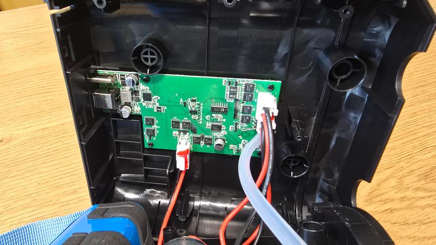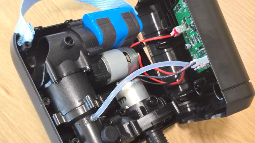 Работает устройство либо от встроенного аккумулятора, либо от внешнего источника питания. Есть два варианта подключения: через разъем USB Type-C и через DC 12 В, через комплектный адаптер под прикуриватель автомобиля. Заявлена поддержка быстрой зарядки по протоколу QC 3.0, с напряжением на входе от 5 до 15 В. При работе от автомобильной сети рекомендуется запускать мотор, чтобы избежать просадки напряжения. Если насос используется от батареи, то перед длительным хранением его необходимо полностью зарядить и подзаряжать каждые несколько месяцев.