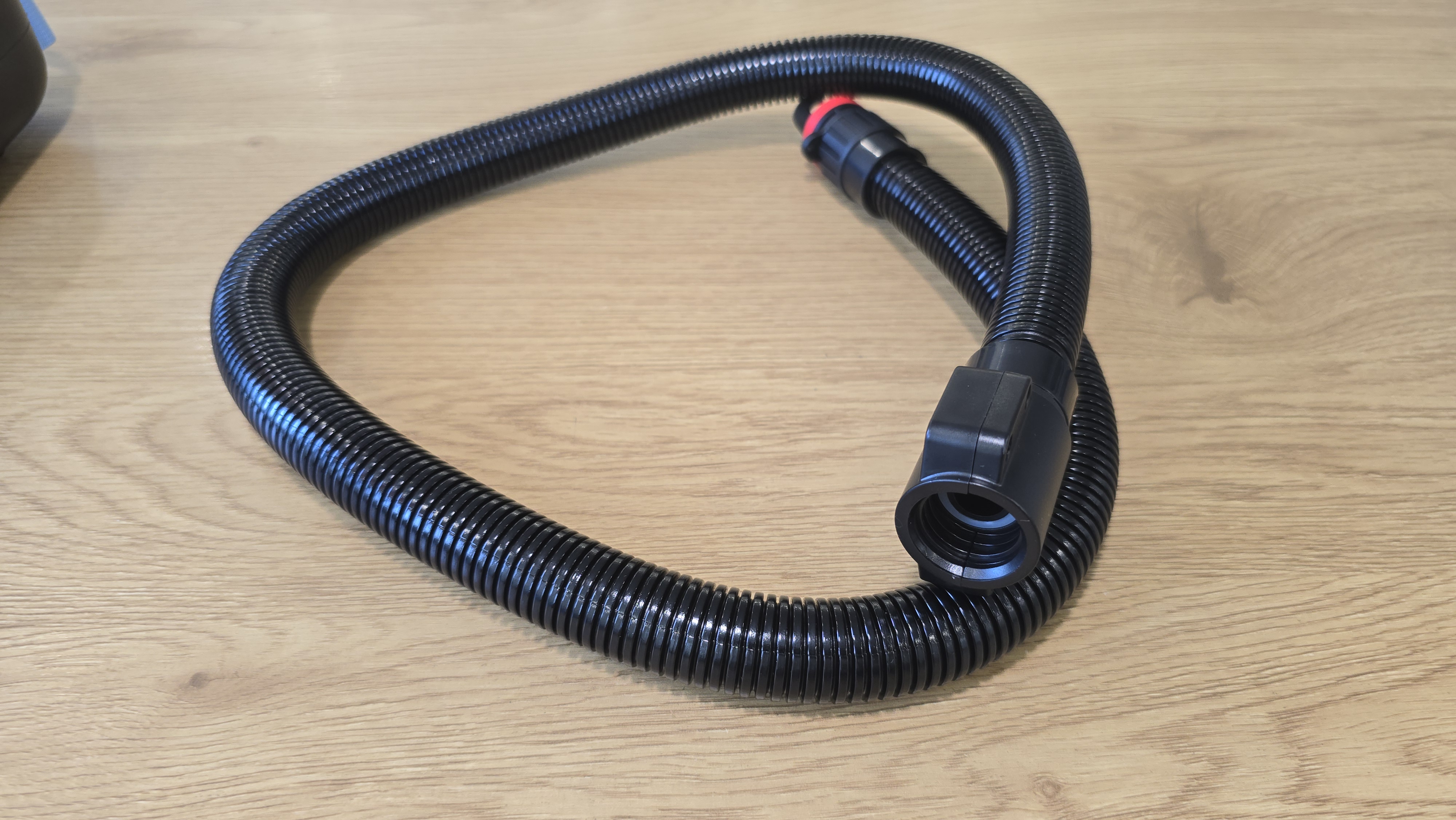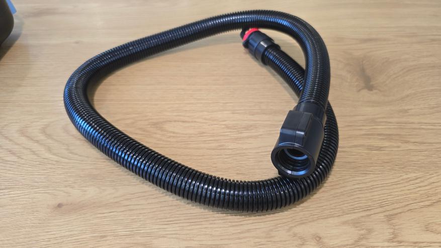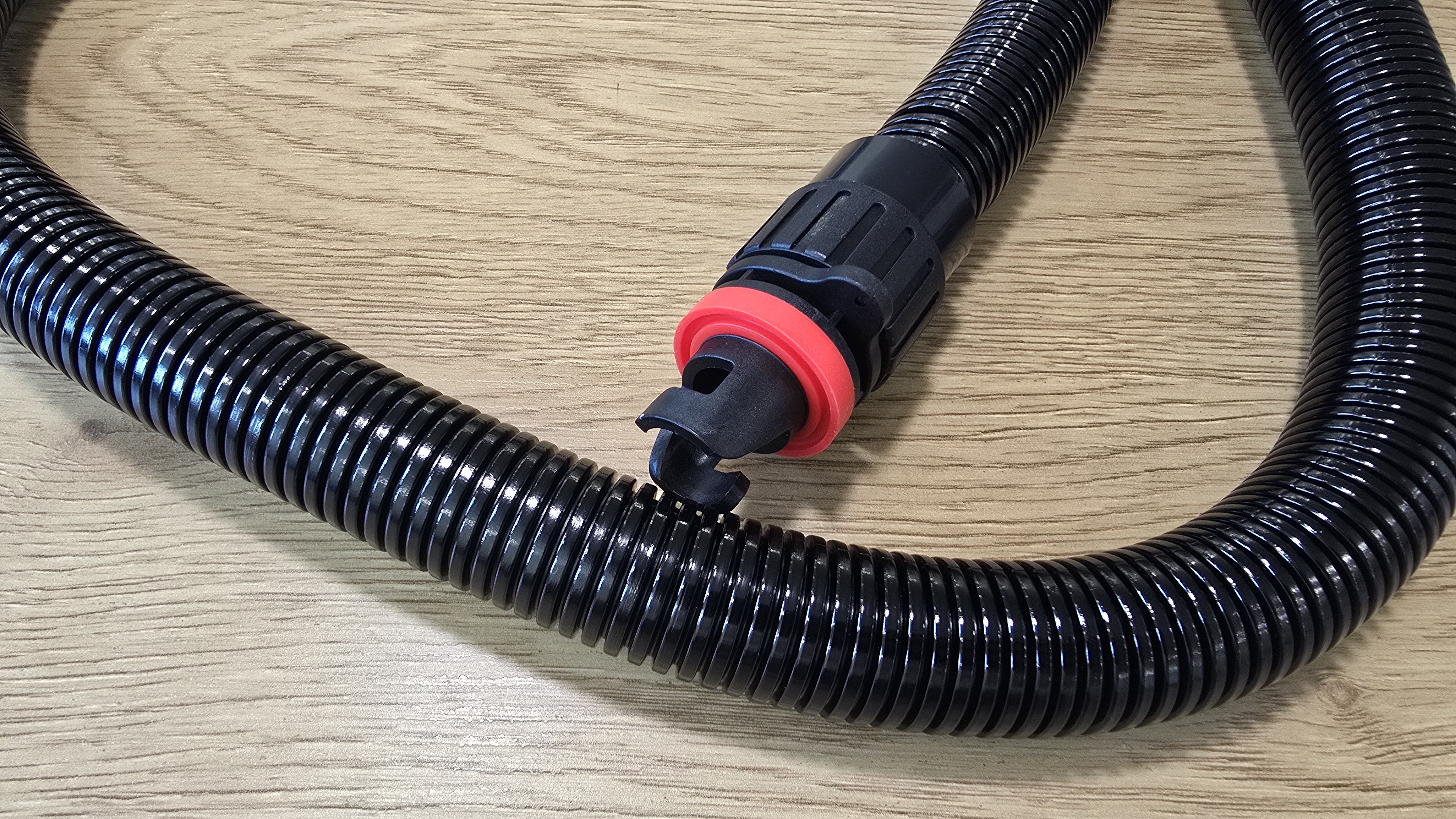 Шланг выполнен из плотного гофрированного пластика, хорошо сопротивляющейся изгибам. По ощущениям он довольно упругий, но не жесткий, при использовании не ломается и не перегибается в узлах. Один конец оснащен системой фиксации с поворотной защелкой и ярким уплотнительным кольцом. Оно заметно упрощает правильную установку. Второй — с крупной накидной гайкой для подключения к выходу насоса.