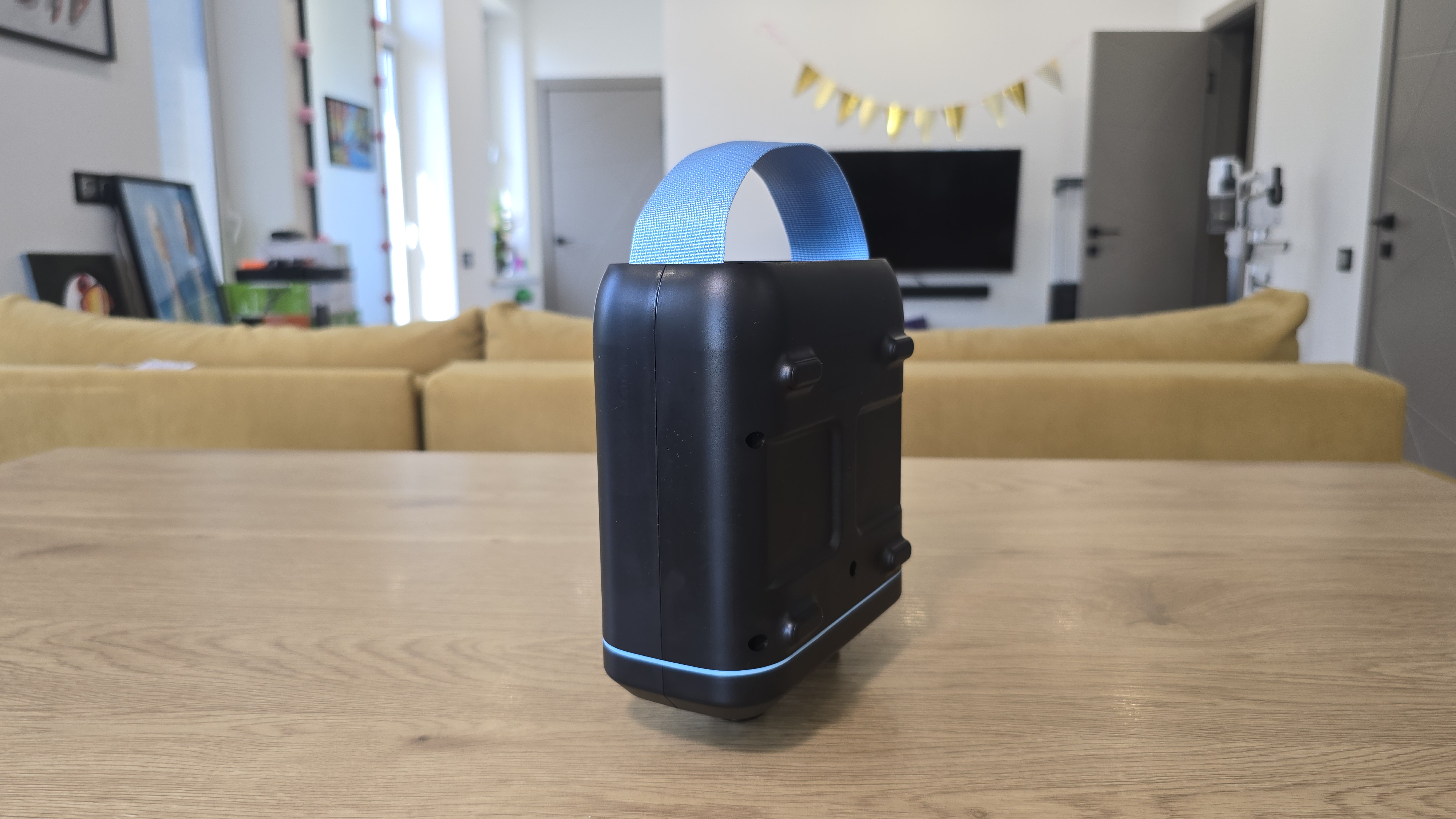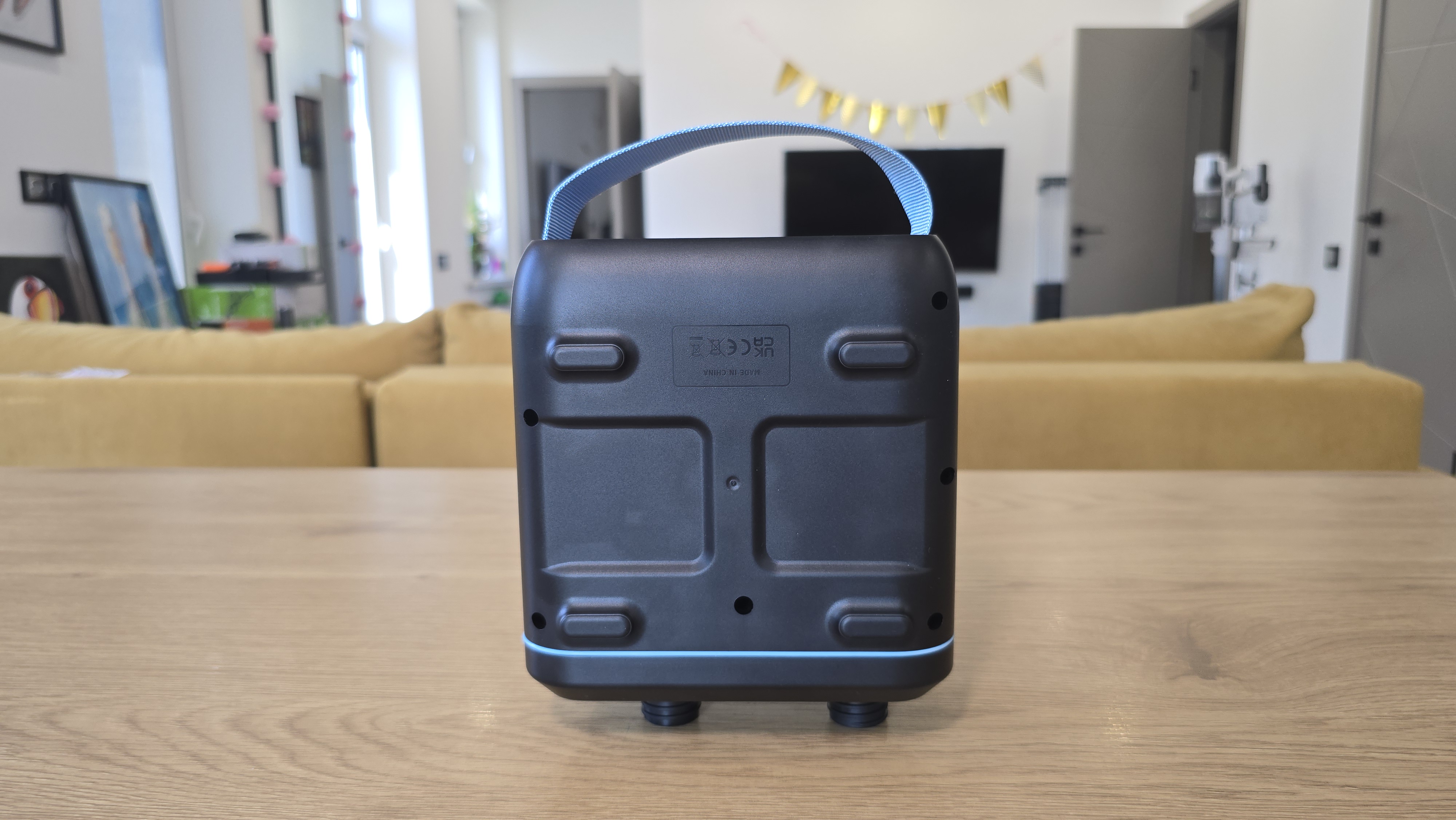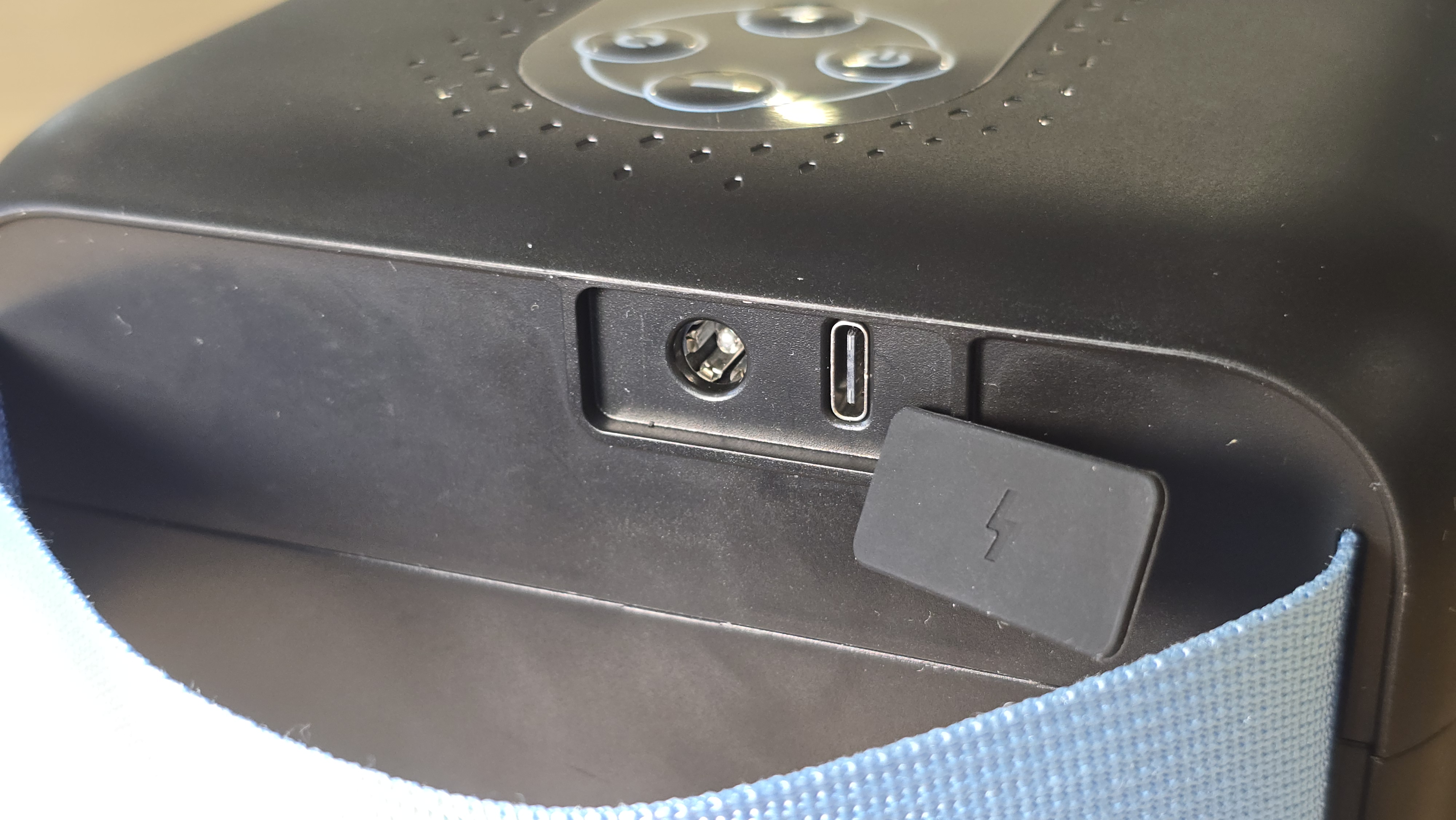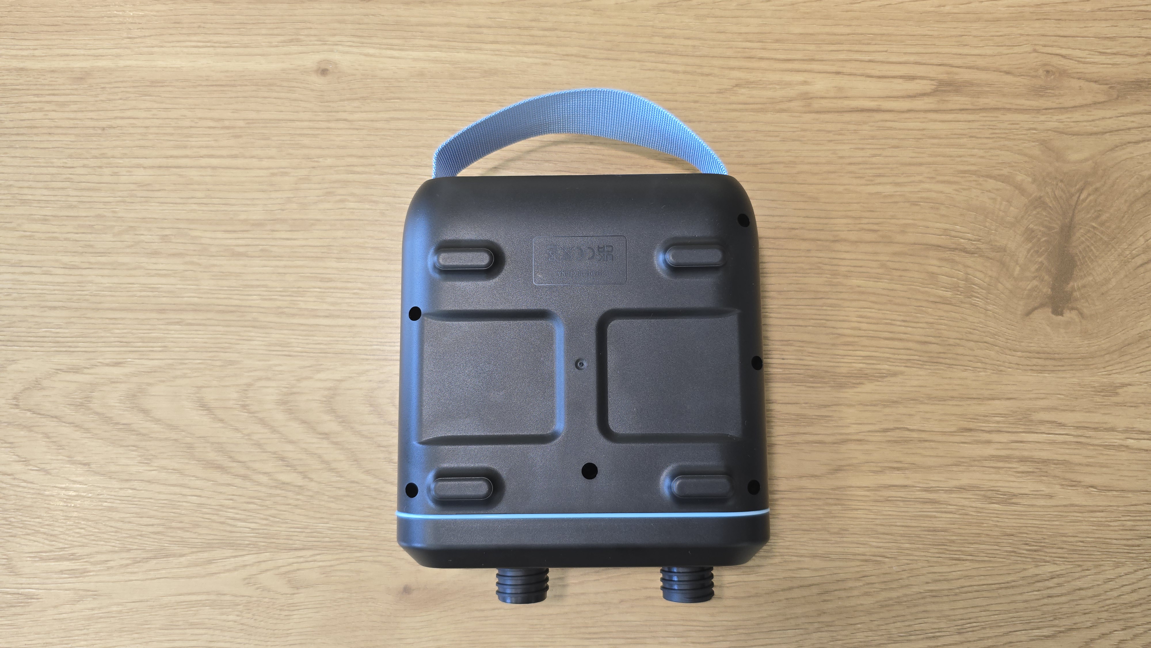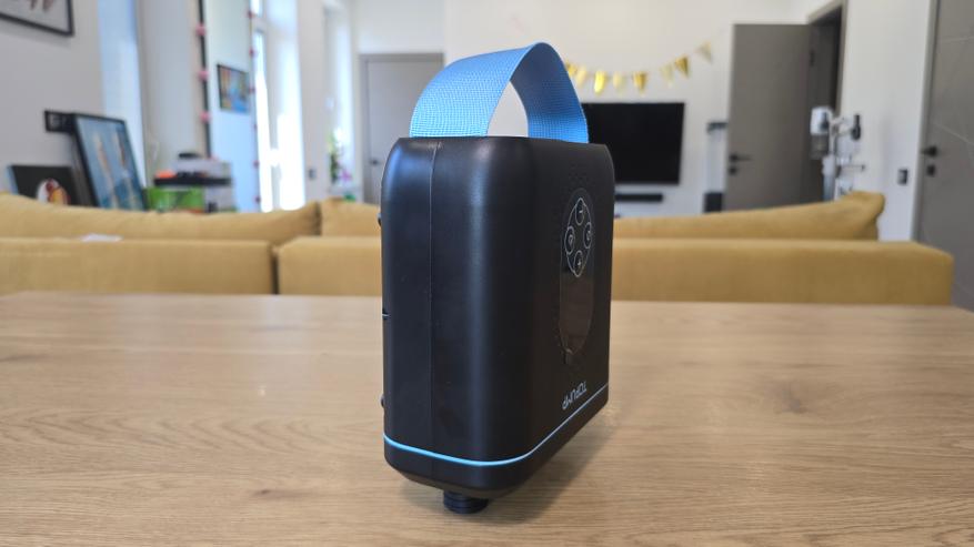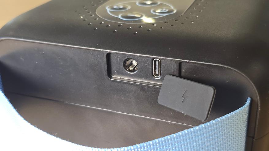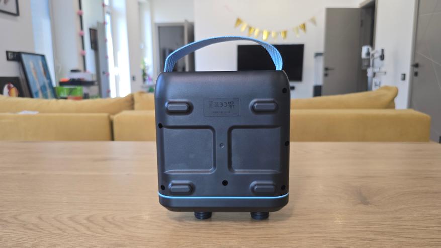 Нижняя часть корпуса гладкая, на не находится голубая текстильная транспортировочная ручка, а также отсек с портами. За силиконовой заглушкой расположены разъемы USB Type-C и дополнительный круглый порт DC 12 В.