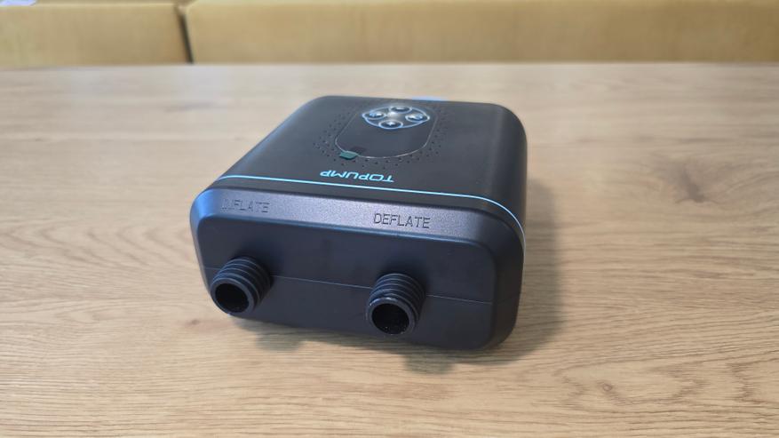 На верхней грани два порта: один для накачивания, второй для сдувания. Они подписаны мелко, но читаемо — INFLATE и DEFLATE. Оба резьбовые, с небольшим выступом. Расстояние между ними около 50 мм, шланг крепиться без проблем. Поверхность вокруг портов ровная, без лишних деталей.