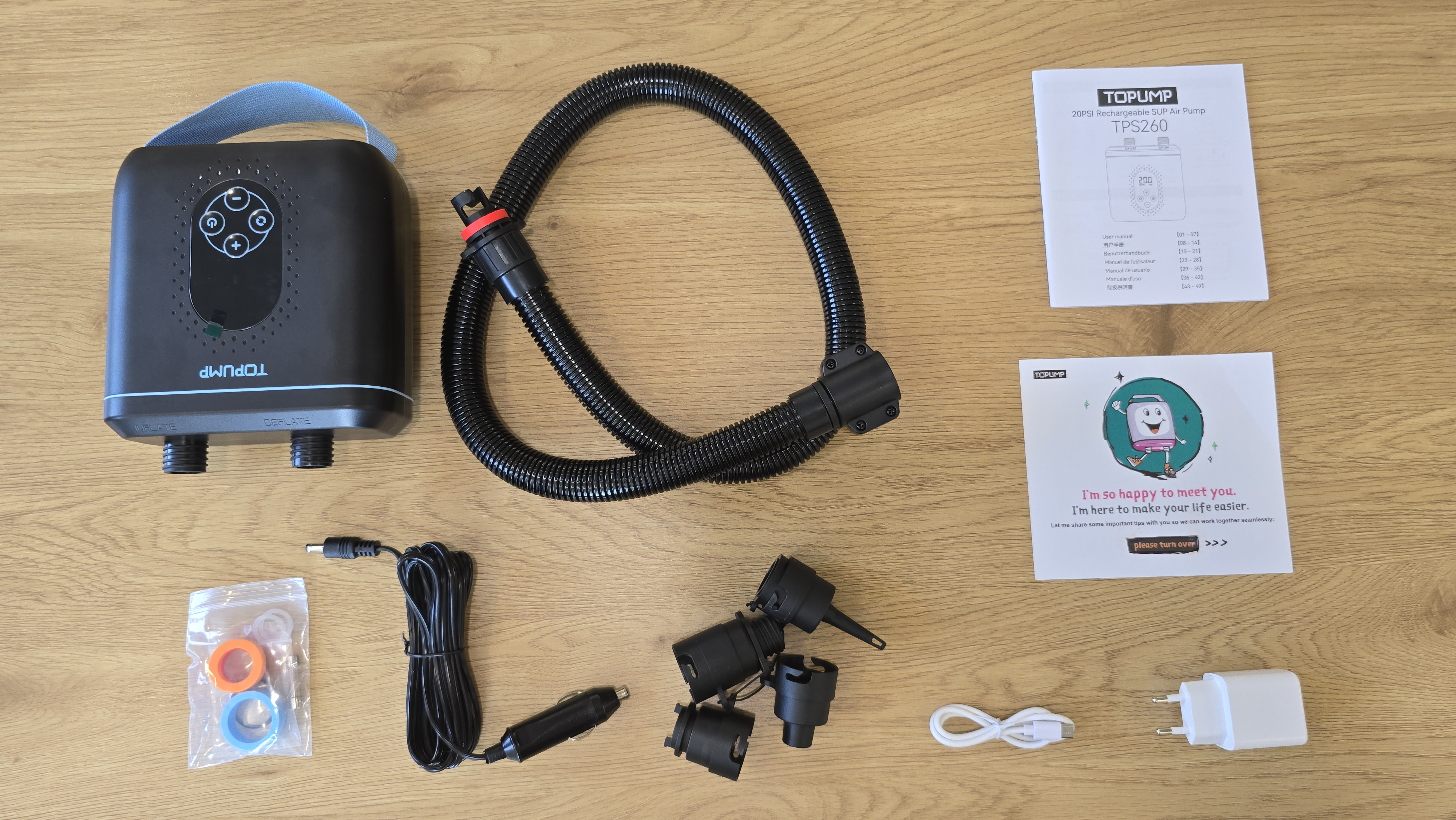 Внутри коробки находится сам насос, гибкий шланг с резьбовым соединением, кабель питания для подключения к прикуривателю, кабель USB Type-C, адаптер питания, комплект переходников, запасные уплотнительные кольца, инструкция, а также карточка с базовой информацией от производителя.