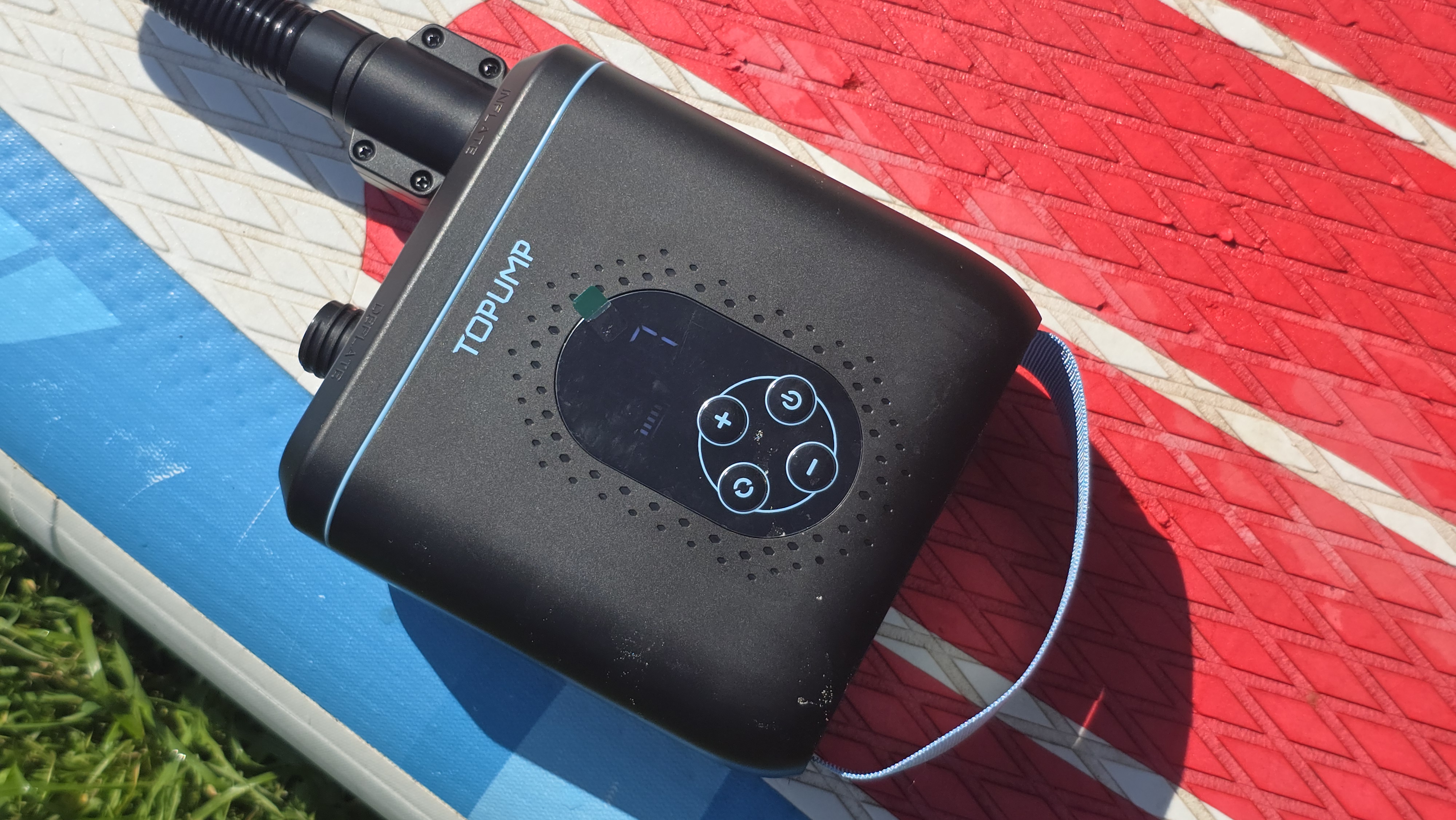 В результате полный цикл — две накачки и два сдувания — насос прошел на одном заряде, без подключения к прикуривателю. Корпус за это время нагрелся, но не критично — держать в руках можно спокойно, запаха или признаков перегрузки не было. По индикатору заряда осталось примерно одно-два деления, то есть запас на что-то легкое, вроде круга или подушки, еще был бы. Но на полноценную третью доску я бы уже не рассчитывал — особенно если она такого же объема.