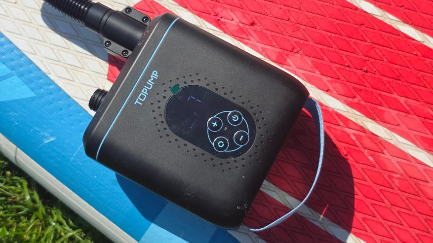На один SUP уходит около 9-10 минут. Зарядка через комплектный адаптер проходит с мощностью около 19-20 Вт и занимает примерно 4.5 часа. Использовать насос во время зарядки нельзя — питание отключается при запуске мотора. Корпус устройства компактный и удобный.