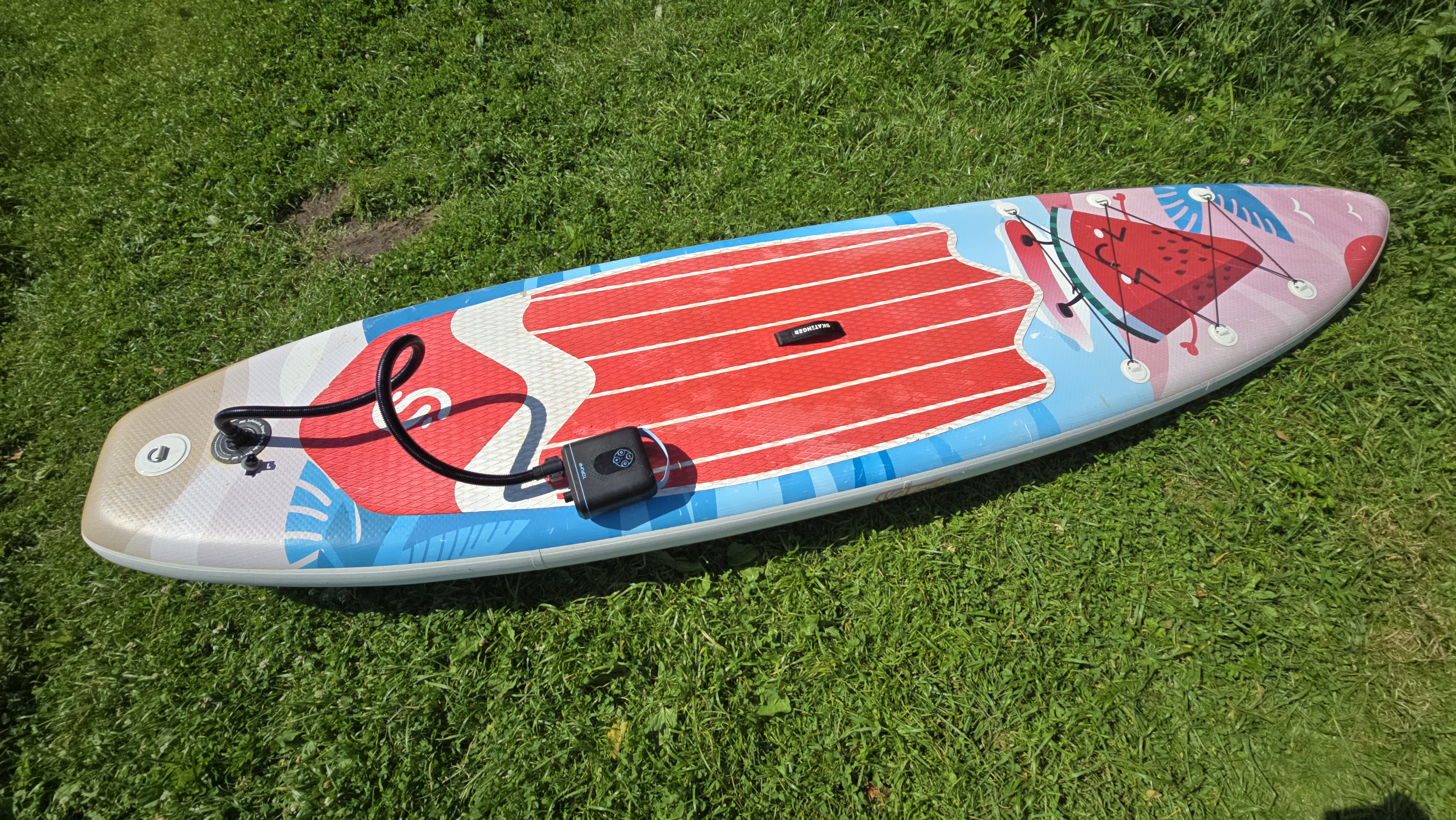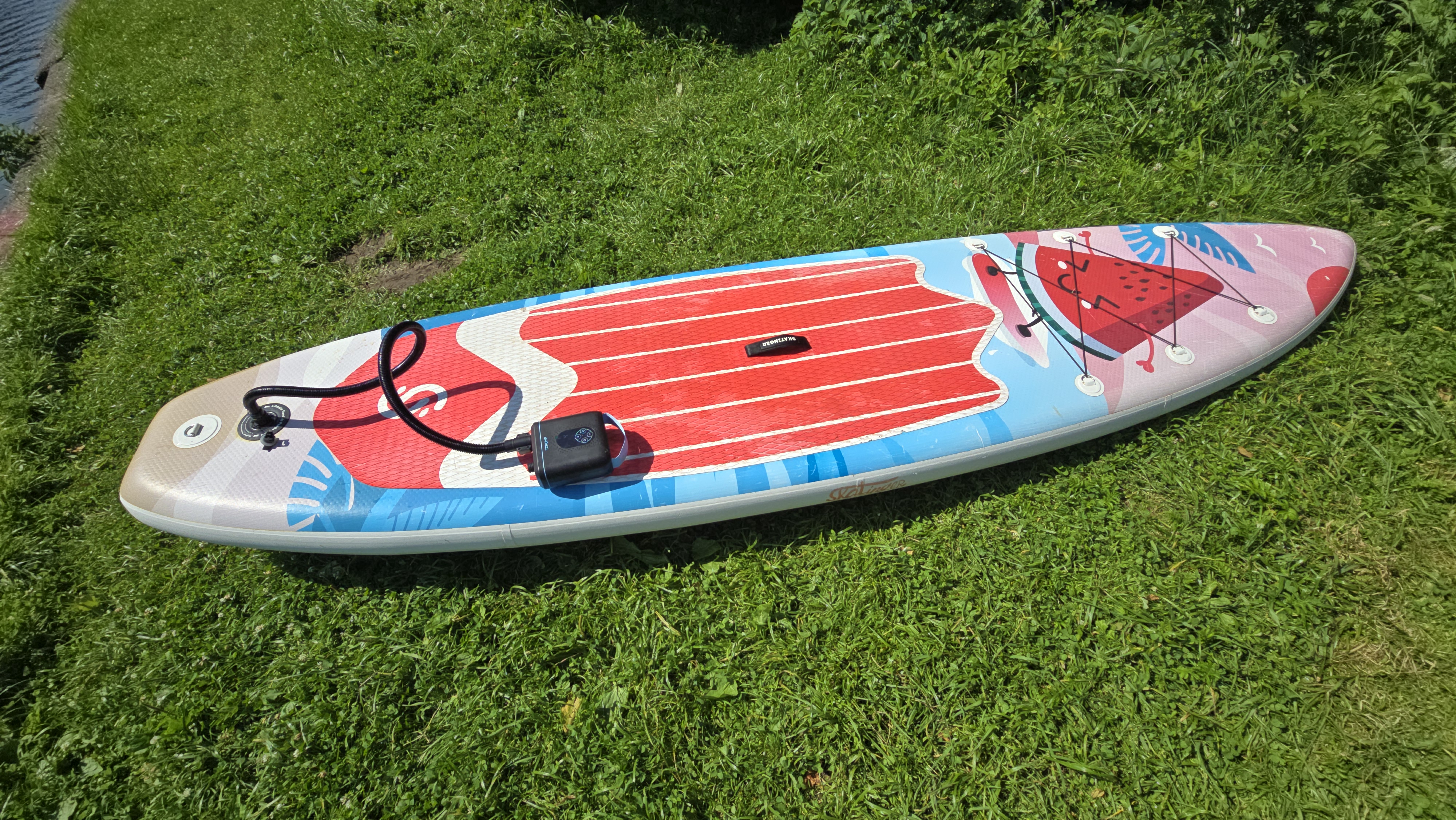 Теперь переходим к практическим испытаниям. Для проверки автономной работы я выбрал два одинаковых SUP-борда — Koi длиной 350 см. Это не самые компактные модели, у них довольно приличный объем, поэтому такой тест позволяет понять, насколько встроенного аккумулятора хватает в реальных условиях, а не на бумаге. Насос предварительно зарядил до полного — индикатор показывал все деления.
