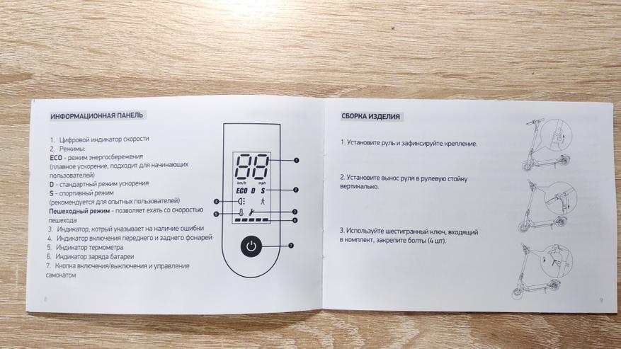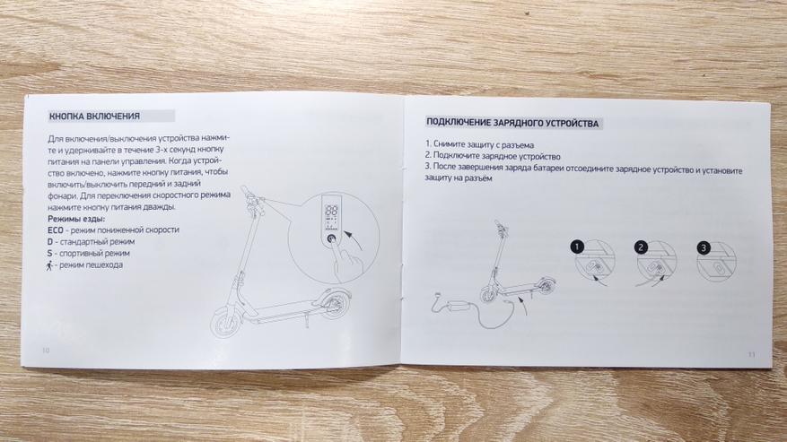 Доступно четыре режима работы — ECO, который плавно набирает скорость и ограничивает максимальную до 15 км/ч, D — до 20 км/ч, S — где ограничения скорости нет, это самый быстрый и резвый режим, есть еще пешая прогулка до 5 км/ч. Кроме того при удержании акселератора в одном положении в течение 6 секунд, активируется круиз-контроль, отключается он любым повторным нажатием, либо нажатием на тормоз. Все эти режимы отображаются на экране, как и скорость и уровень заряда. Стопы и фара присутствуют.