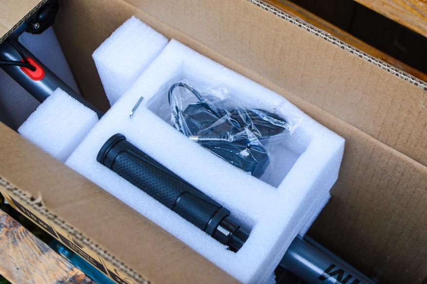 Электросамокат поставляется в картонной коробке с упоминанием основных ключевых возможностей в виде небольших пиктограмм. К сожалению, ручек для переноски не предусмотрено, а их очень не хватает, так как общий вес порядка 12 кг.