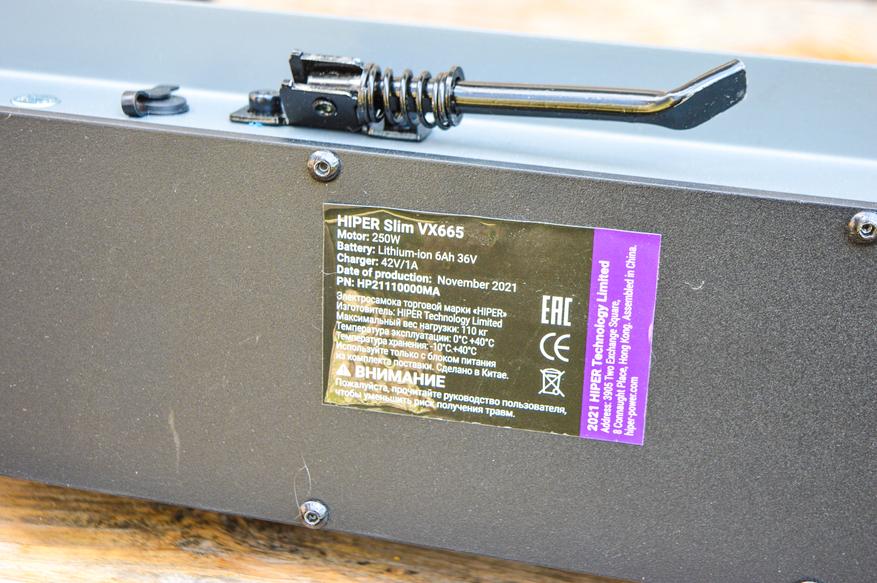 Дека широкая и довольно длинная. Размеры 450*140 мм. Почти вся верхняя поверхность покрыта шершавым материалом, внешне напоминающим наждачную бумагу. Во время движения ноги устойчивы к перемещению по деке. На нижней части информационная наклейка, откидная металлическая ножка, а рядом с ней заглушка для подключения питания. Пластиковая крышка под которой разместилась электроника и аккумуляторная батарея имеет дополнительное уплотнение. Да, нижняя крышка пластиковая и удерживается несколькими саморезами в металлическом основании. Вроде может показаться не надежно, но поехать по не глубоким лужам можно, но в дождь эксплуатация не рекомендуется, так как БК не имеет влагозащиты.