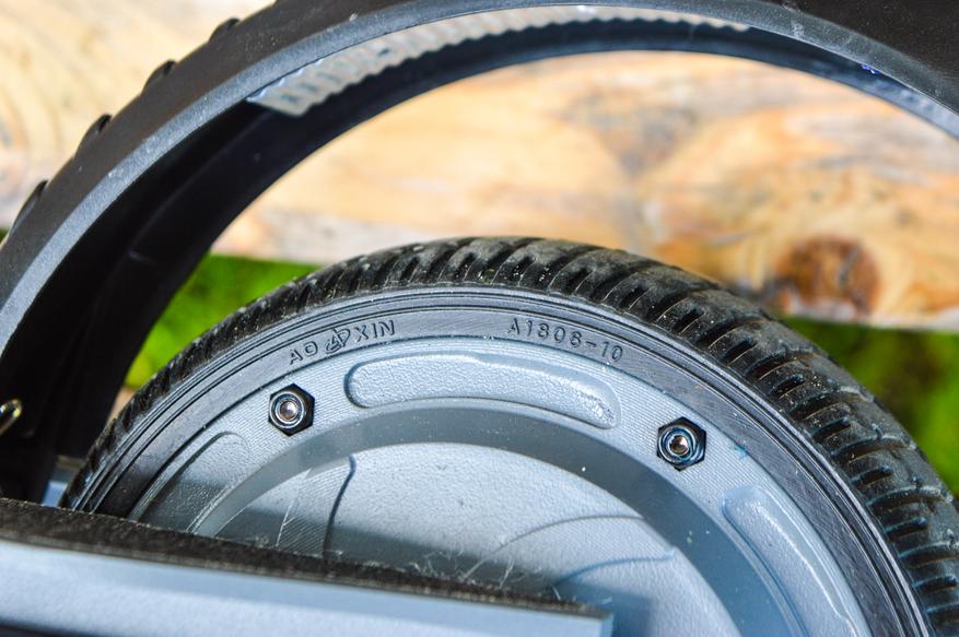 Заднее колесо аналогично переднему, но оснащено мотор колесом. Над колесом защитное крыло выполняющее функцию механического тормоза. Причем торможение идет металлической накладкой, а не пластиковой, как на многих других аналогичных гаджетах. В крыло установлен стоп-сигнал подмигивающий во время движения.