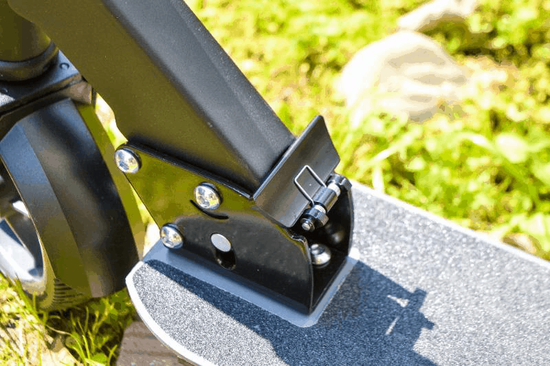 Для складывания рулевой колонки предусмотрен механизм расположенный у основания. Для этого нужно потянуть за соответствующий флажок и рулевая рейка ослабнет и пойдет в сторону деки. Для сборки потребуется лишь потянуть фиксатор и поднять рулевую рейку до щелчка. Дополнительной блокировки не требуется.