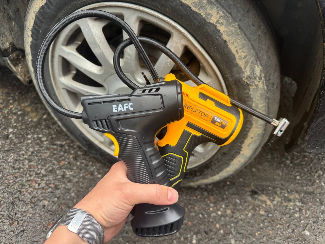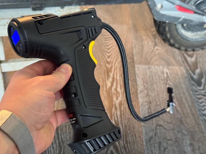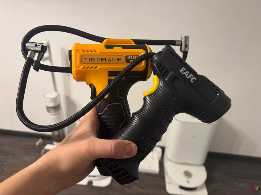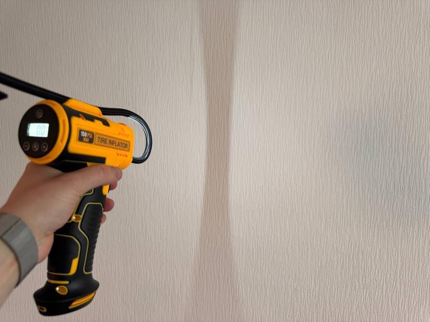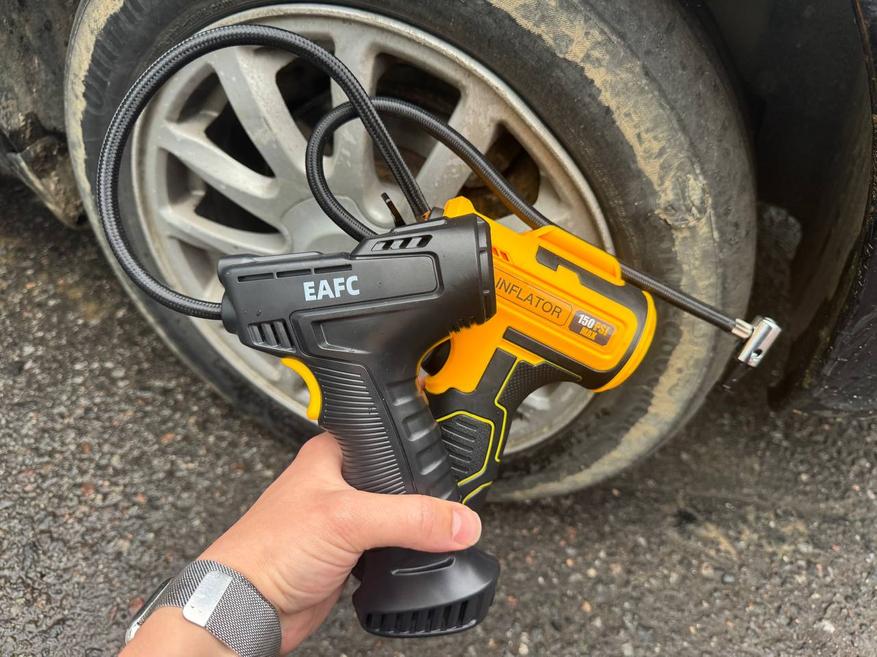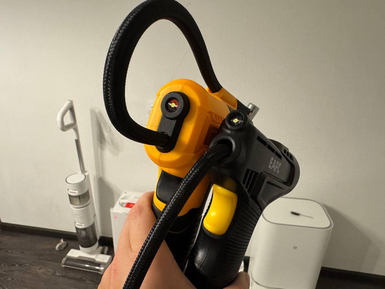 Компрессор на 2000 мАч компактный и легкий, удобный для редких локальных задач. Однако он быстро разряжается при интенсивной работе, шланг не крепится к корпусу, сам корпус из дешевого пластика, а фонарик не имеет стробоскопа.