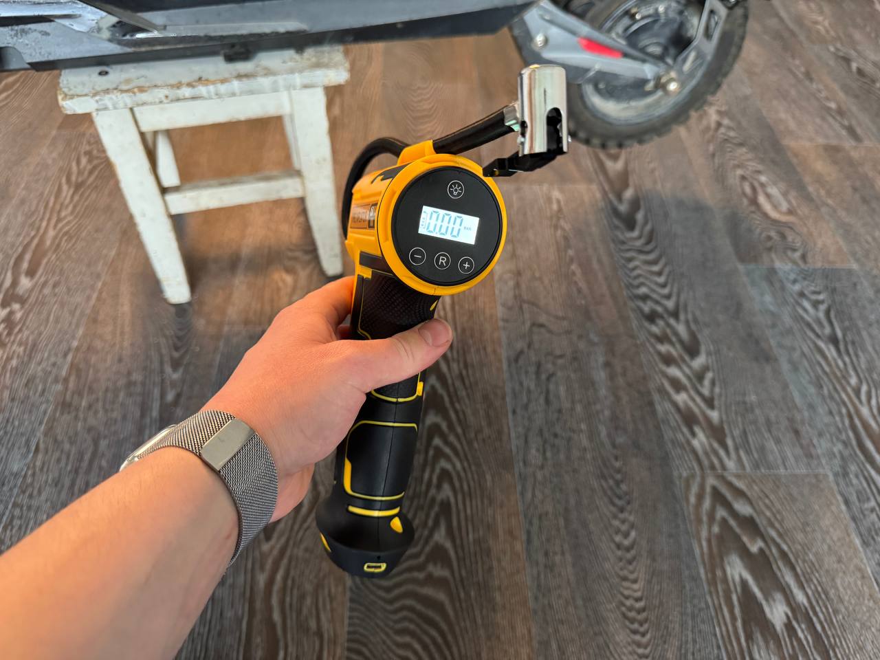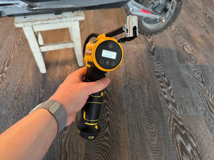Второй тест — накачка почти полностью спущенного маленького колеса электросмаоката до 3,2 бар. Здесь картина получилась более интересной. Компрессор с аккумулятором на 2000 мАч на старте начал заметно опережать старшую модель, примерно на 0,1 бар, но под конец «сдулся» и потерял мощность из-за аккумулятора, отдав первенство модели на 4000 мАч. Накачать небольшую шину маленького диаметра сложнее, чем большое колесо, и даже более производительный мотор компрессора, теряя напряжение из-за просаженного аккумулятора, проигрывает менее мощному. Время накачки составило 1 минуту 45 секунд (плюс 7-10 секунд у проигравшей модели). Cтаршая модель выигрывает за счёт выносливости: после трёх накачиваний у младшей осталось одно-два деления заряда, у старшей —три.