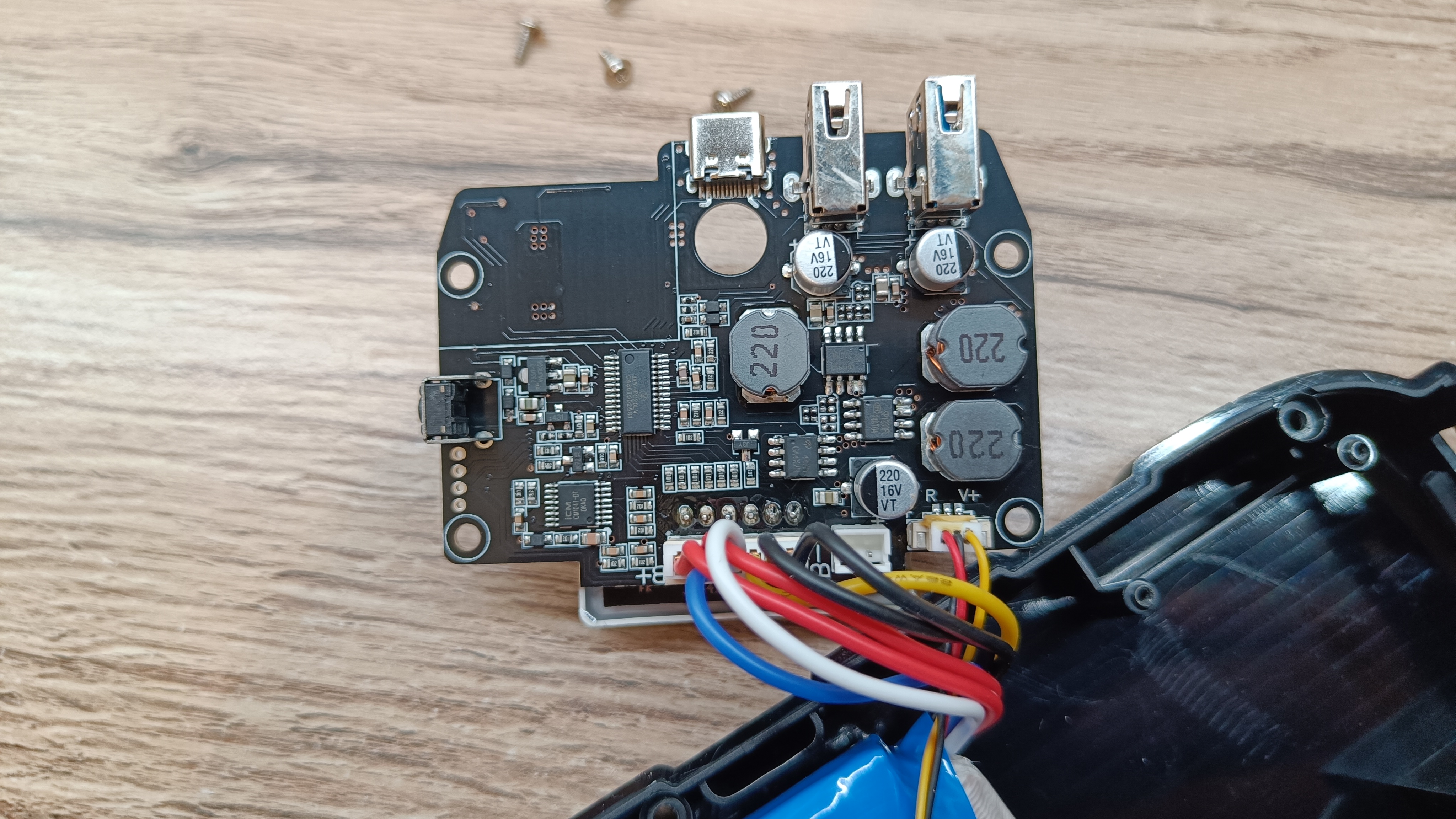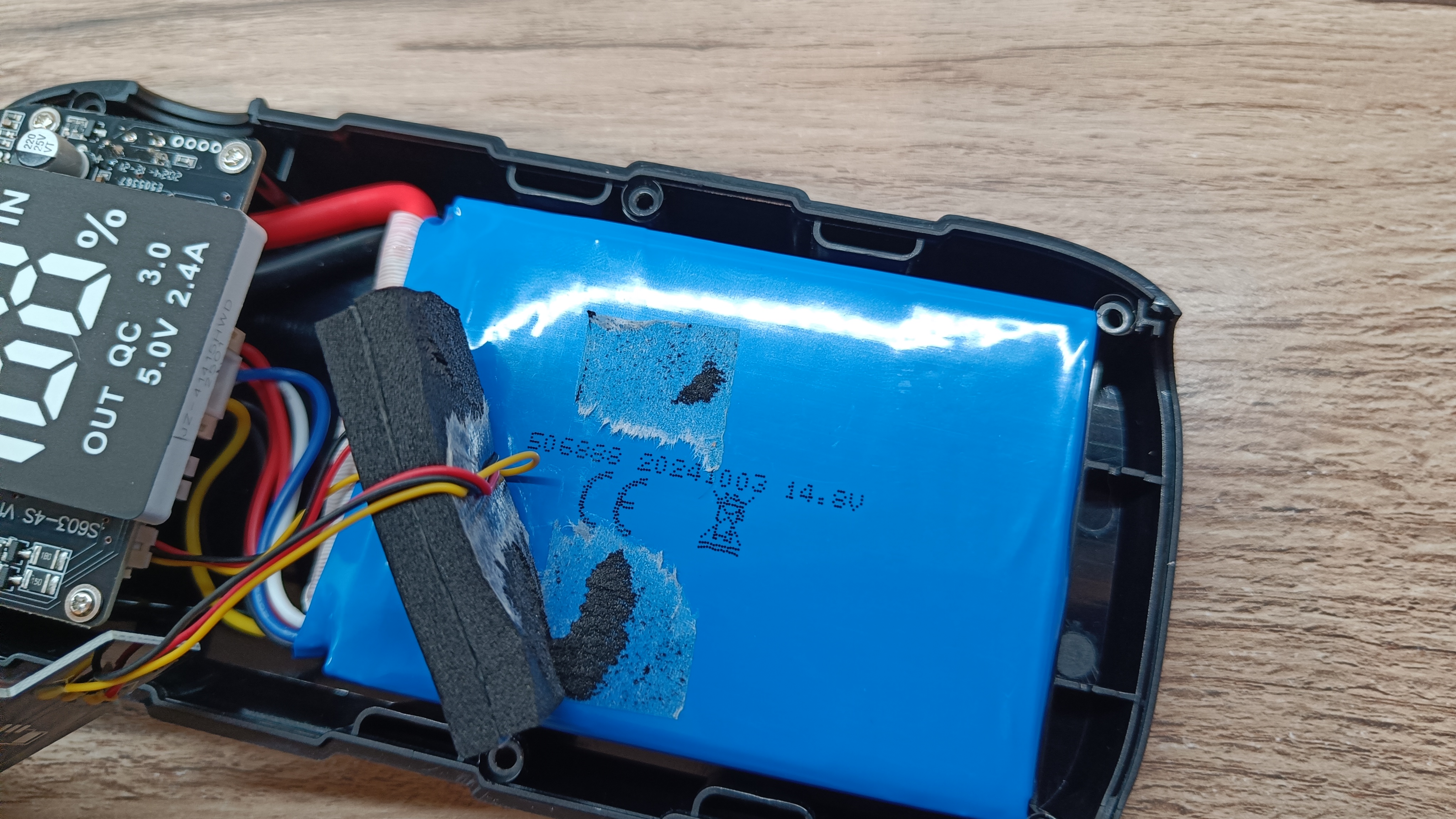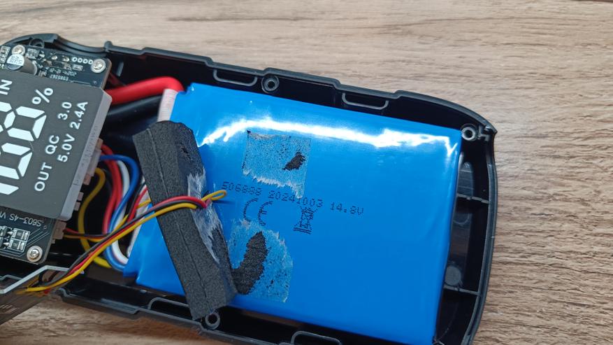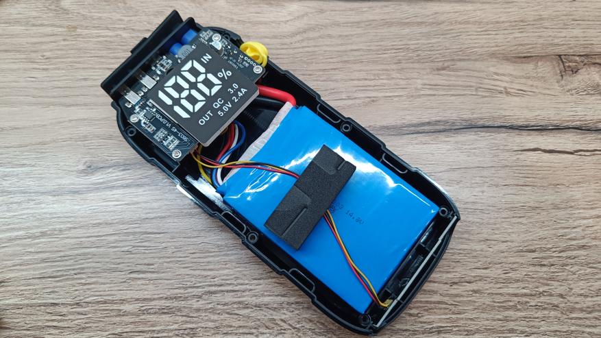 Заглянем внутрь основного корпуса. Разобрать несложно, так как половинки удерживаются на 6 саморезах. Внутри можно увидеть большую сборку аккумуляторов, которая занимает более половины корпуса. К сожалению емкость сборки не указано на термоусадке, а есть только рабочее напряжение в 14,8В. На сборке есть термоконтроль, а вся распайка сделана с использованием силиконовых проводов.