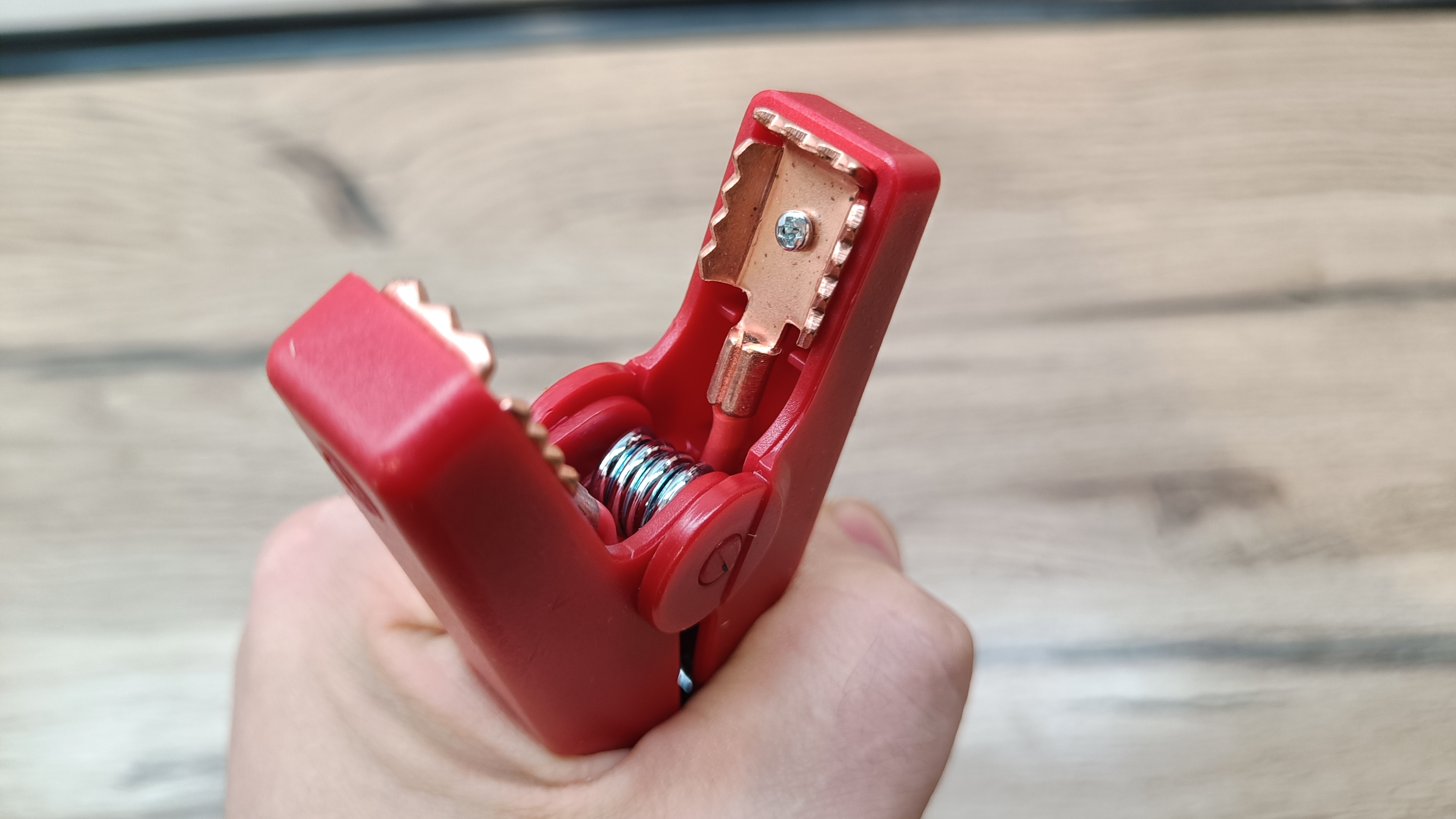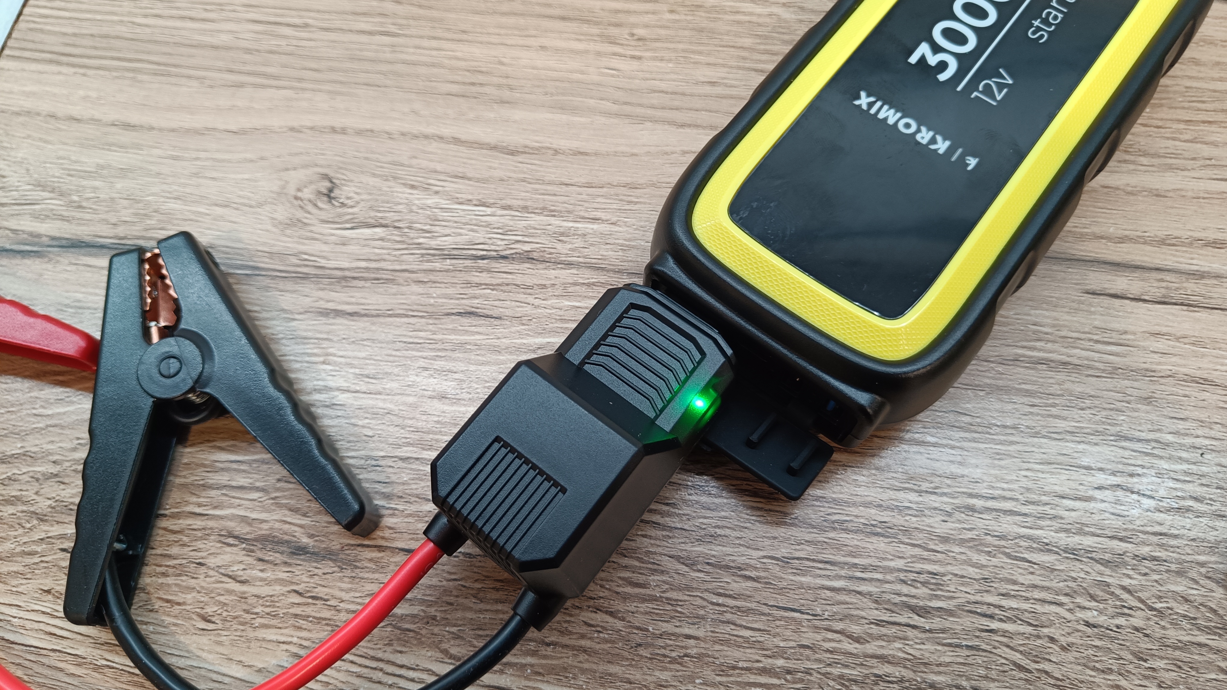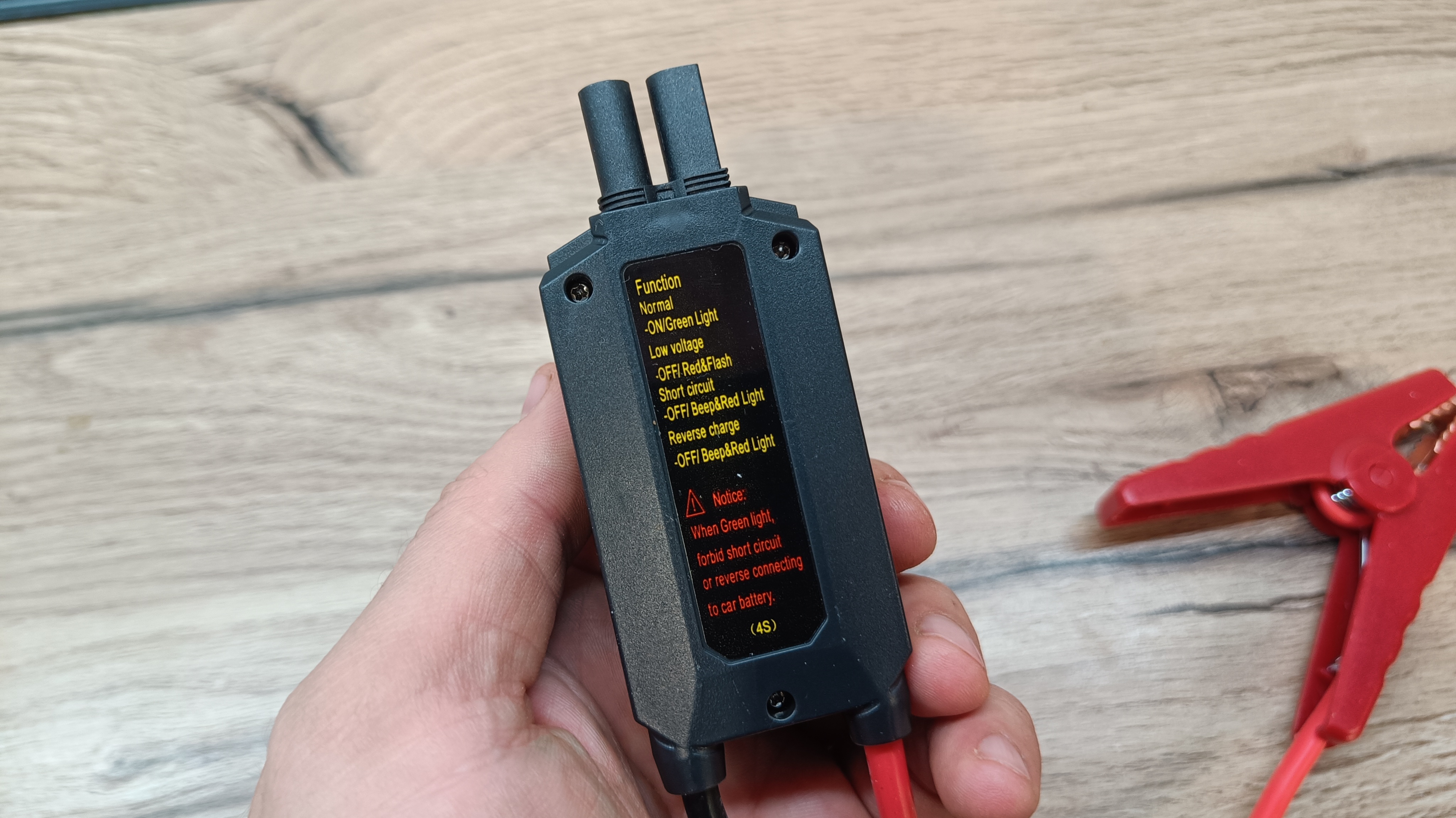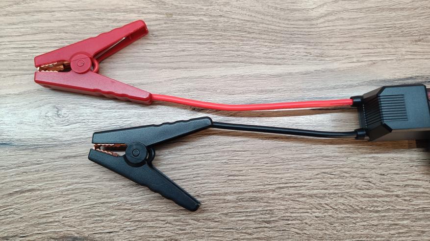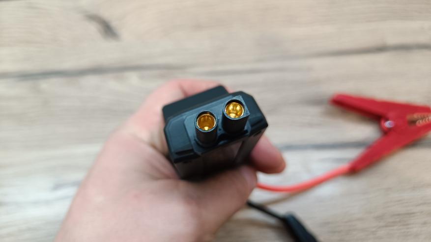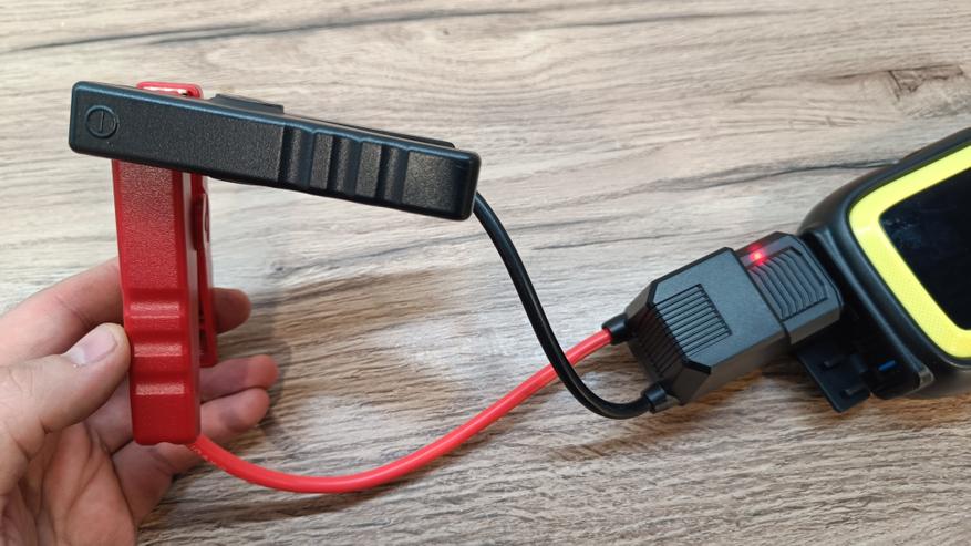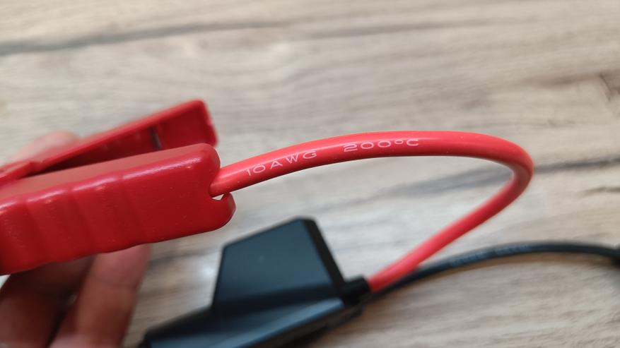 Смарт провода выполнены с силиконовой оболочкой. Поэтому, они не дубеют на улице при минусовых температура, что лично проверенно во время тестов. На конце два «крокодила» с двойными контактами и выполнены из немагнитного материала. Если приглядеться, то можно увидеть, что губки соединены перемычкой, а значит пятно контакта имеет большую площадь. Сечение жил проводников по европейскому стандарту 10 AWG, что составляет чуть более 6 мм2. Смарт провода выходят из блока защиты и индикации. На корпусе во время работы можно увидеть светодиодную индикацию зеленого и красного цвета, а также звуковые сигналы предупреждающие об возможной опасности.