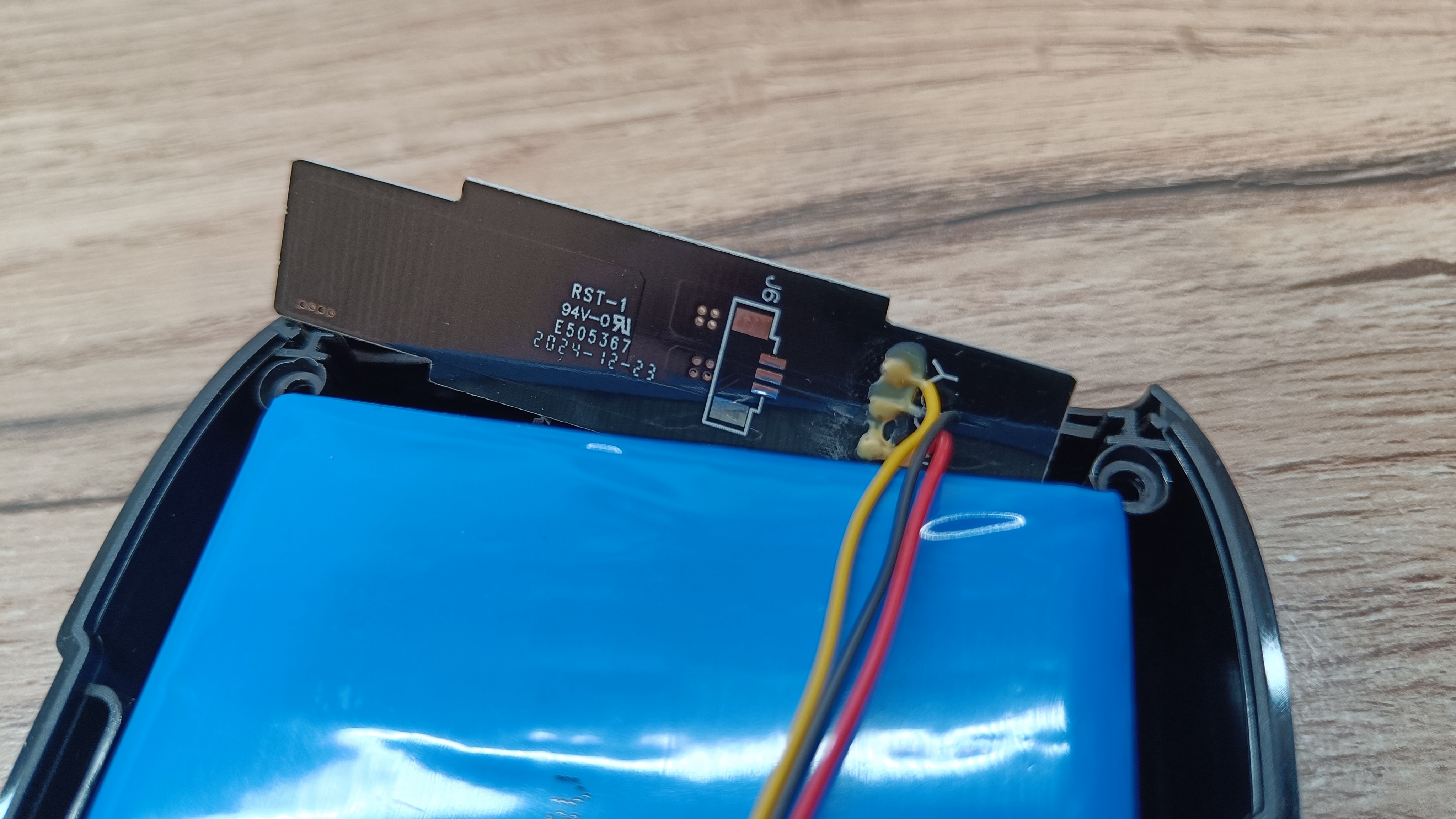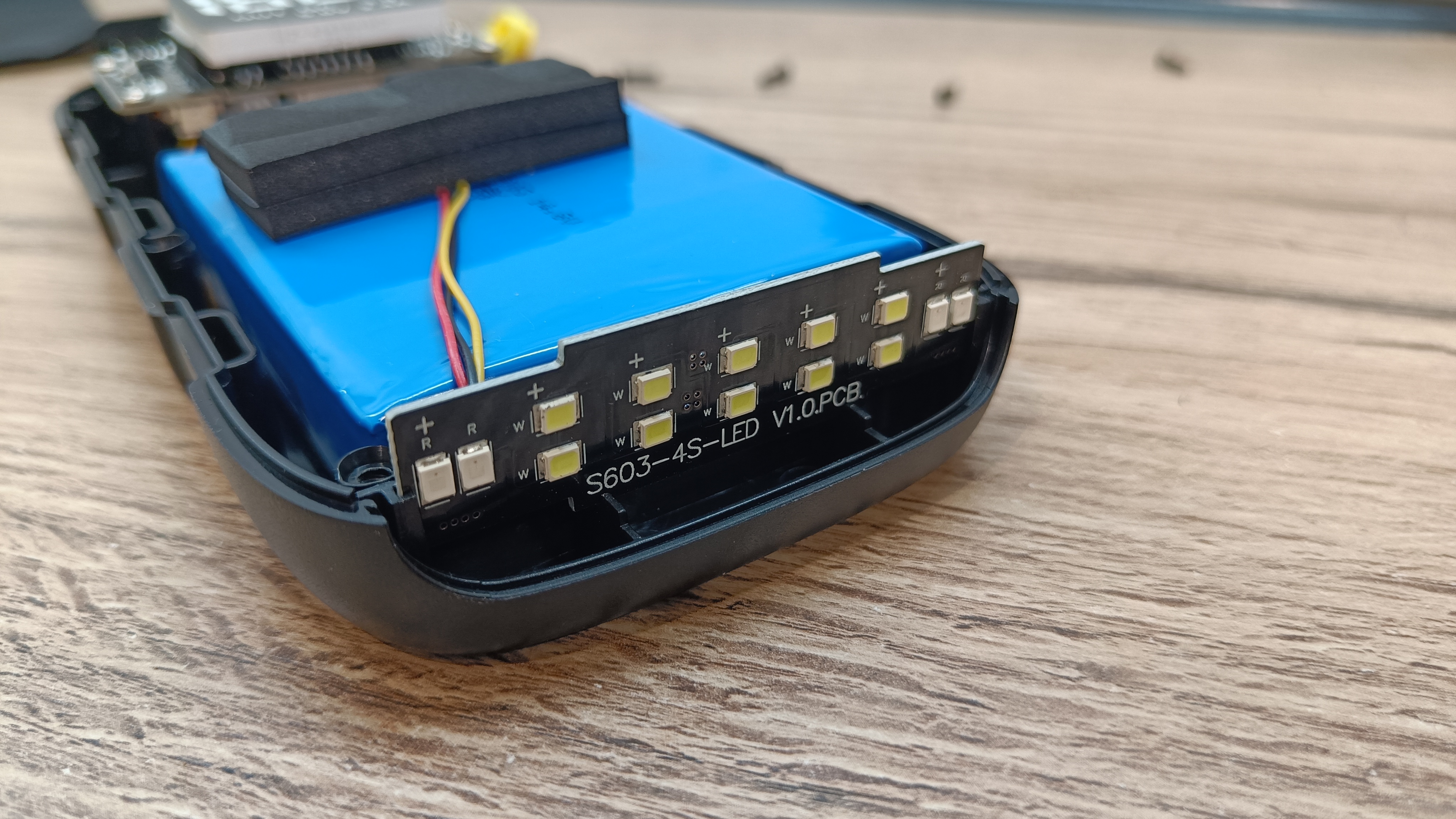 Плата фонарика на отдельном текстолите. соединена проводным шлейфом. К плате соединение произведено пайкой и дополнительно залито клеем. А к основной плате соединение сделано уже на клемник.
