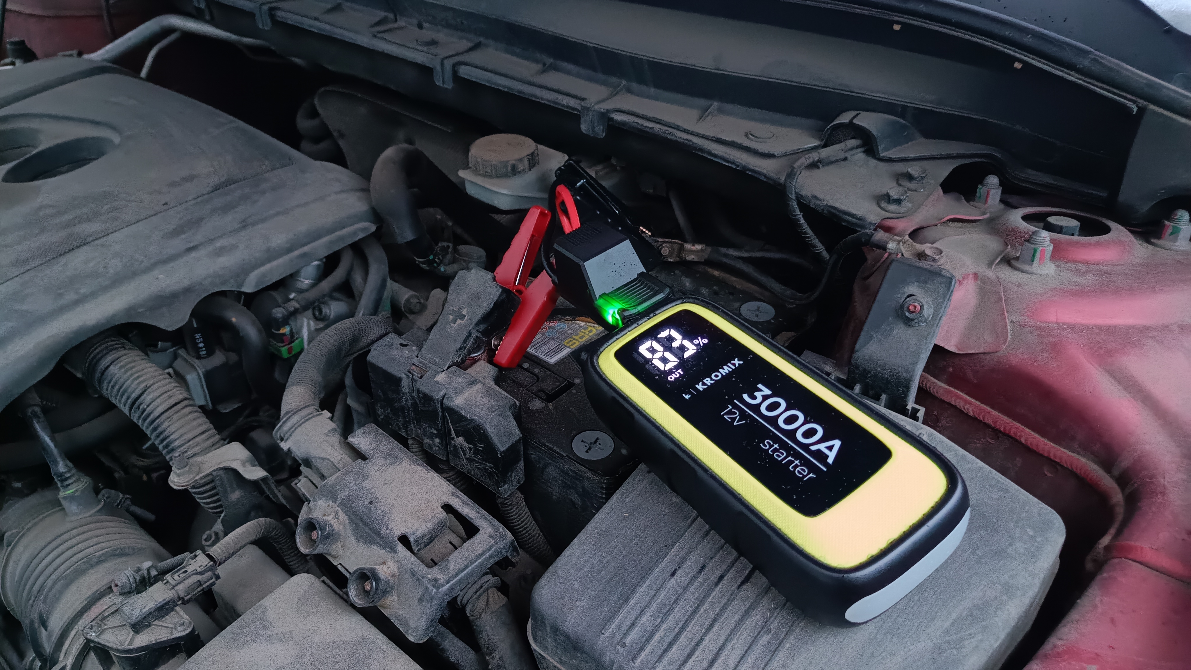 Подключение элементарное. Сначала соединяем смарт-провода и ПЗУ. Затем соединяем клеммы аккумулятора и крокодилы. Многие рекомендуют зацеплять «-» крокодил не на аккумулятор, а на корпус автомобиля. Но мне удобнее именно на аккумулятор. Сразу после включения Kromix HELPER на экране высветилось значение в 83%, при том, что он был только что полностью заряжен.