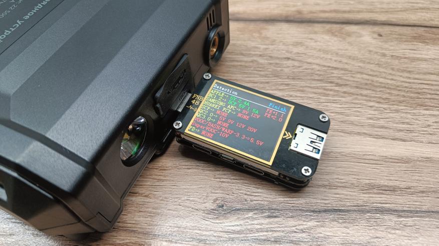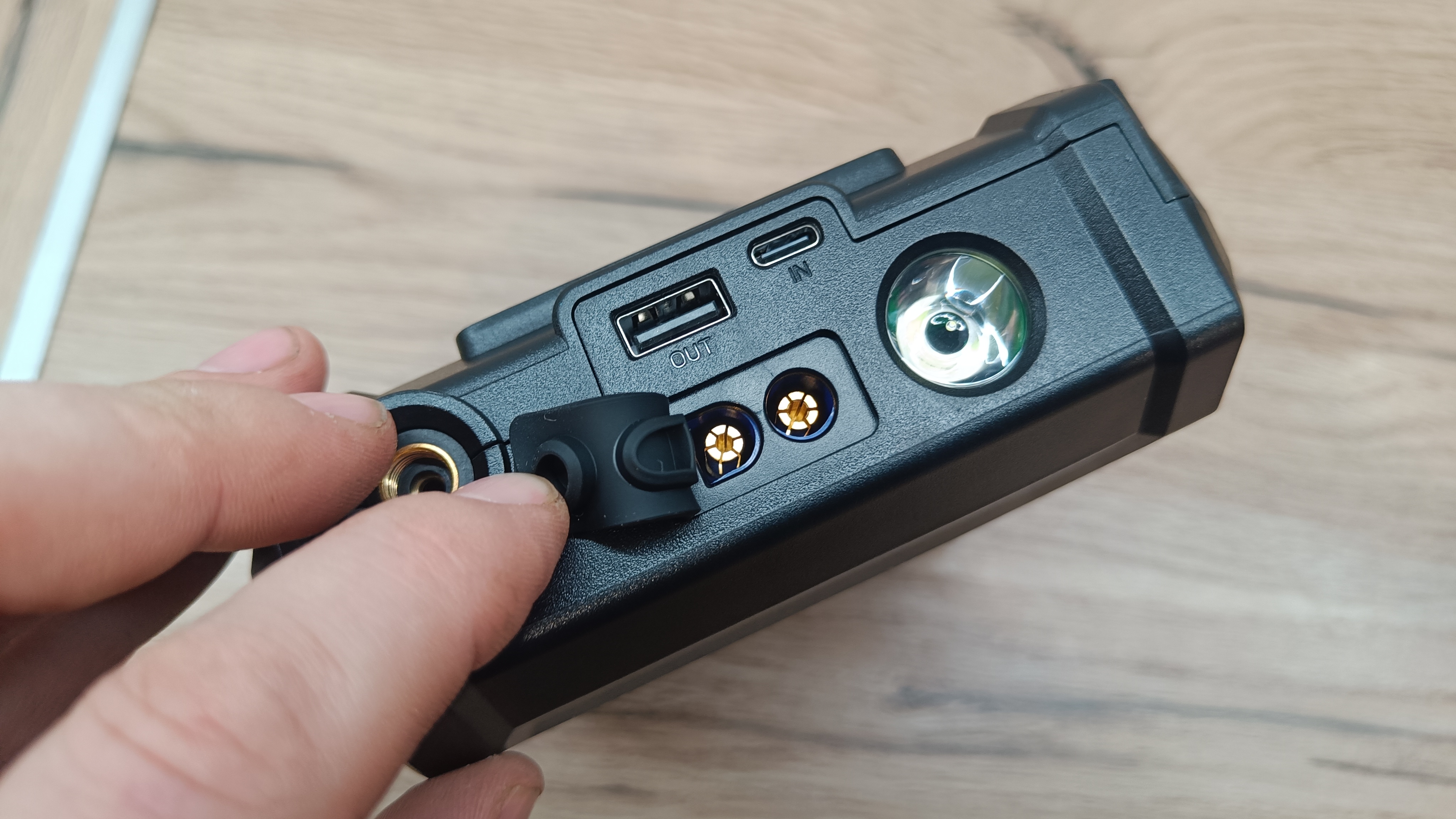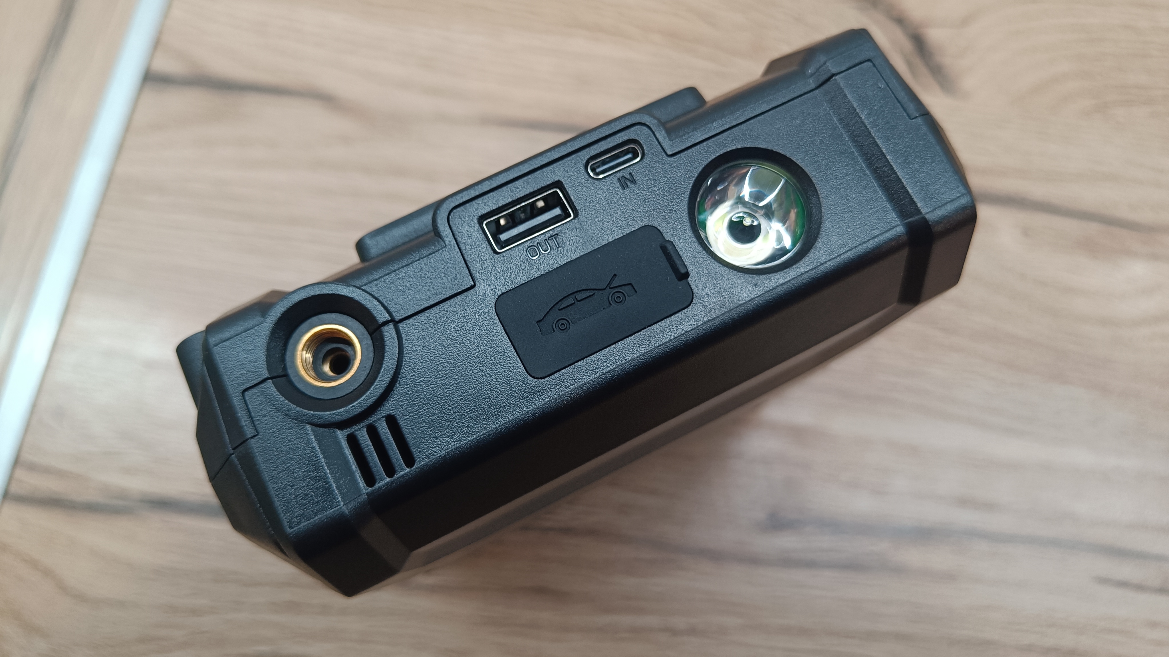 На верхней грани устройства разместились все возможные разъемы для подключения. Это USB Type-C для заряда встроенного аккумулятора. Поддерживаемый ток до 3 А. Разъем USB Type-A для заряда других гаджетов, максимальный ток отдачи 3А с небольшим. Резьбовое соединение для использования опции насоса. Светодиодный фонарик, который работает в 3 режимах и силовой штекер для использования смарт проводов и запуска автомобиля. Он прикрыт защитной накладкой, оберегающей от попадания воды или грязи.