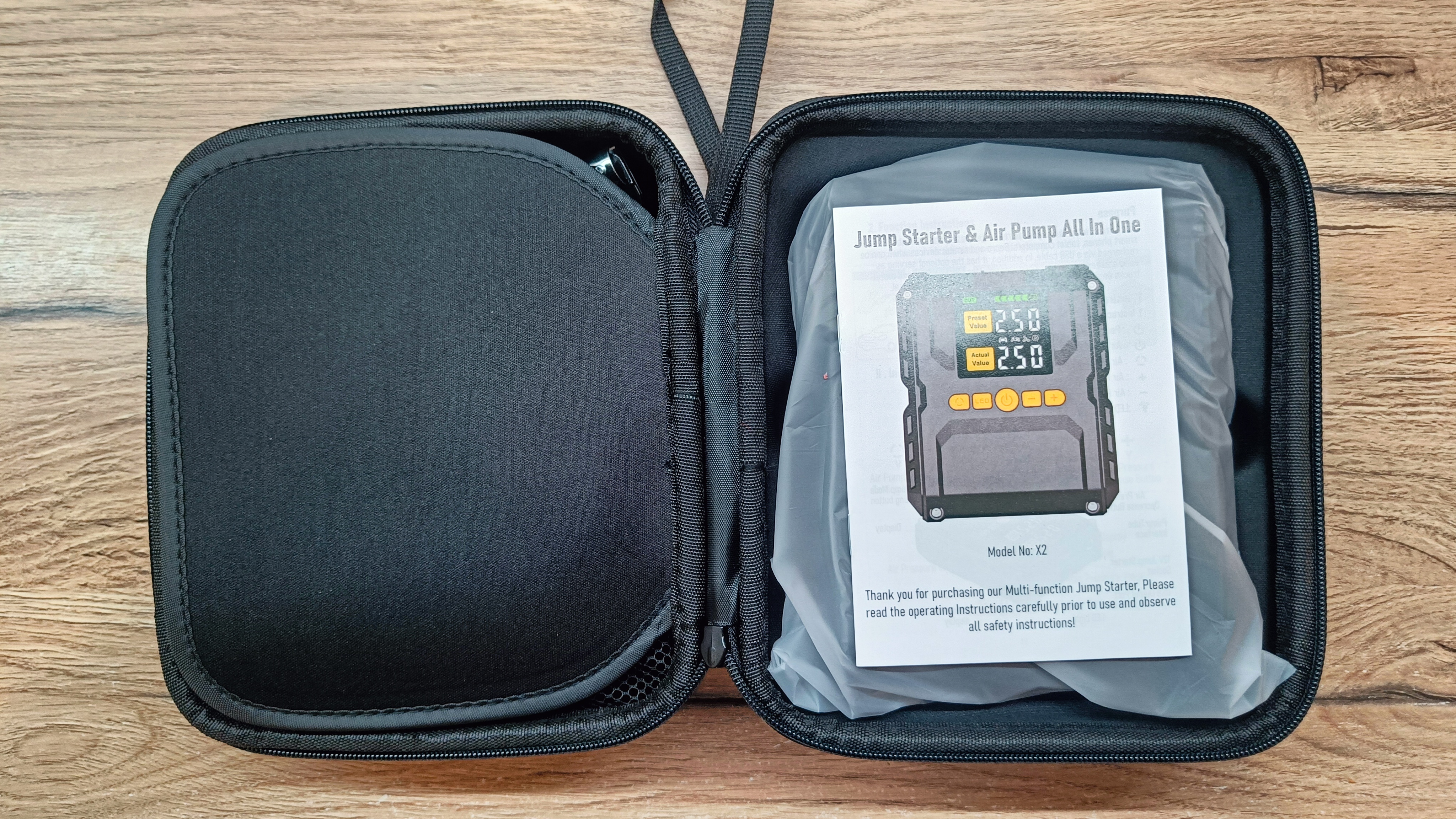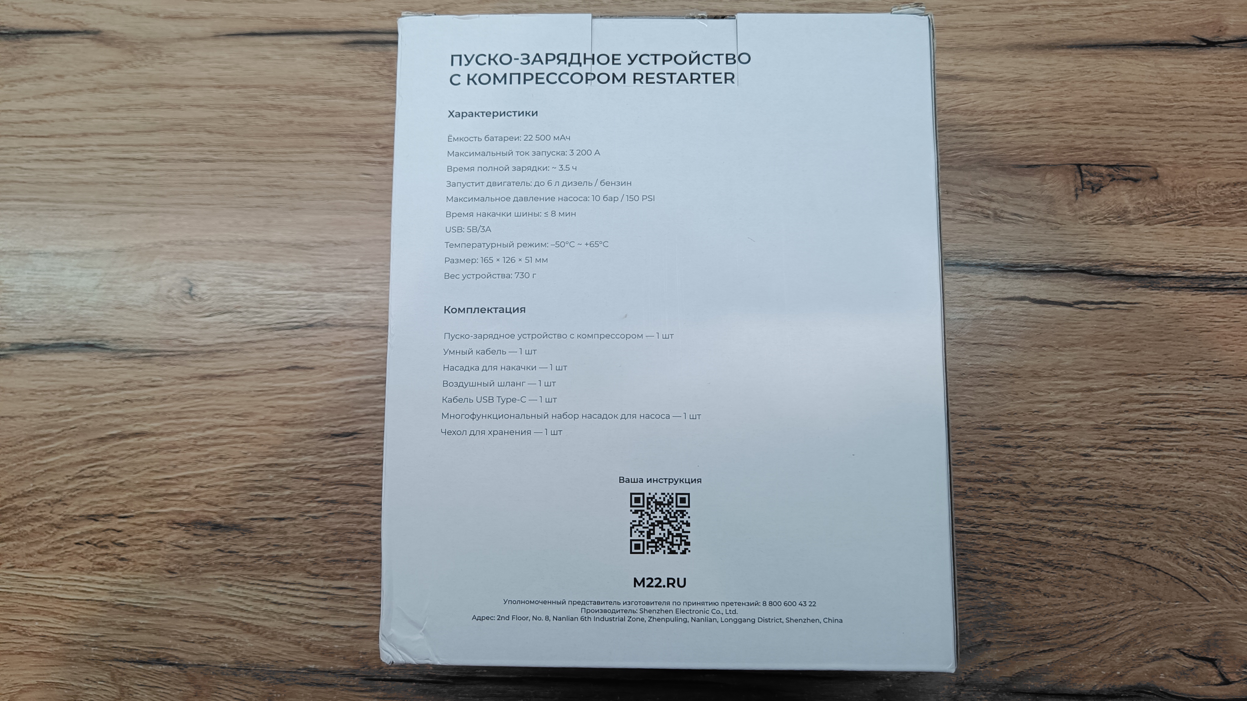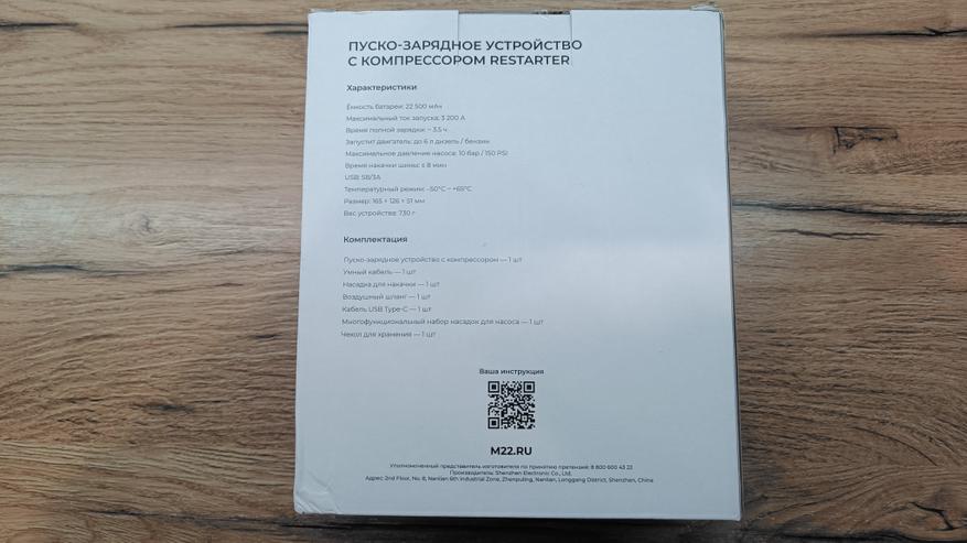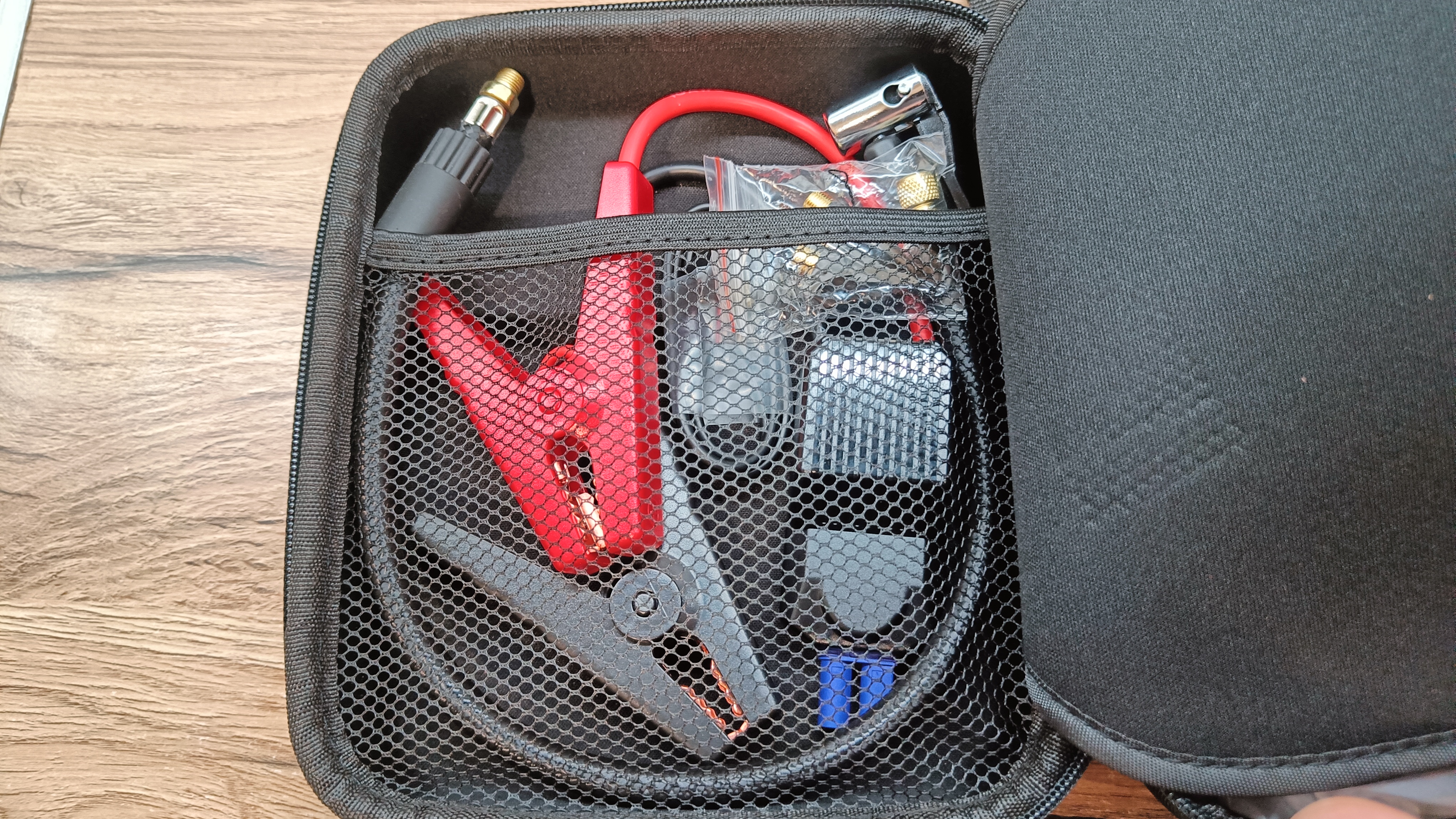 Картонная коробка с изображением устройства и кратким описанием основных характеристик с тыльной стороны. Внутри разместился плотный кофр, в котором разложена вся комплектация. Пользователю доступны силовые smart провода с «крокодилами» и блоком защиты. Съемный шланг для использования устройства в роли компрессора. К шлангу можно подключить несколько переходников для накачивания различных предметов. Также, есть провод USB для заряда встроенного аккумулятора или других гаджетов и инструкция пользователя.