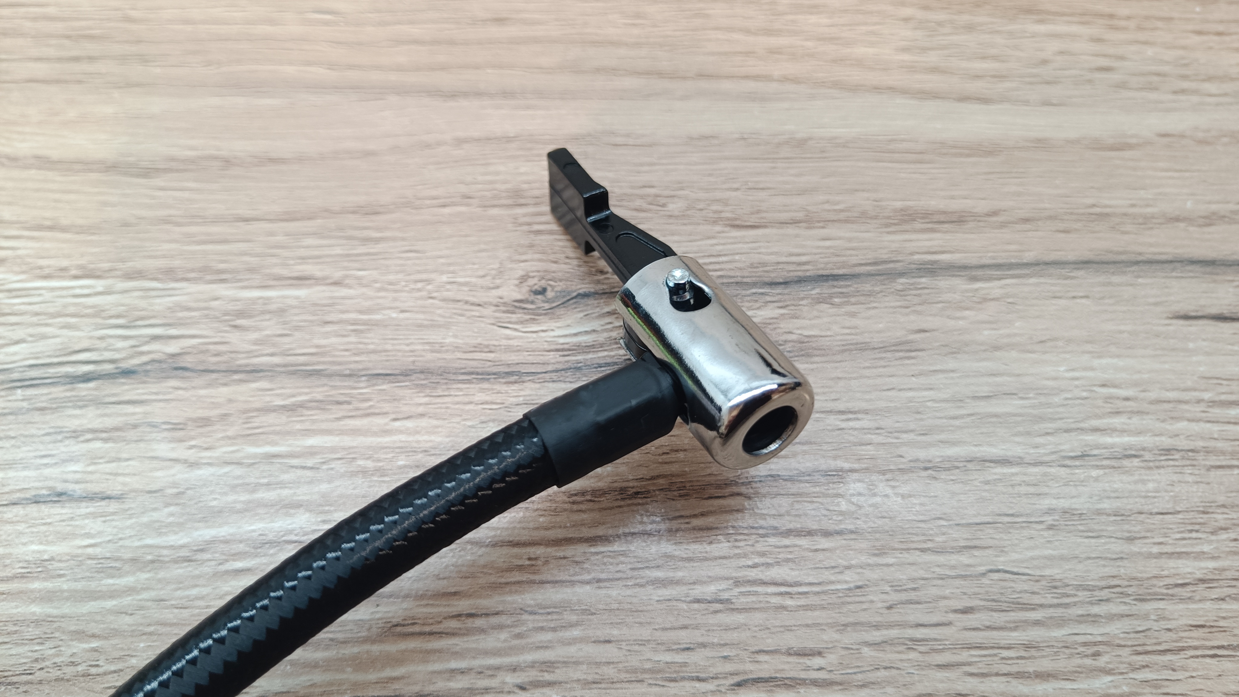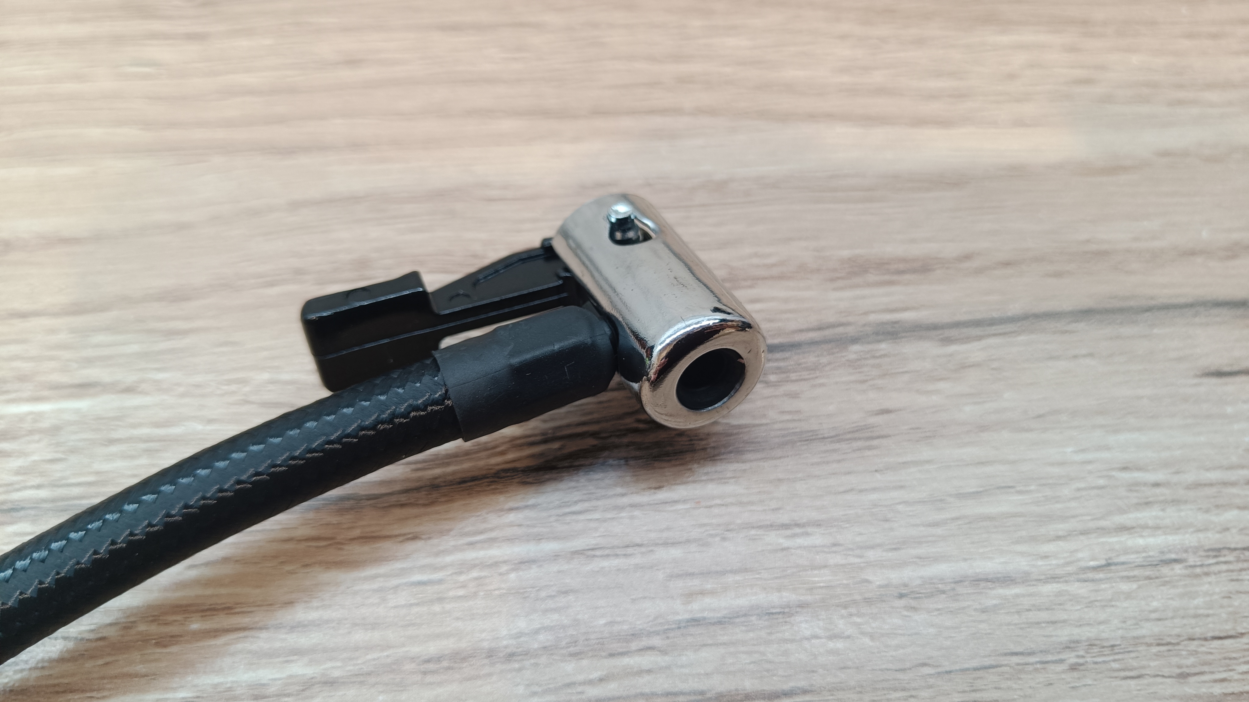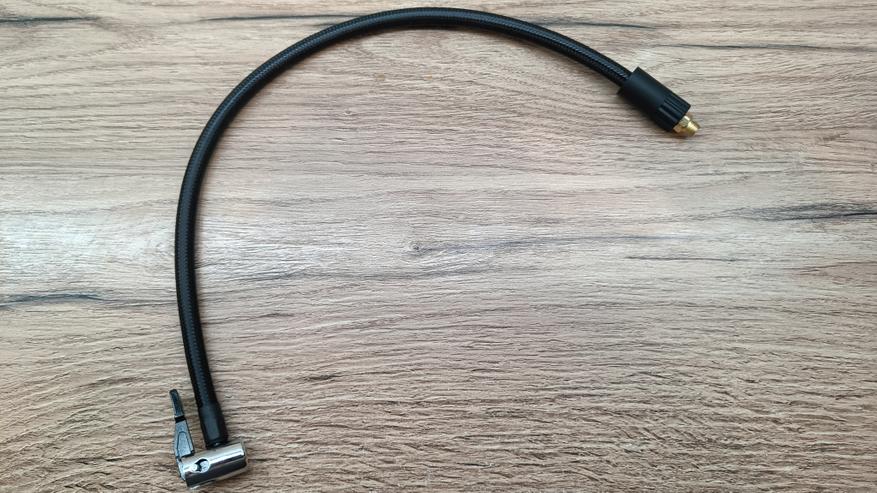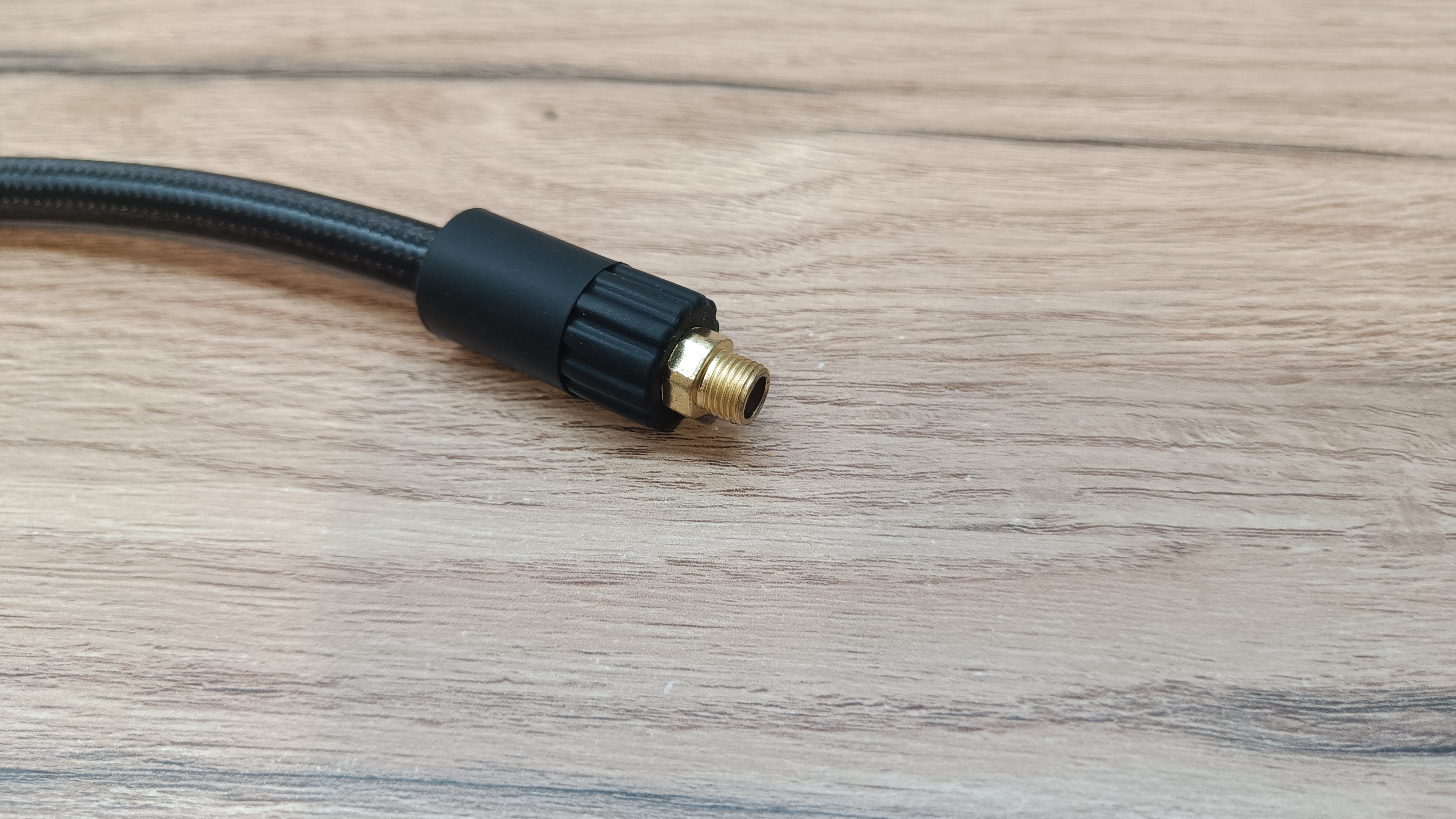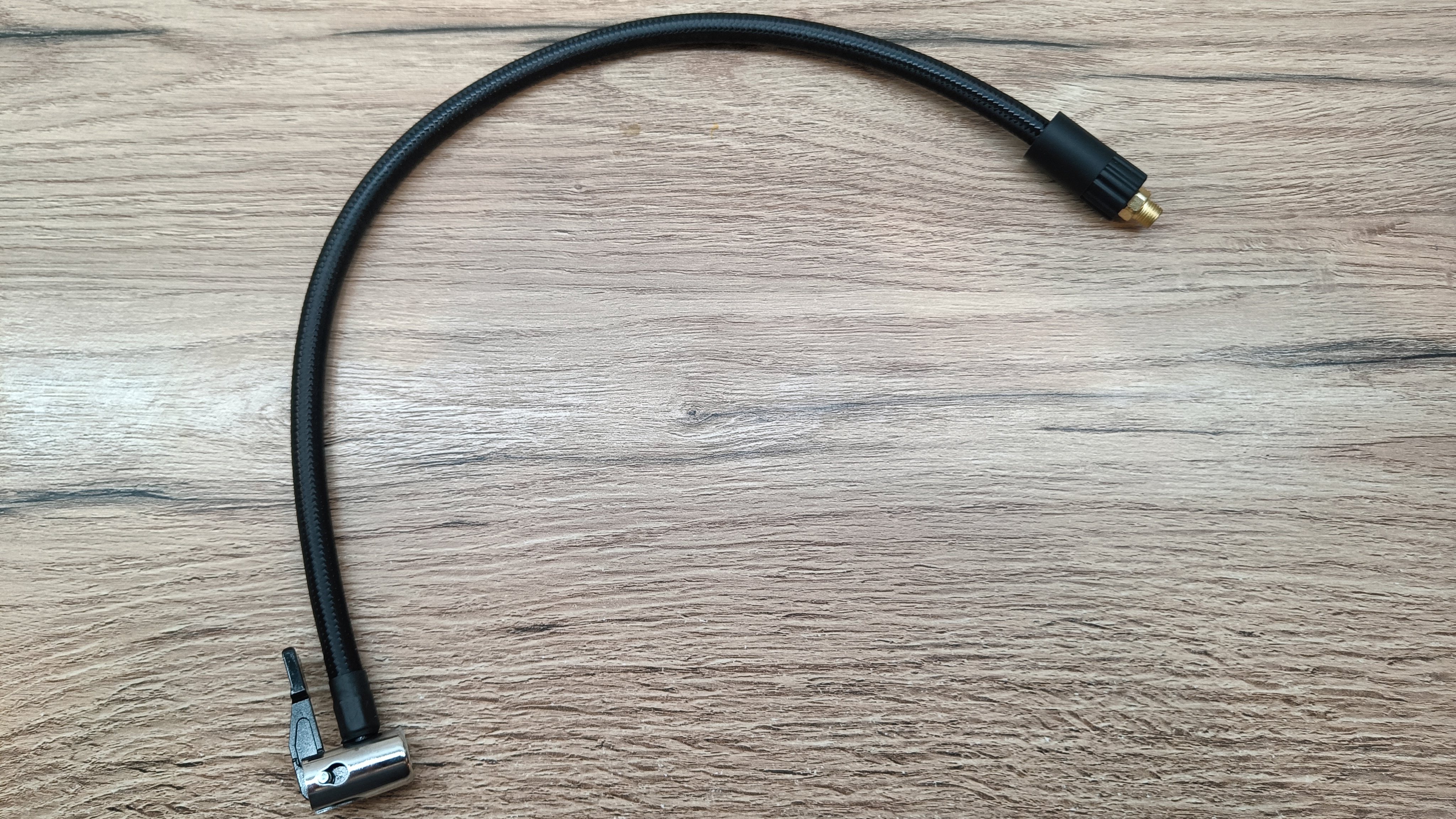 Шланг в нейлоновой оплетке. Длина 450 мм, что позволит удобно подключаться к колесу, мячу или матрасу. На конце быстросъемный коннектор. С обратной стороны резьбовой фланец из латуни с силиконовой рубашкой.