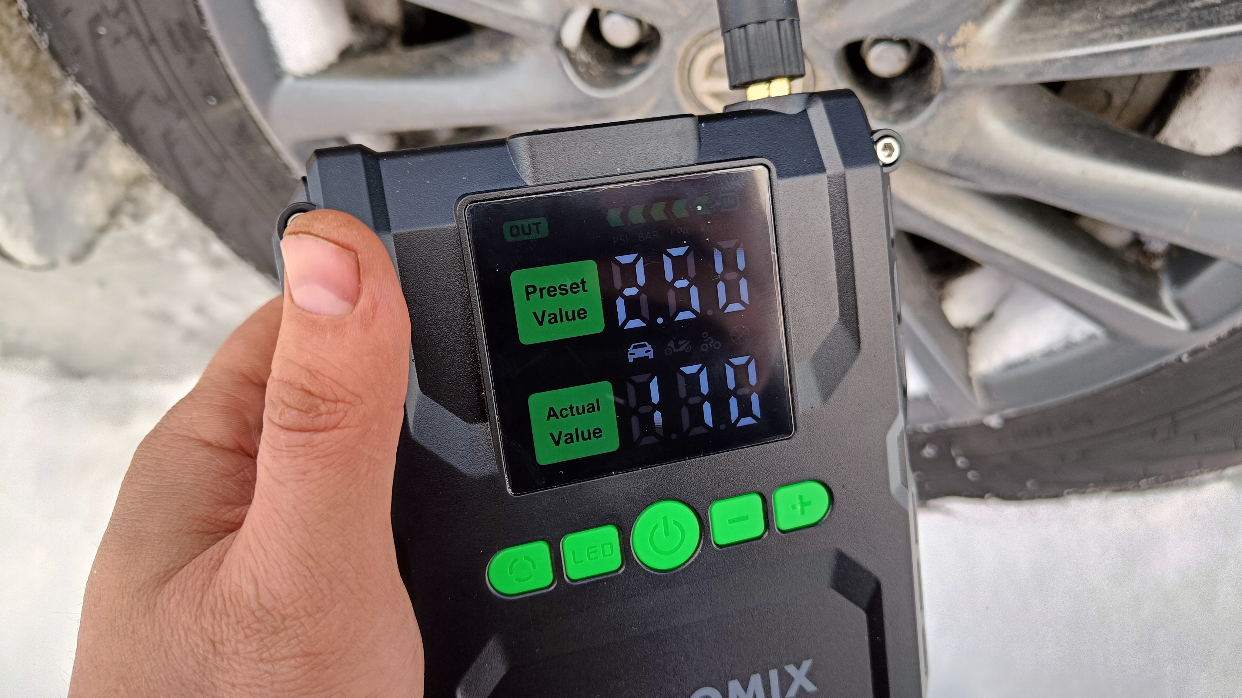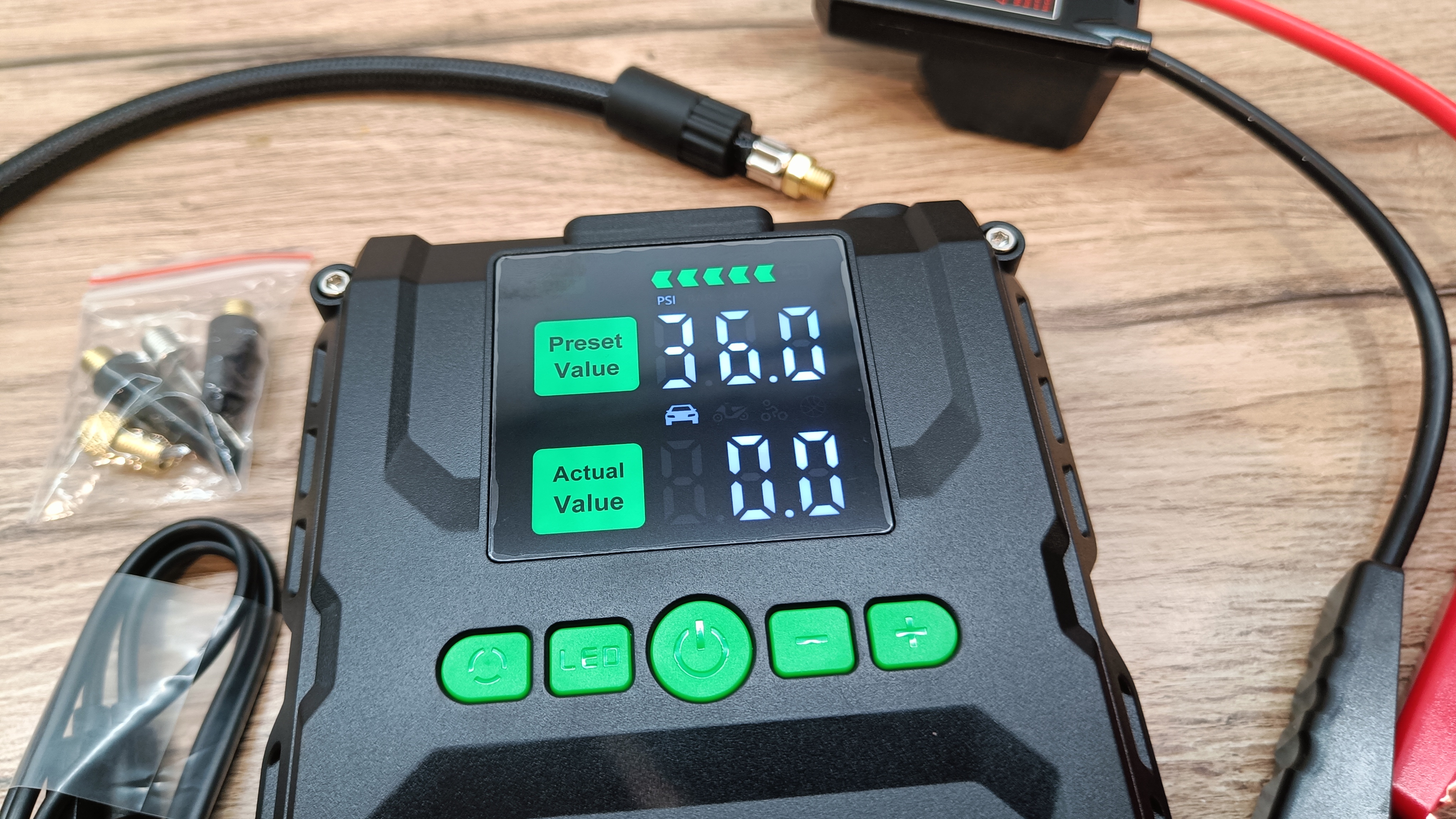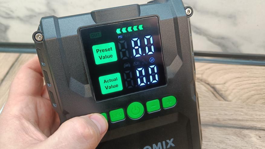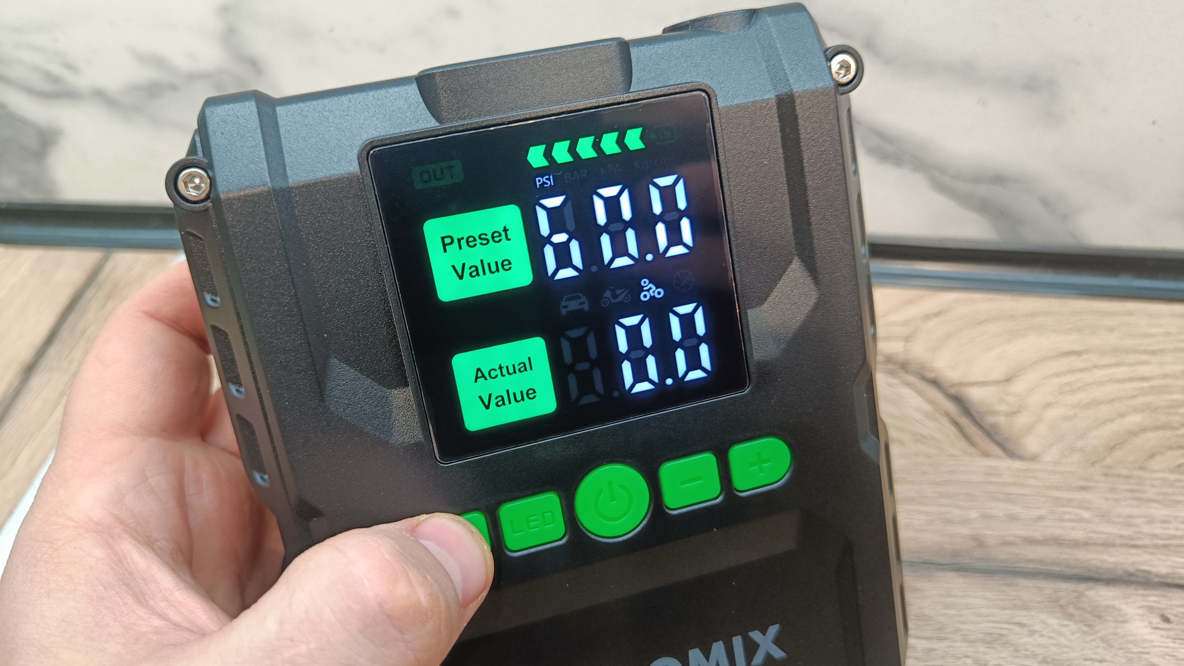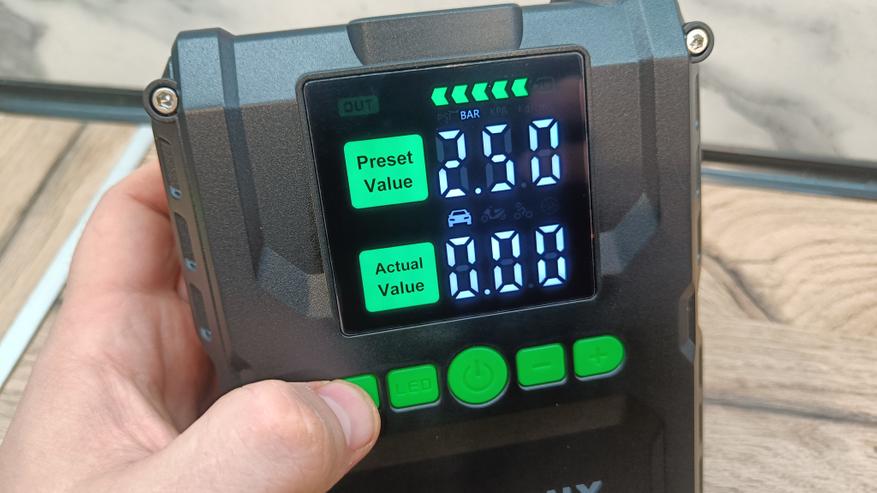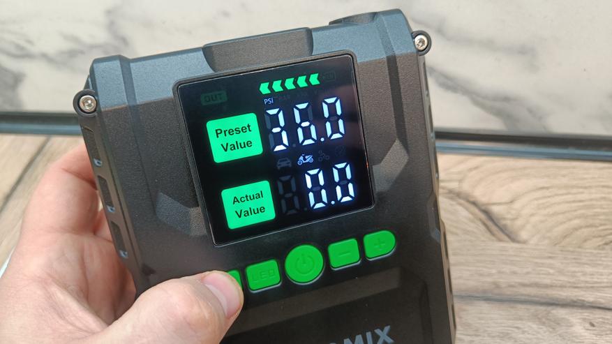 Для управления устройством предусмотрено 5 кнопок. Центральная для включения и запуска насоса. Крайняя левая клавиша позволяет выбрать необходимый режим работы из 4 возможных: автомобиль, мотоцикл, велосипед и мячи. Каждый режим имеет свое предустановленное давление, которое в дальнейшем можно изменить в зависимости от используемой резины или характеристик надуваемых устройств. Встроенный компрессор имеет электронный контроль давления, что сразу же выводится на экран для удобного контроля.