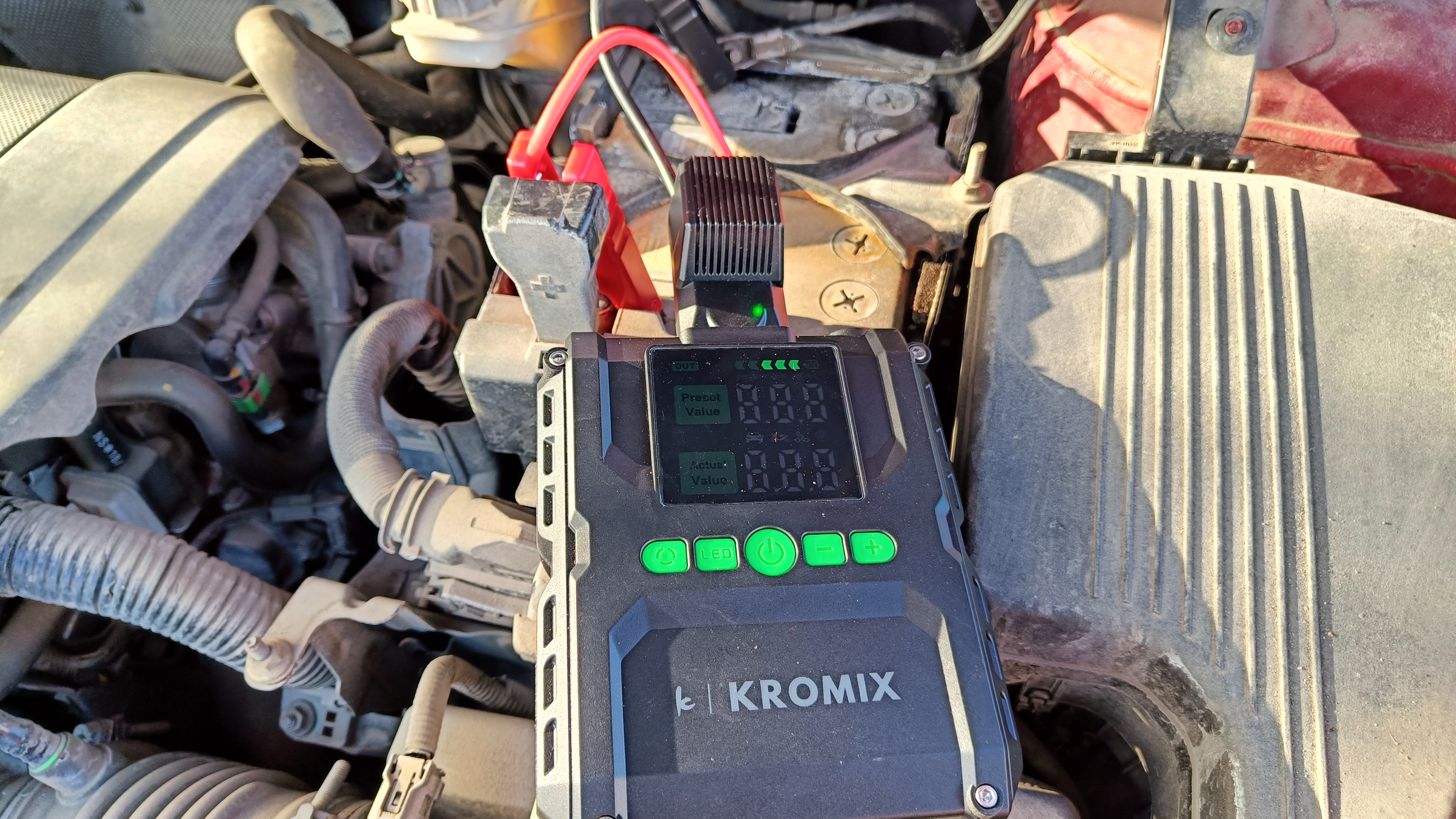 Устройство 4 в 1, но основное предназначение у Kromix Restarter именно запуск двигателя, когда основной аккумулятор отсутствует или полностью разряжен. Судя по инструкции, устройство может запустить различные автомобили с бензиновыми и дизельными двигателями объемом 6 литров. Емкости встроенного аккумулятора хватит на несколько запусков, но многое зависит от состояния автомобиля. Запуск двигателя лучше всего проводить при отключенном дополнительном оборудовании, что позволит сосредоточить пусковой ток. Подключаем смарт провода к бустеру, после чего последовательно подключаем «крокодилы» к положительной и отрицательной клемме аккумулятора автомобиля. При не соблюдении полярности загорится красный светодиод, что будет показывать ошибку. Запуск двигателя возможен лишь при зеленой индикации на смарт блоке.