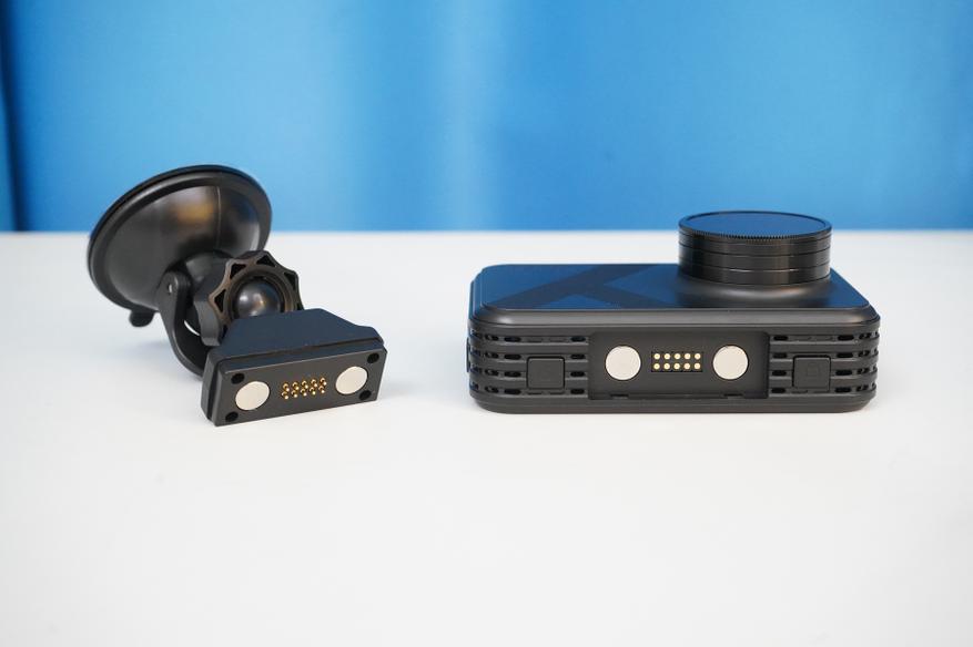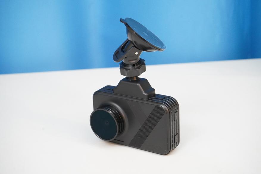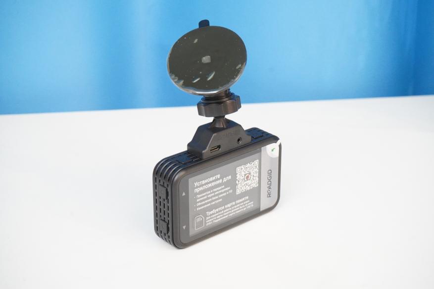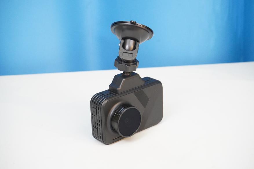 В качестве крепления к лобовому стеклу используется составной кронштейн с присоской/скотчем. То есть подвижная часть с шарниром допускает установку как на один тип основания, так и на другой (оба в комплекте). Шарнир обеспечивает не только повороты корпуса регистратора в стороны, но и наклоны для выбора удобного угла обзора. Стоит отметить, что на кронштейне фиксируется корпус видеорегистратора с помощью пары магнитов. Подача питания, а также работа дополнительной камеры обеспечивается набором электрических контактов.