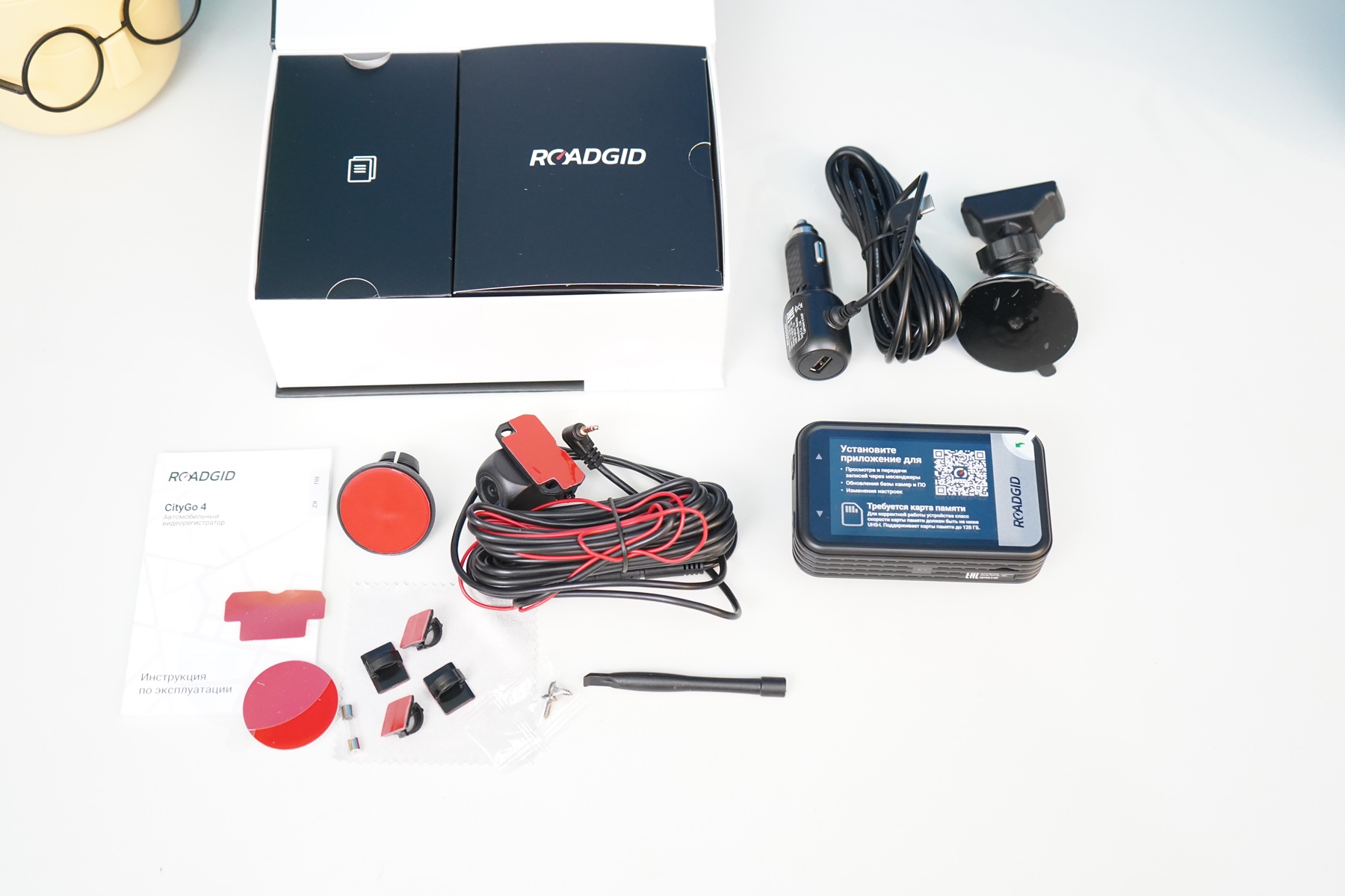Комплект поставки CityGo 4 2CH от Roadgid позволяет установить видеорегистратор и сразу же приступить к его использованию. В коробке был не только блок питания, но и два типа крепления к лобовому стеклу, дополнительные клейкие стикеры, клипсы для кабеля, инструмент и инструкция. Отмечу в этой комплектации заднюю камеру с длинным проводом подключения.